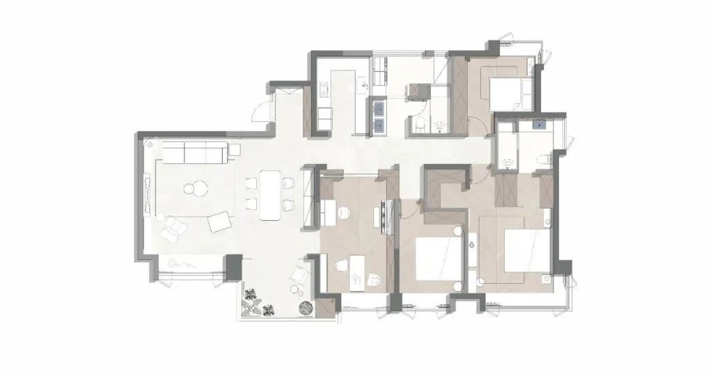 原始结构分区较为不明,特别是生活阳台、次卫、保姆房以及过道,空气流通极差,动线不合理。而面积也存在主卧过于大,次卧逼仄的不均问题。 1.客厅景观阳台纳入,设计为与客餐厅空间连接的多功能休闲空间 2.紧邻餐厅卧室拆除部分墙体,改造为半开放式琴室、书房 3.走廊右侧,重新整合划分厨房、生活阳台、保姆房、次卧布局,使其动线合理,面积分配均匀 4.释放主卧套房部分面积,在保证使用需求的基础上,分划出一间次卧位置