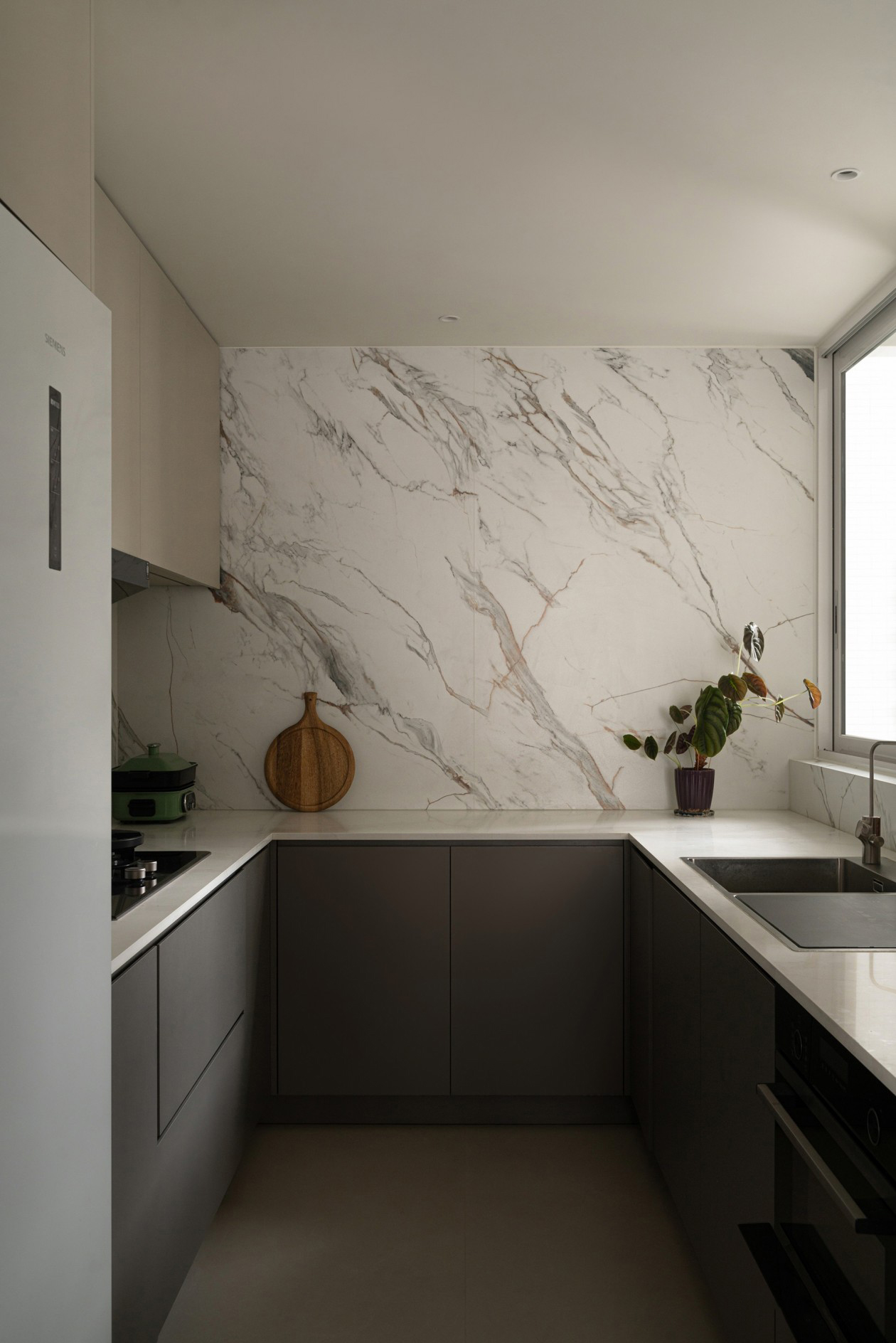 二手房中,厨房与生活阳台、保姆间互相连通,动线不合理,且空气流通极差。拆除次卧,将面积均分于公共区域,重新规划布局后,独立厨房。空间本无光源,于阳台一侧开窗,借由自然光线引入。