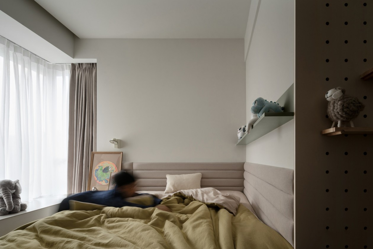 儿童房也获得部分面积得以扩大,同时满足睡眠与储物需求。床边布置软包,给予孩子最强的舒适与安全。局部饰以可随意挂取玩偶的木质洞洞板,以及置物架,发挥自己的想象力,创造出属于自己喜欢的可爱世界。