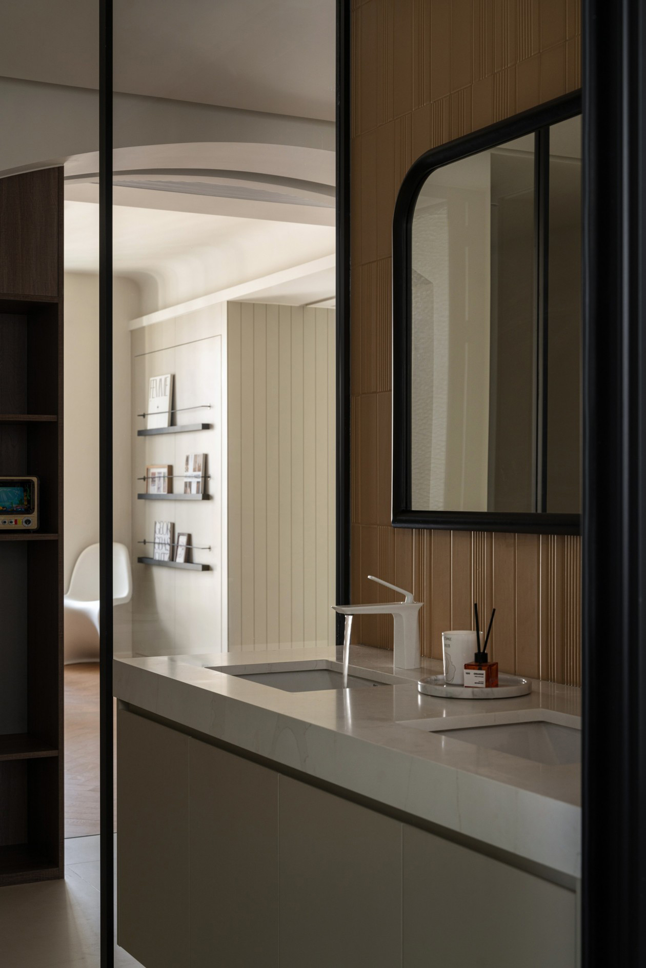 次卫原本面积较小,且需绕过厨房、保姆间才能到达。设计改造后,横向扩大空间,拆除隔墙,干湿分离。干区释放于走廊,玻璃隔断,与公区形成连接,并以此借光,充分优化原始结构缺陷。