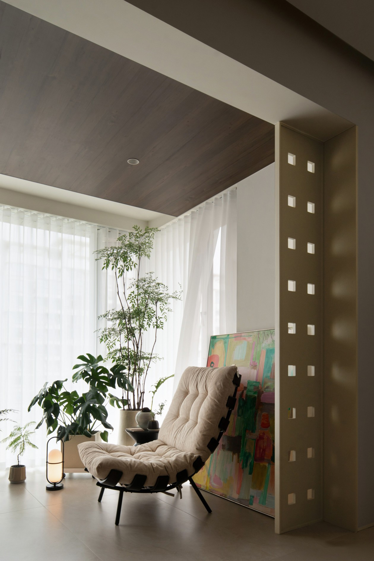 原始景观阳台纳入,为室内引入更丰沛光线的同时,设计为可种植植物、聊天放空、阅读小憩的室内休闲空间。 两侧新建400mm小方形镂空隔断,游走间,便能收获别致的光影效果。同时也使该区域在使用时,拥有半包围的安全感受,既独立又能感知内与外的互通联结。