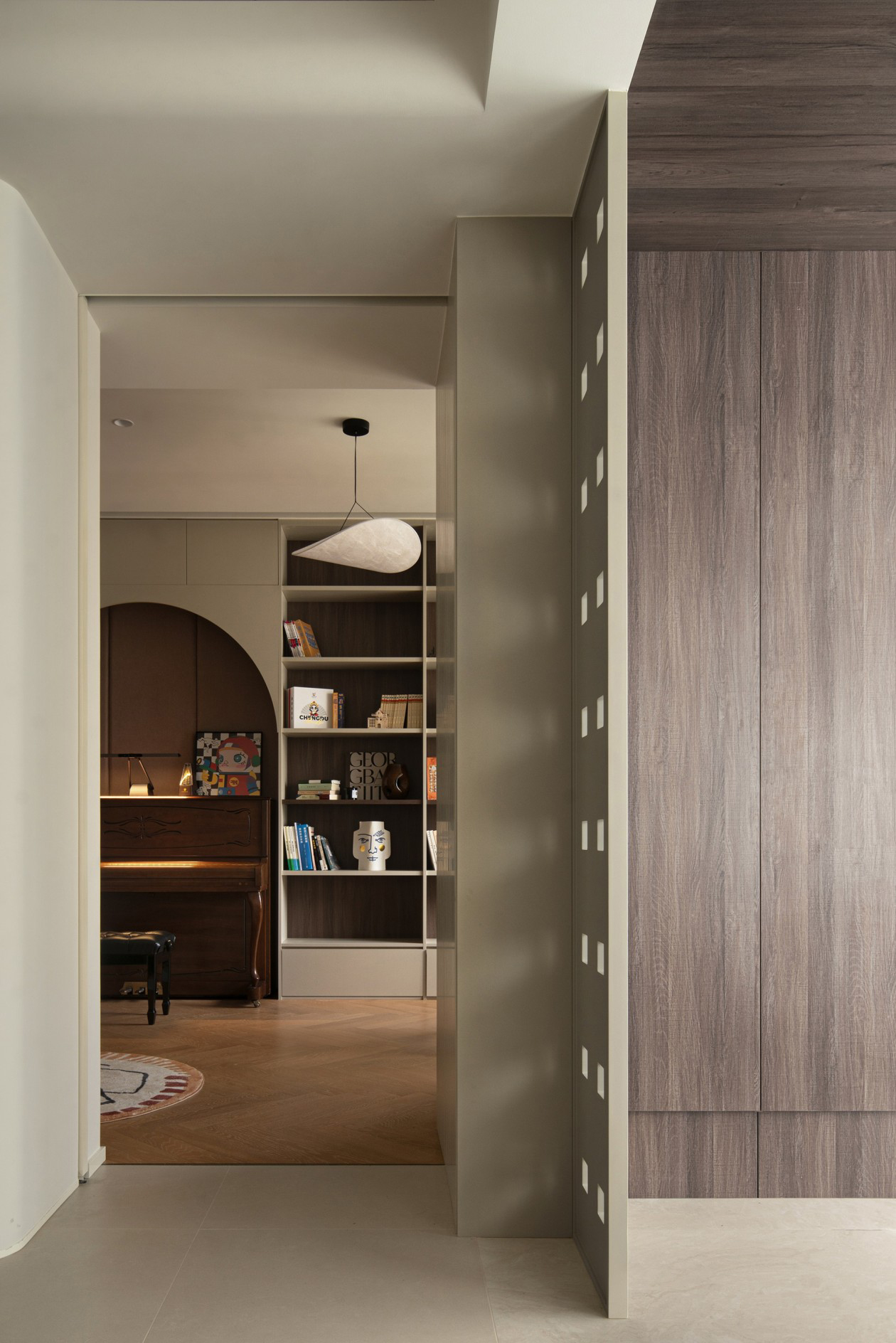 原始走廊封闭,光线暗淡。拓宽距离后,开放一侧书房墙体,另外加上一侧厨房、卫生间的改造后,变得开阔、明亮。为此区域刻意营造游走动线里的别致端景,布置乐高展示架,将生活里对手工的热爱一一陈设于日常的视线当中。而从过道端部游走于客厅方向,视线底端处布置向下低垂的Artemide Falkland吊灯,让人一眼聚焦的同时,充分强调由视觉而发的纵向张力。
