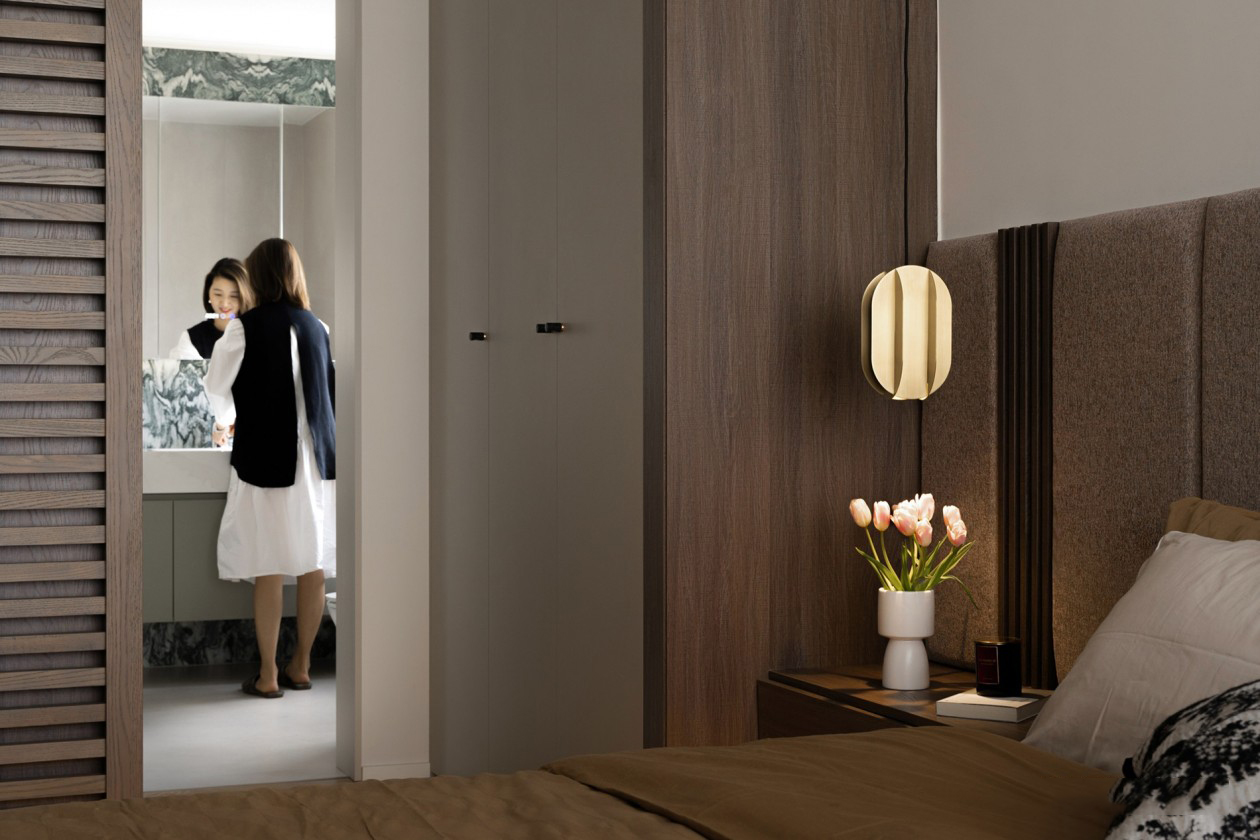 利用木格栅推拉门将卫生间隔开,互相独立的同时,两处区域不会感到过于闭塞。绿野仙踪岩板作为主题背景,本身自带的纹理效果浸润出自然丰富的艺术形态,完整呈现出一个富有感染力的生活场域。