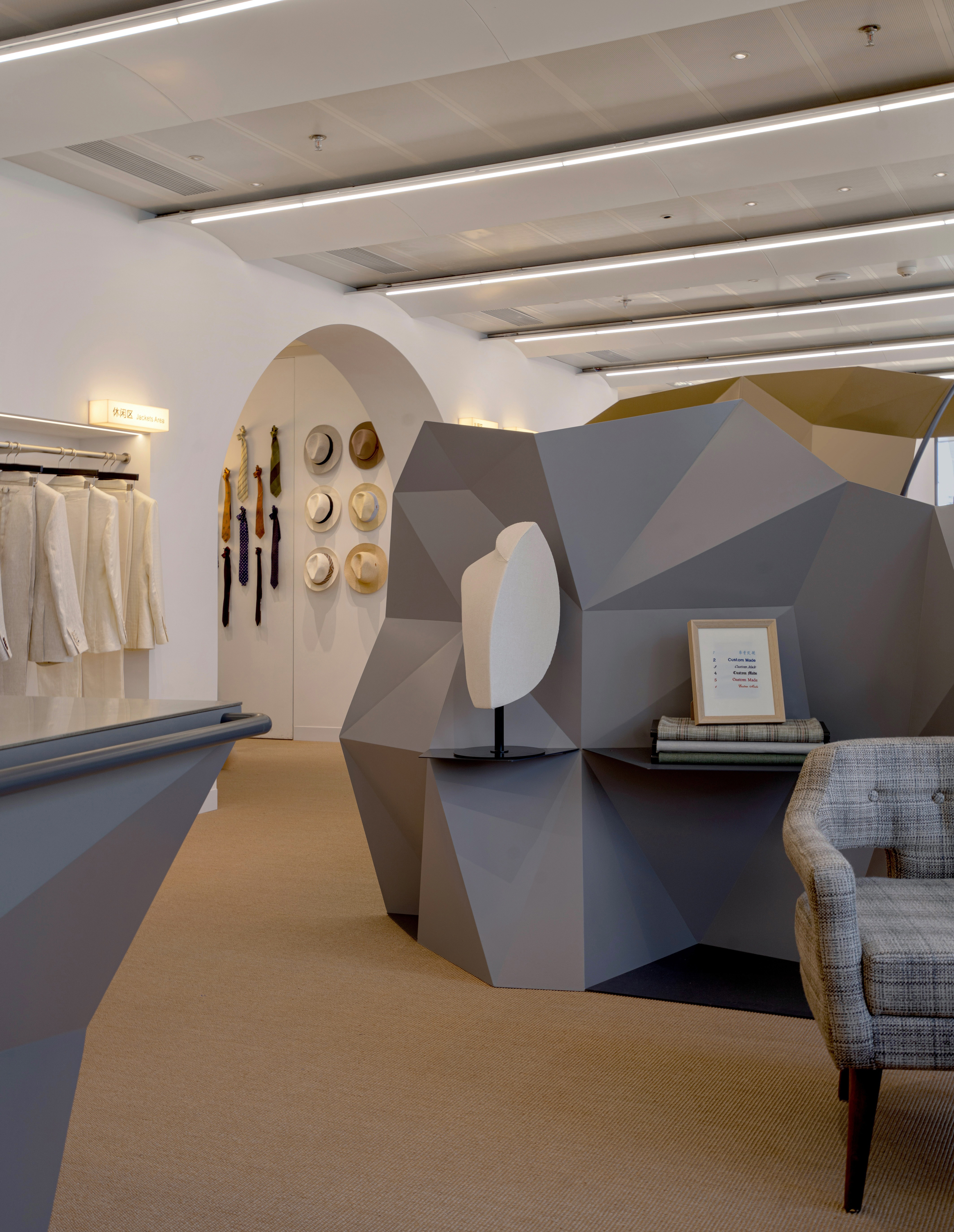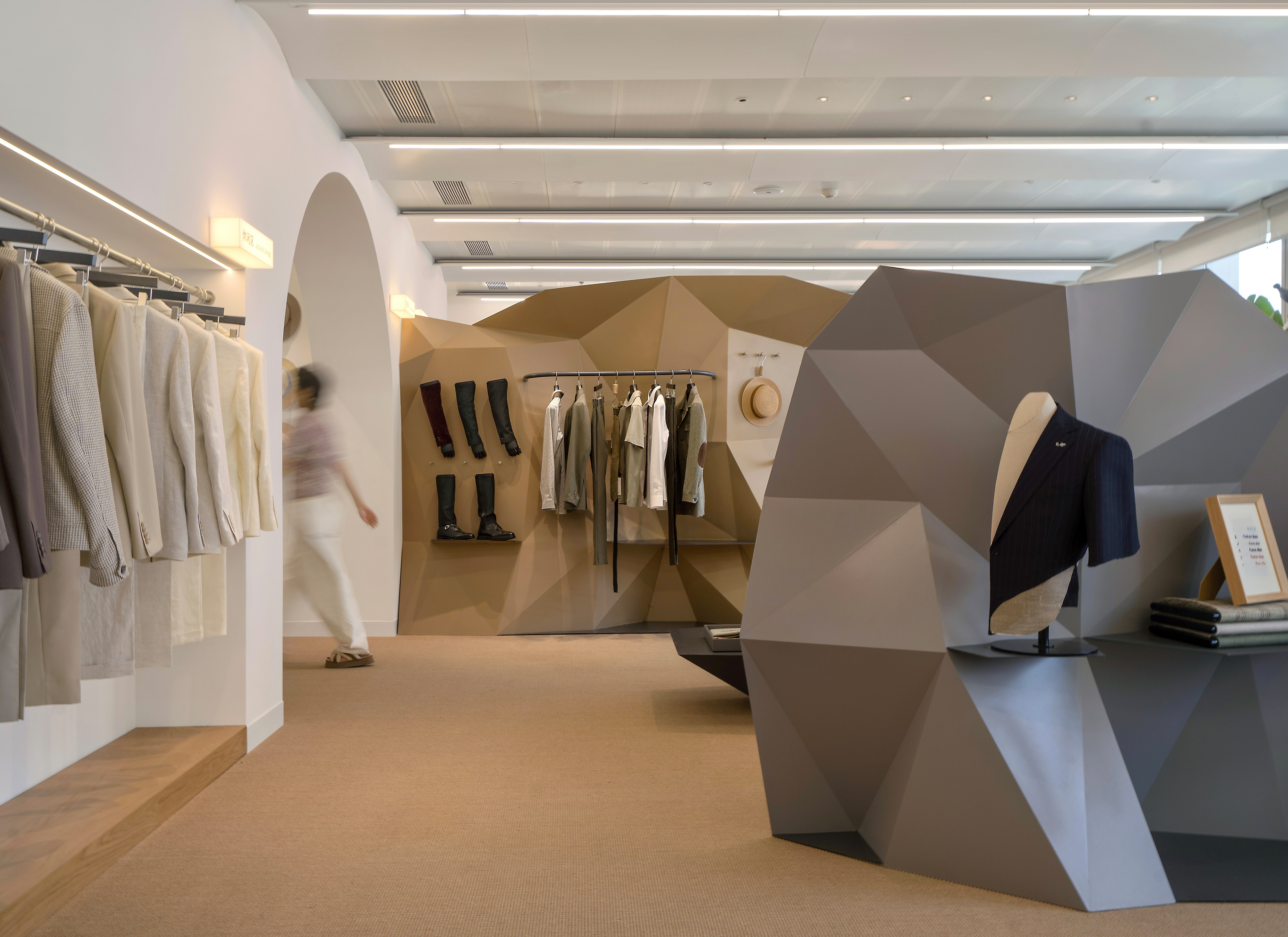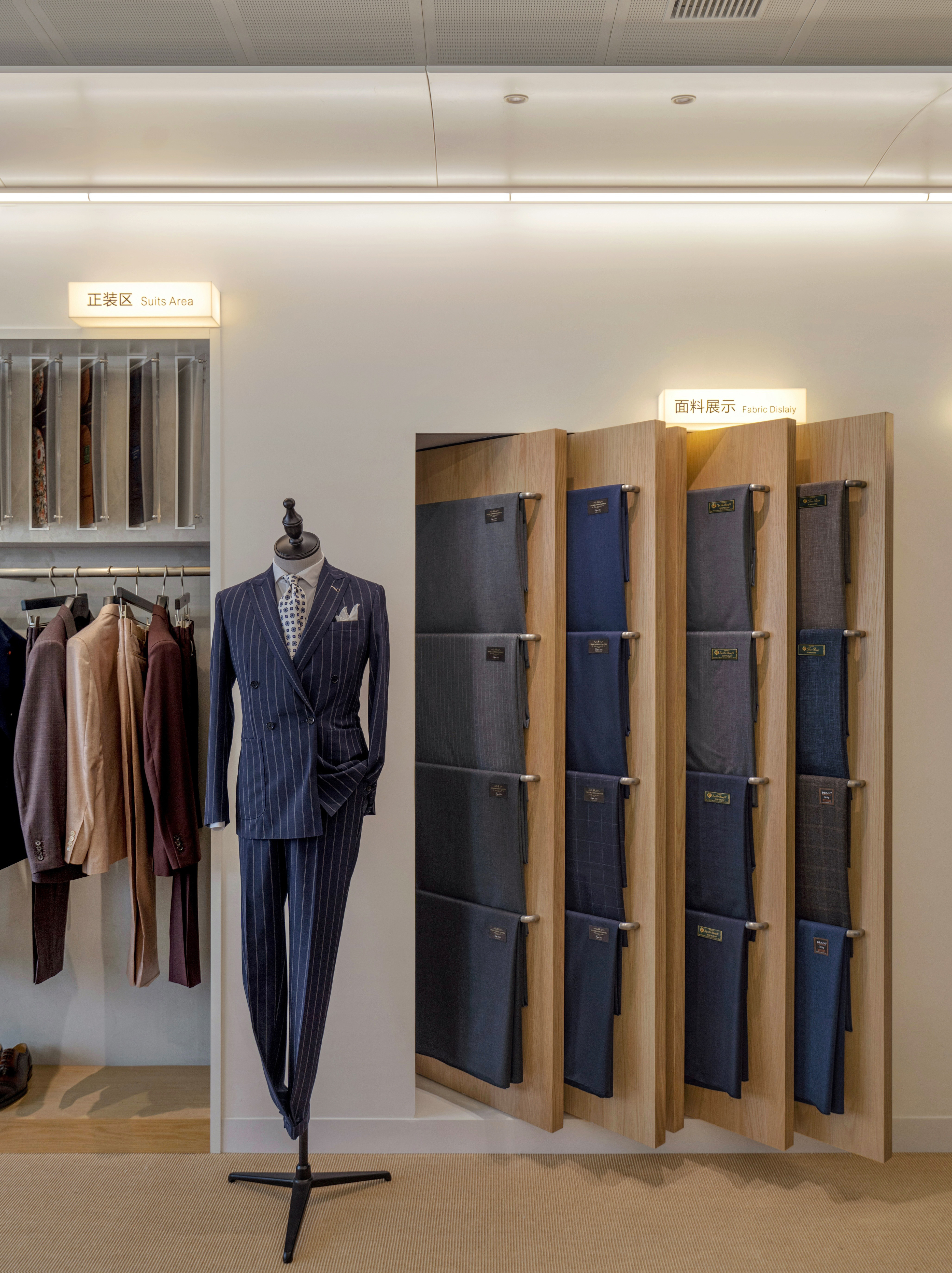 ▲室内空间 Interior Space————我们在具体的陈列上也做了进一步的产品展示设计。原本在定制店的展示内容中,只有衬衫有分解陈列的领型袖型墙。而西装的展示只有成衣展示,但西装才是定制店的主体。所以我们设计了这样的西装分解展示,我们把它称为:“爆炸结构”。 We also refined product display strategies. Traditionally, bespoke shops only deconstructed shirt elements (like collars and cuffs) for display, while suits—the core product—were shown only as finished garments. To address this, we designed a deconstructed suit display, which we call the "Exploded Structure."