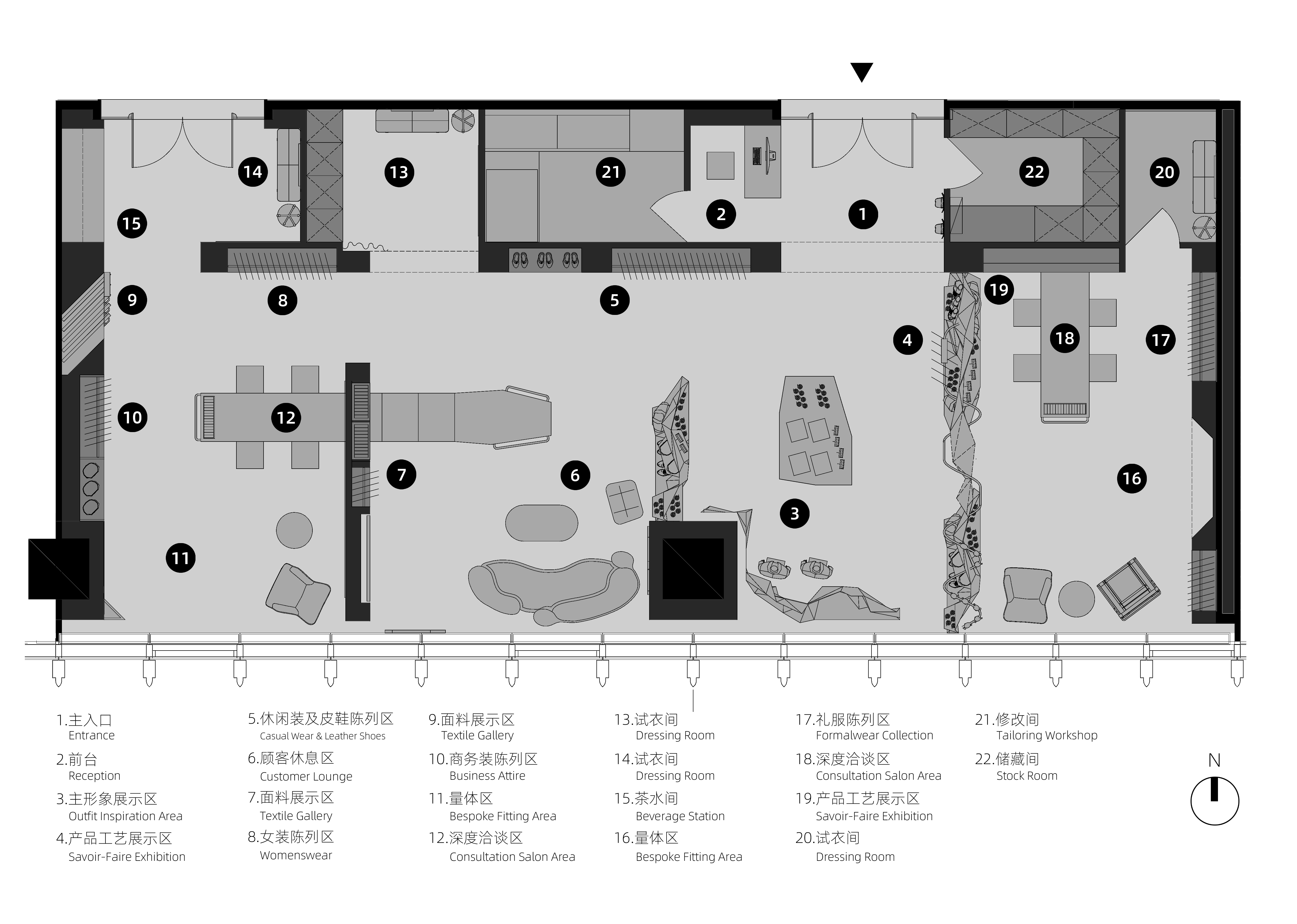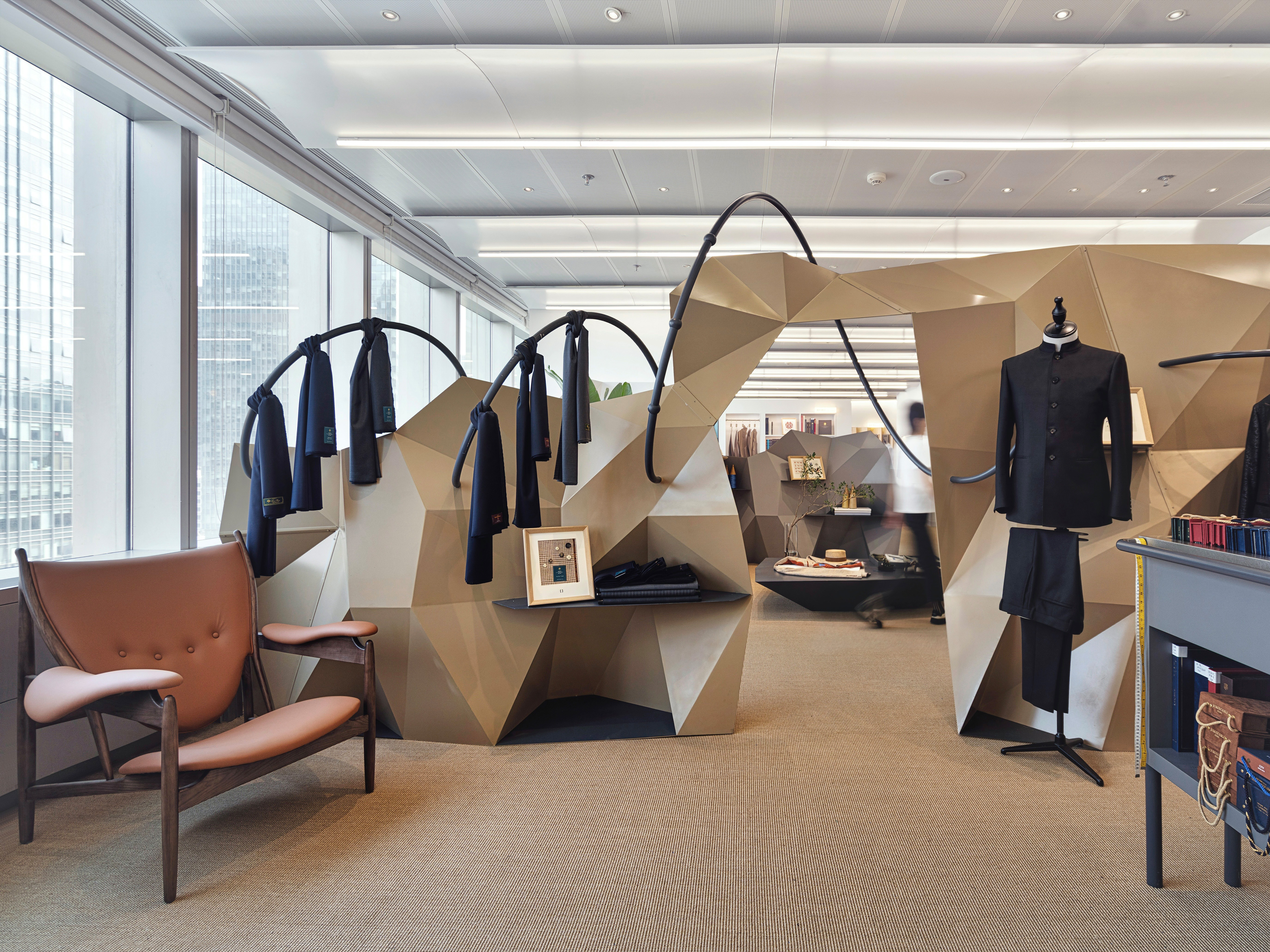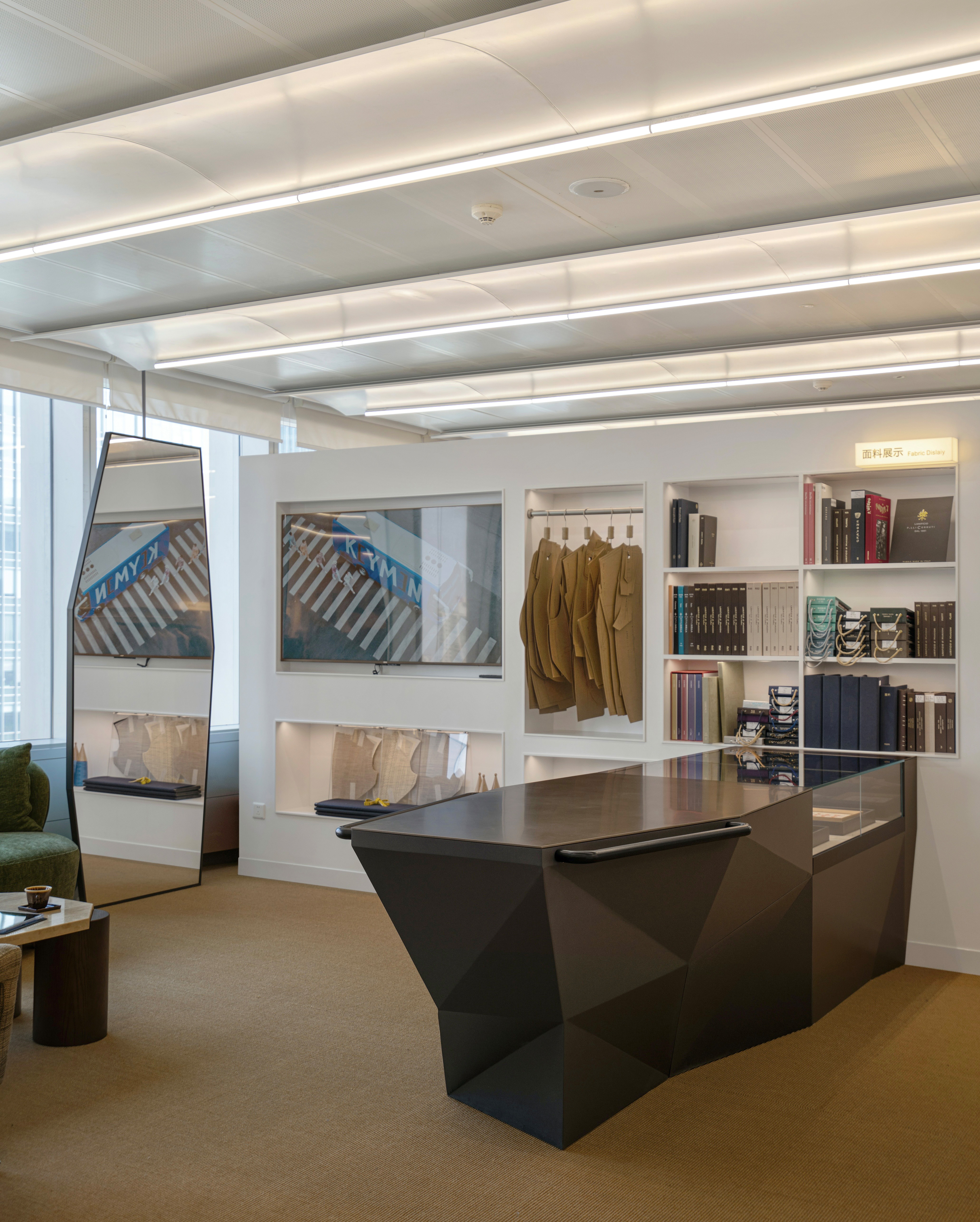 ▲室内空间 Interior Space————我们在具体的陈列上也做了进一步的产品展示设计。原本在定制店的展示内容中,只有衬衫有分解陈列的领型袖型墙。而西装的展示只有成衣展示,但西装才是定制店的主体。所以我们设计了这样的西装分解展示,我们把它称为:“爆炸结构”。 We also refined product display strategies. Traditionally, bespoke shops only deconstructed shirt elements (like collars and cuffs) for display, while suits—the core product—were shown only as finished garments. To address this, we designed a deconstructed suit display, which we call the "Exploded Structure."