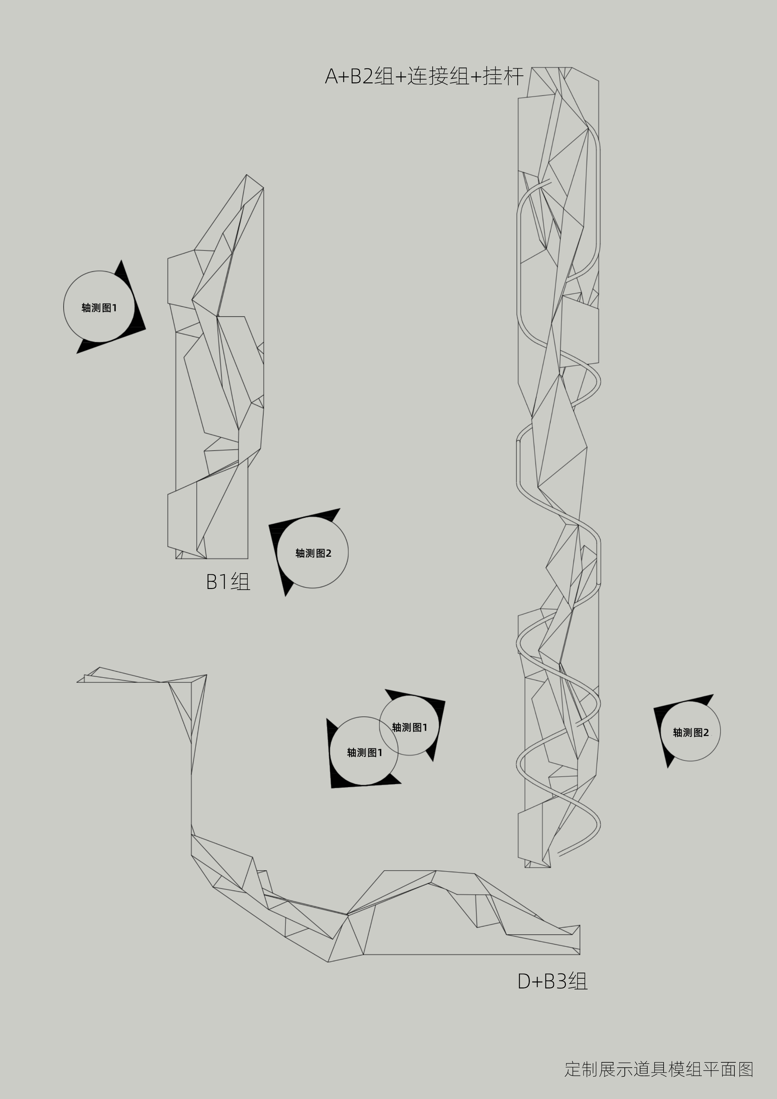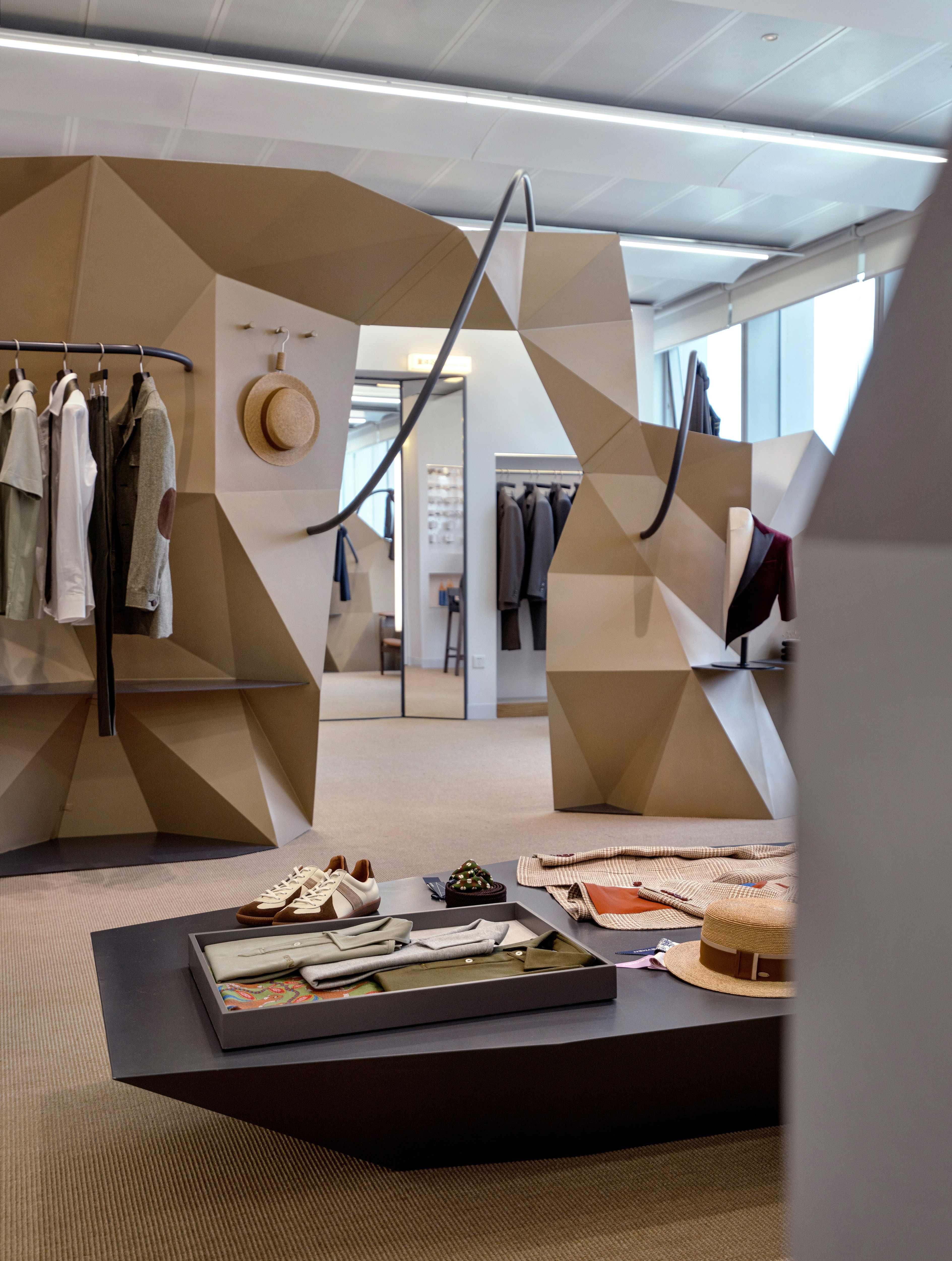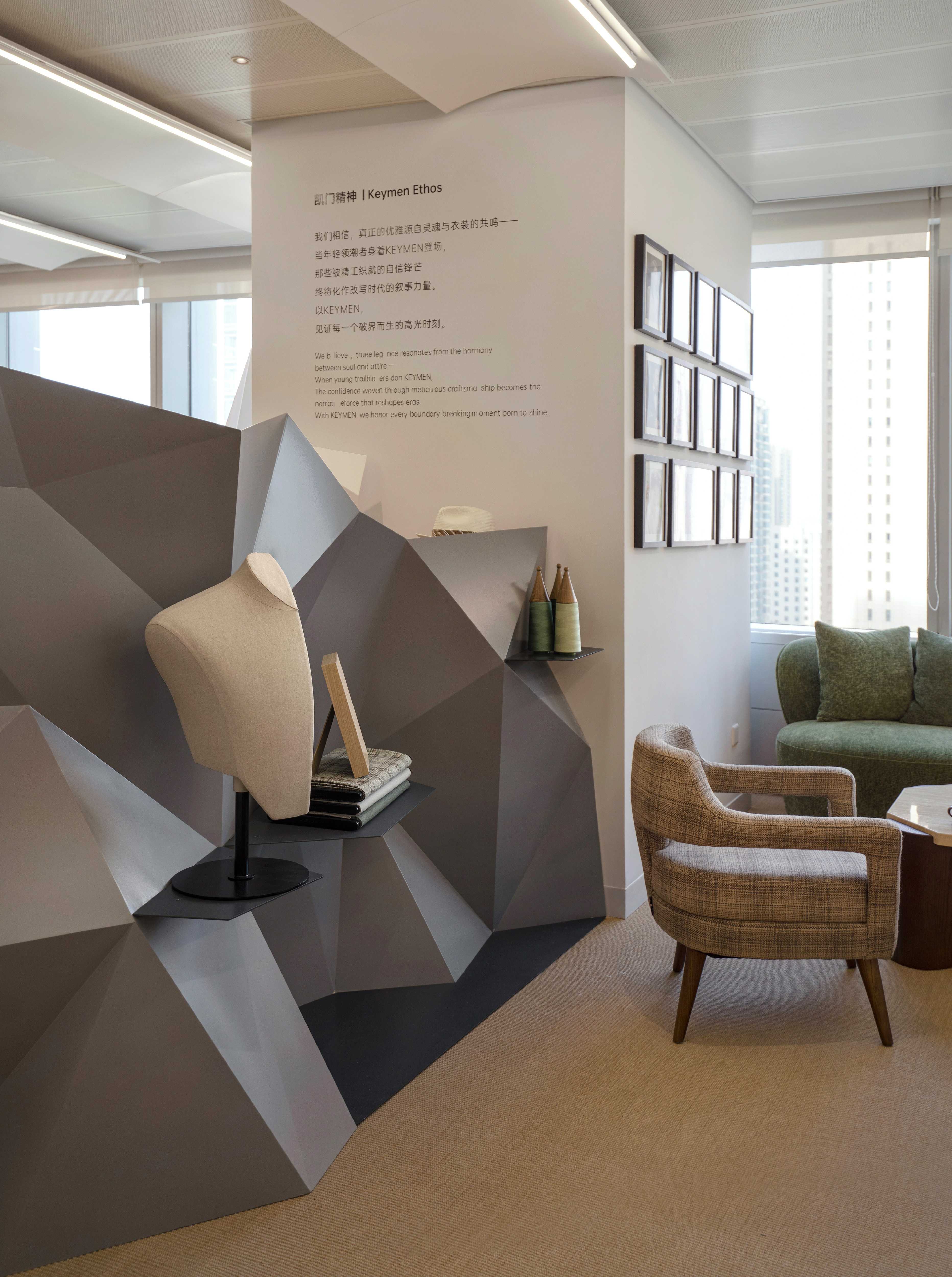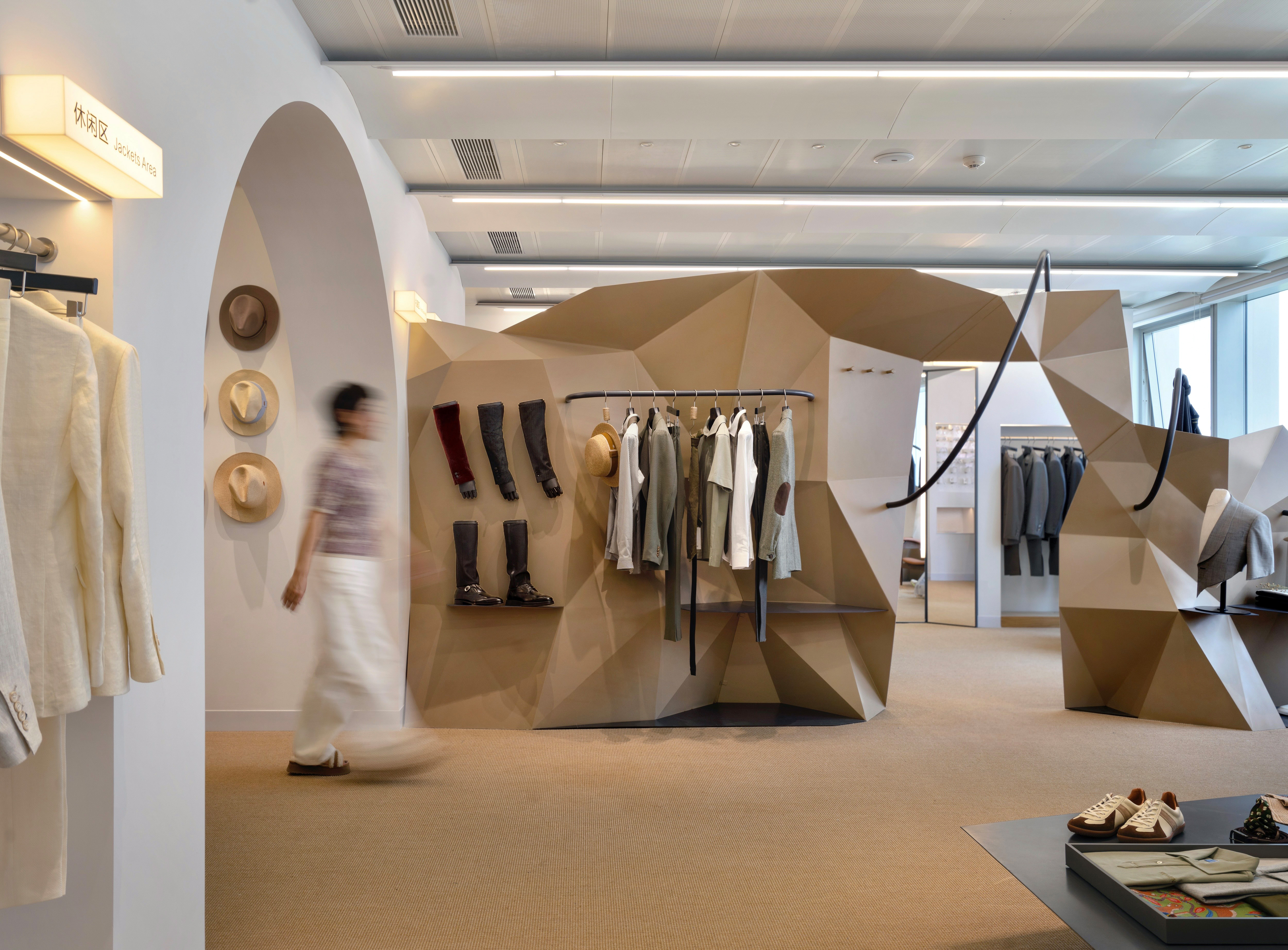 ▲折纸隔断 Origami Partition————折纸的设计概念是源自定制过程中牛皮纸纸板的制作,这一过程凝聚了很多工匠打磨的精髓,废弃无数个纸团之后才能完成一张精心设计的纸板,所以我们以“折纸”为设计概念,把它做成划分空间的隔断和产品展示的展墙。 The origami design concept was inspired by the craft of pattern-making with kraft paper during the bespoke process. This stage embodies the essence of artisan refinement, where countless discarded paper drafts lead to a meticulously designed template. Thus, we adopted "origami" as the design motif, transforming it into spatial partitions and display walls for product presentation.