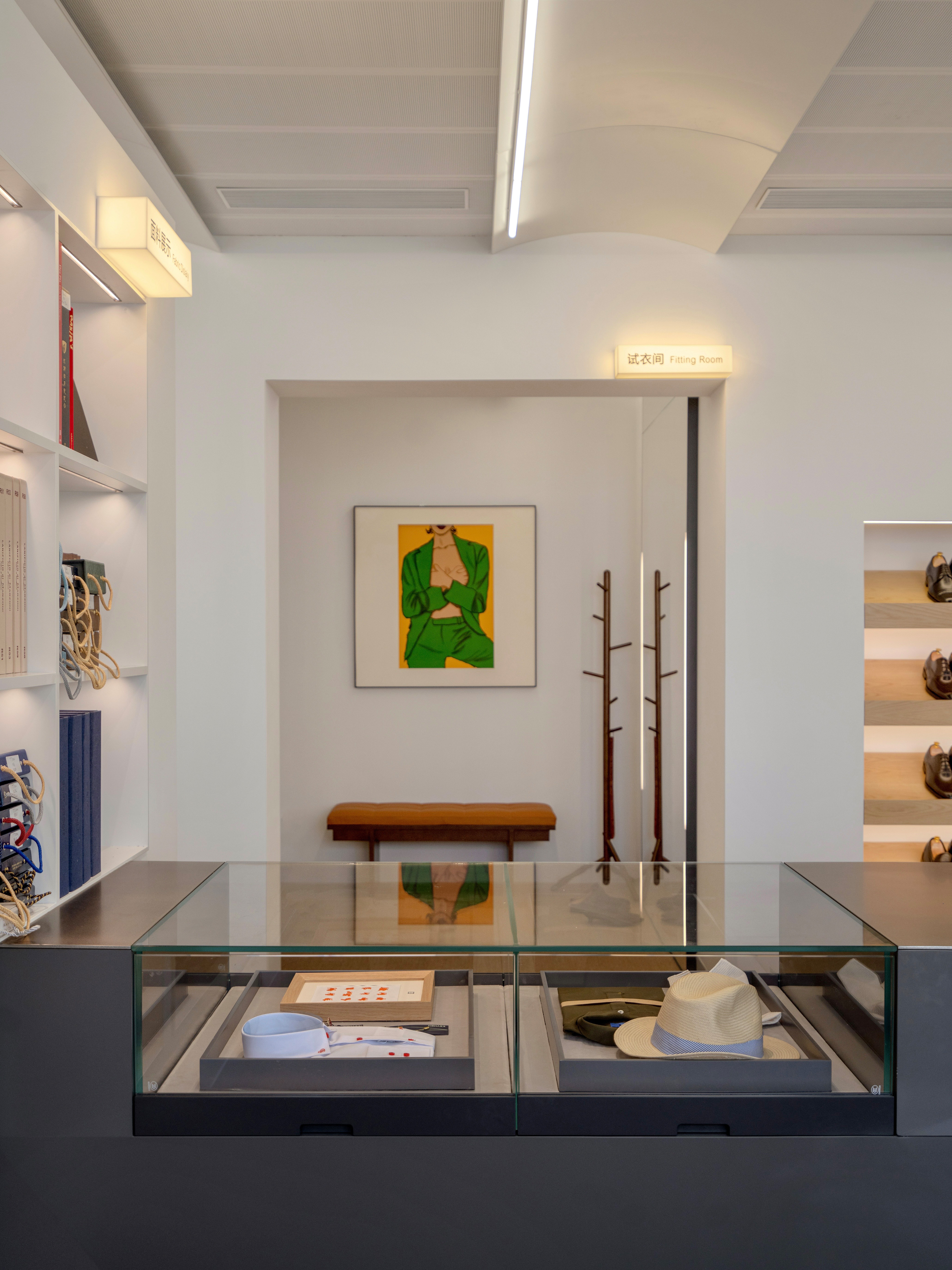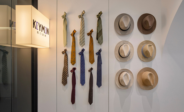 ▲入口展示墙 Entrance Display Wall————该项目位于沈阳市万象城写字楼内,委托方希望我们通过设计用尽量低的造价呈现出丰富且便于复制的男装定制店铺。 This project is located in the office building of Mixc Mall in Shenyang. The client requested that we design a bespoke menswear store with a rich yet easily replicable aesthetic while keeping costs as low as possible.