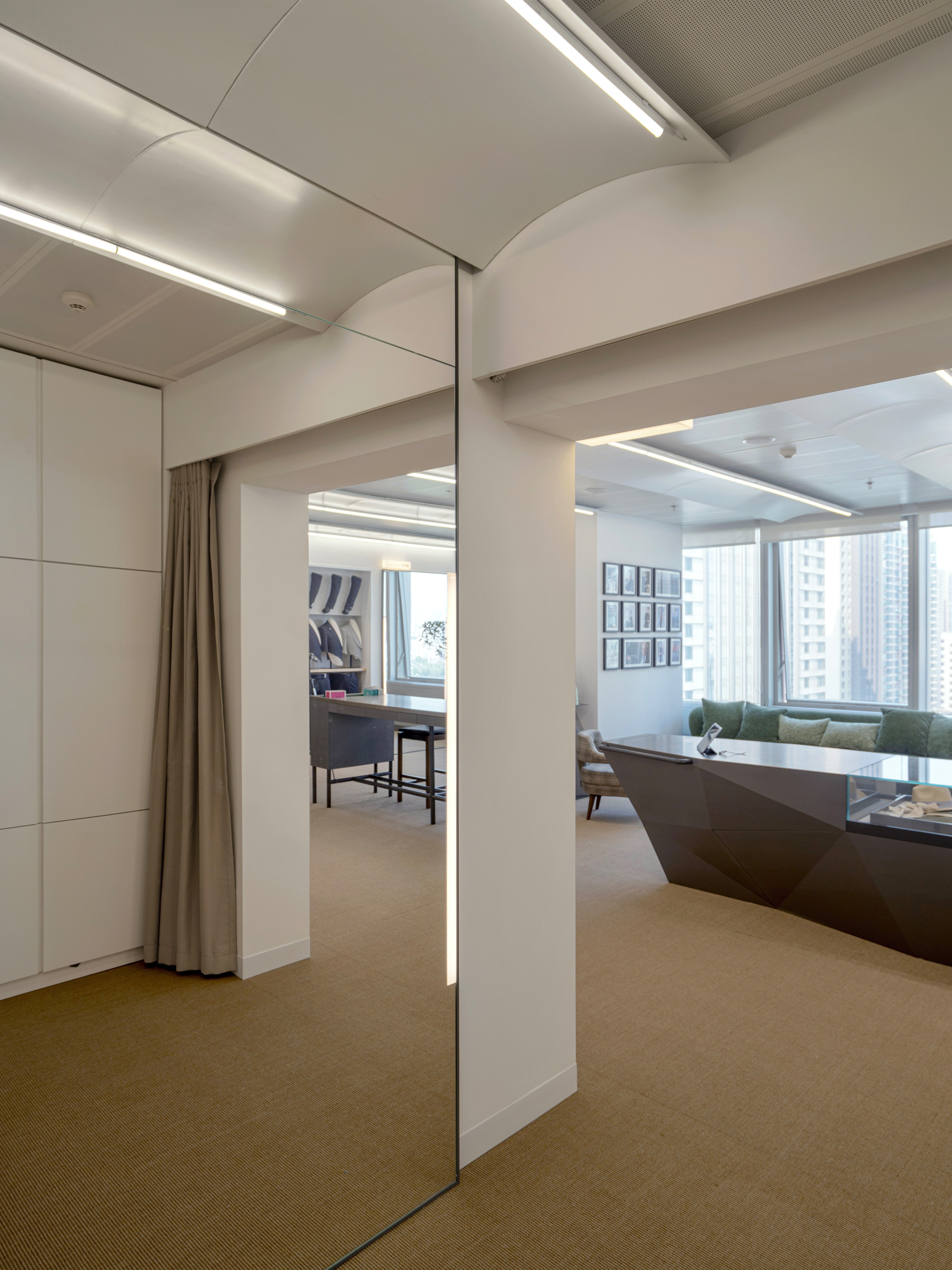 ▲细节展示 Details————天花上的弧形造型是我们局部替换的结构,我们想在大面积保留原吊顶的基础上做一些变化。这个弧形造型既是一个变化层次,也是灯光的反射介质。我们通过简洁的管灯一字排列来达到基本的空间主照明需求,然后利用弧形的灯具衬底来作为灯光的柔光反光媒介,这样既能让整个空间光感比较柔和,也能让原本的平顶天花有一些趣味变化。 The curved forms on the ceiling were part of our selective replacement strategy, introducing variation while preserving most of the original ceiling. These arcs serve both as layered design elements and as reflective mediums for lighting. We arranged simple linear tube lights in rows to meet basic illumination needs, then used the curved fixtures as a soft, reflective backdrop. This solution ensures gentle ambient lighting while adding visual interest to the otherwise flat ceiling.