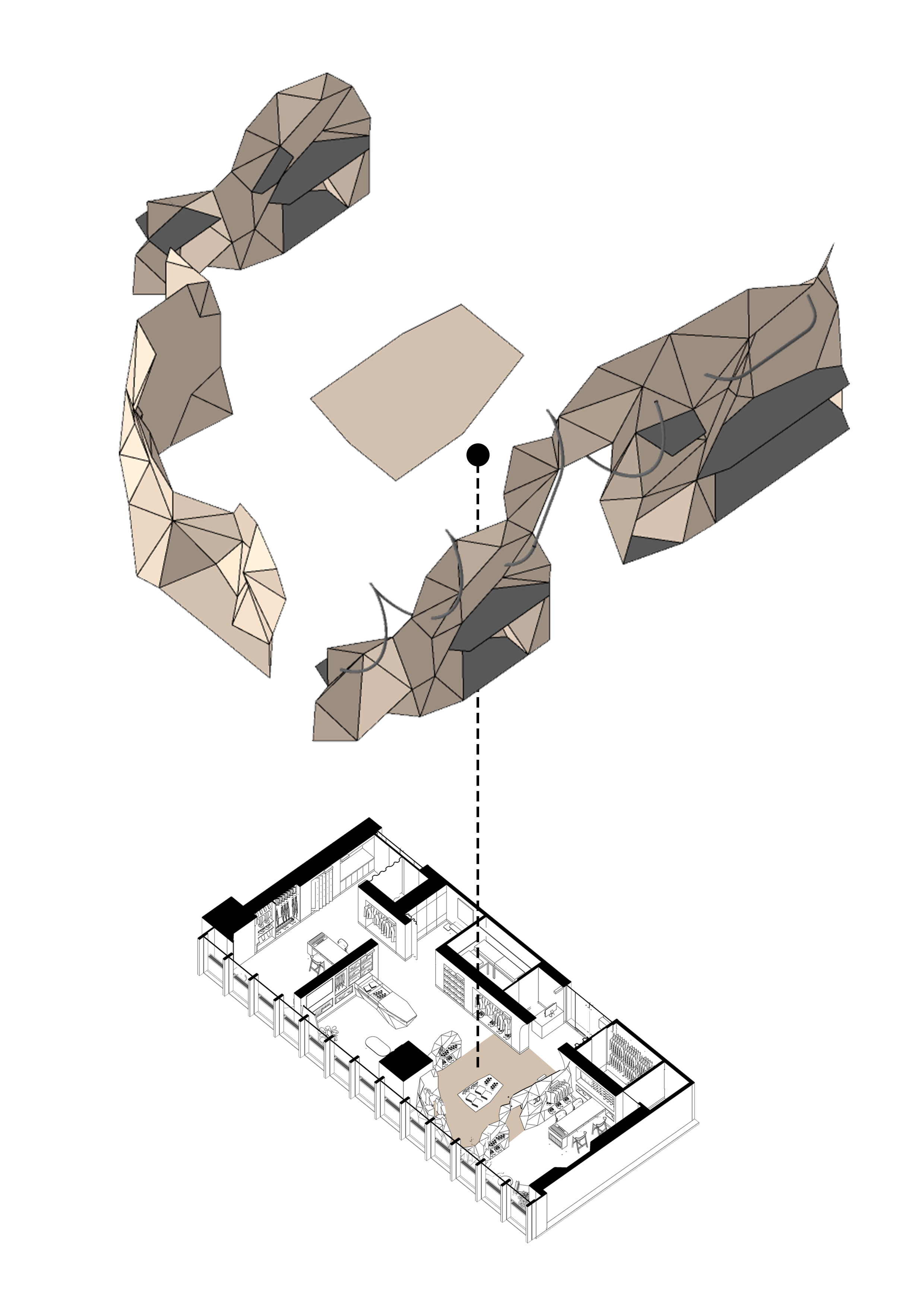 ▲定制区 Customing Area————除了折纸概念的空间元素,我们把大部分功能都用比较方正简洁的语言来表现,这样既能节约造价,也能跟折纸元素形成对比。 Beyond the origami-inspired spatial elements, we expressed most functional elements in a clean, rectangular language. This approach not only helped control costs but also created a contrast with the origami features.