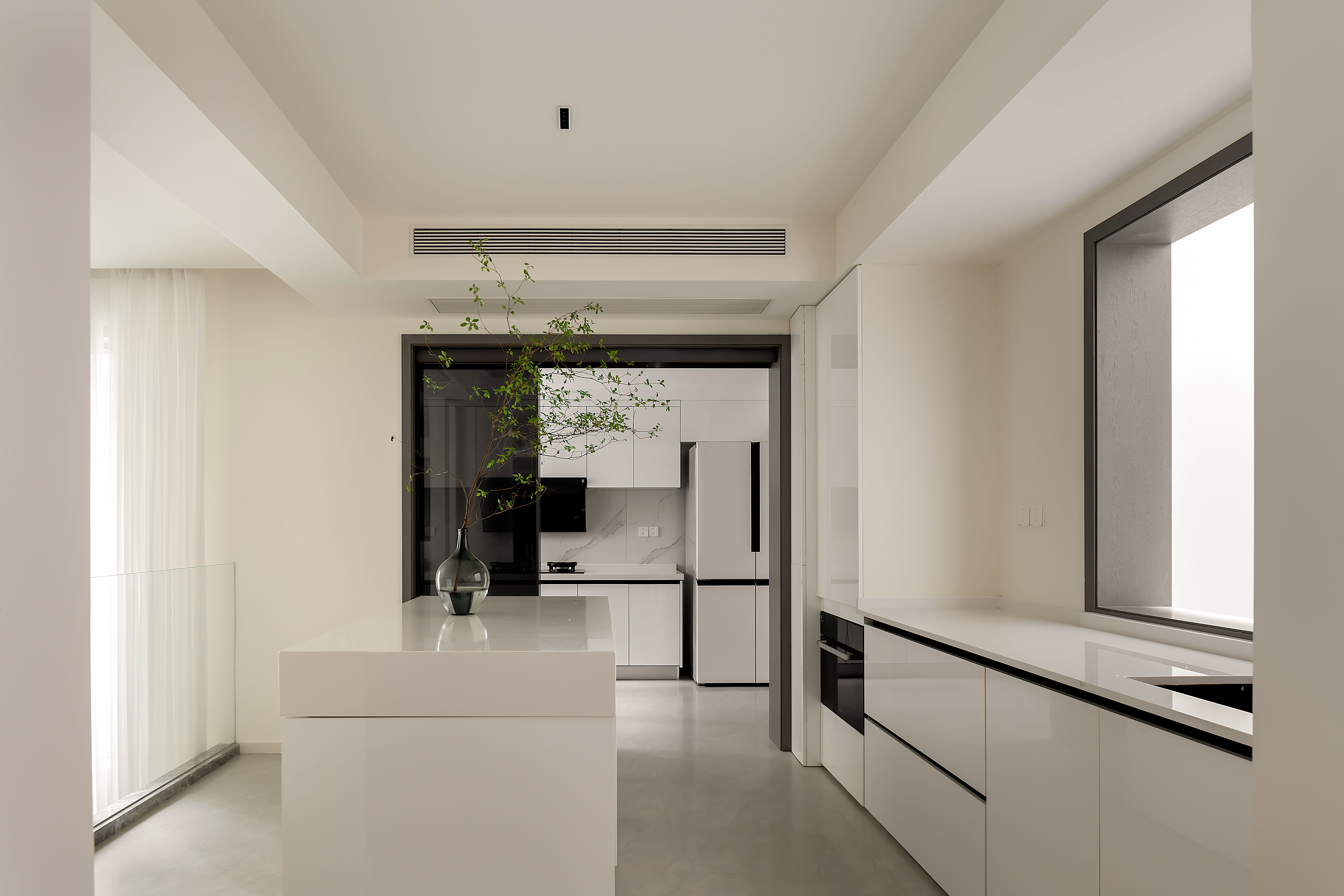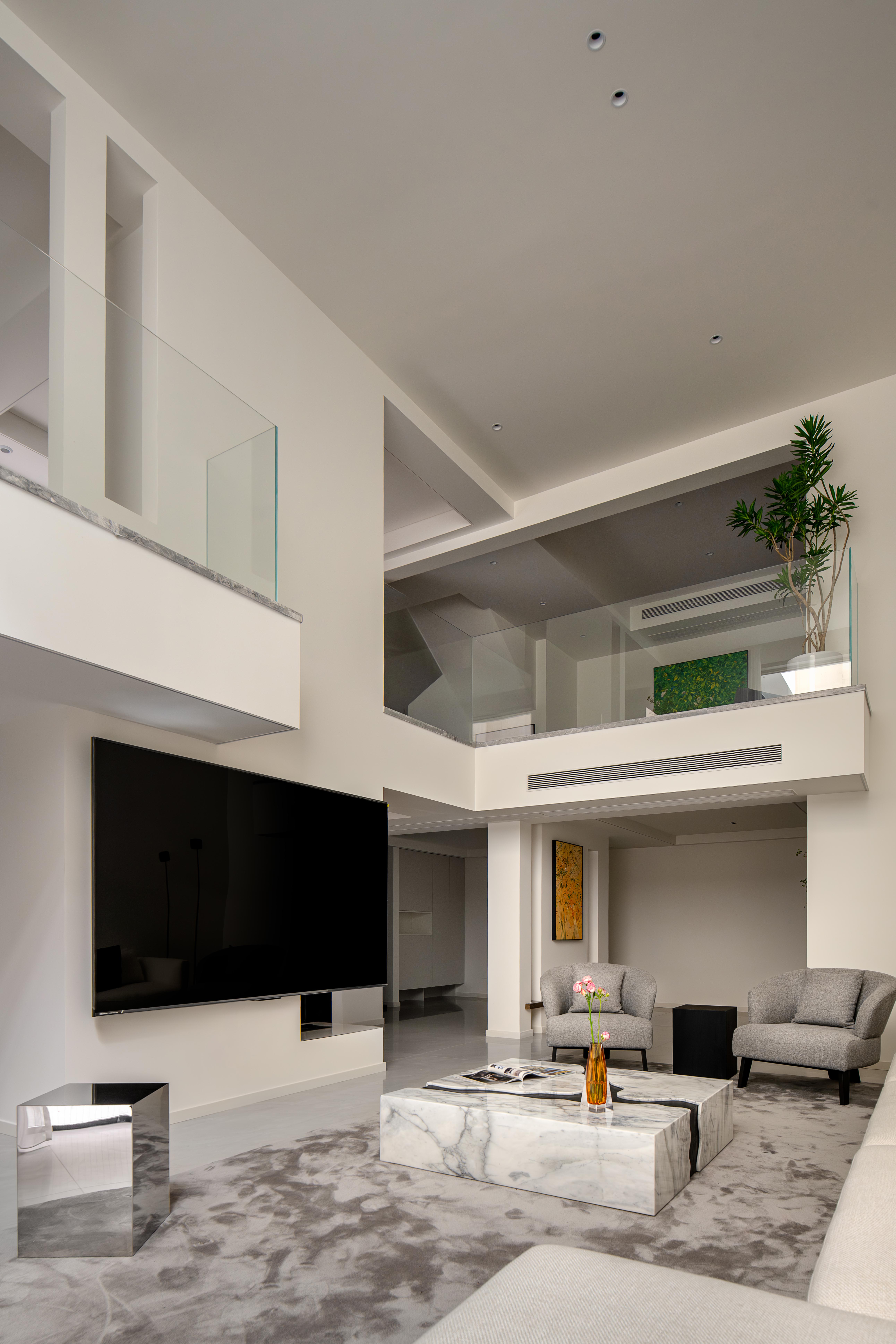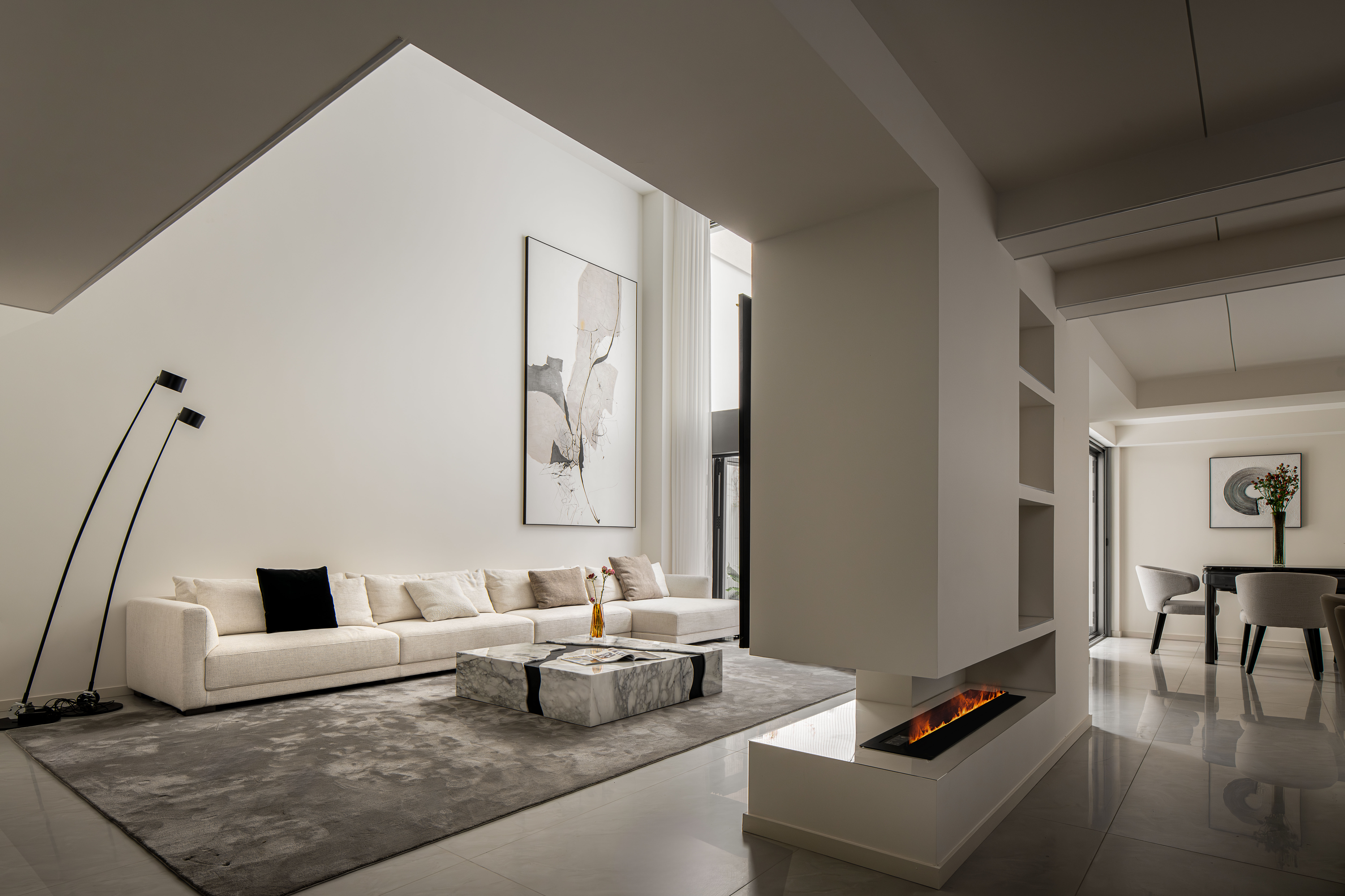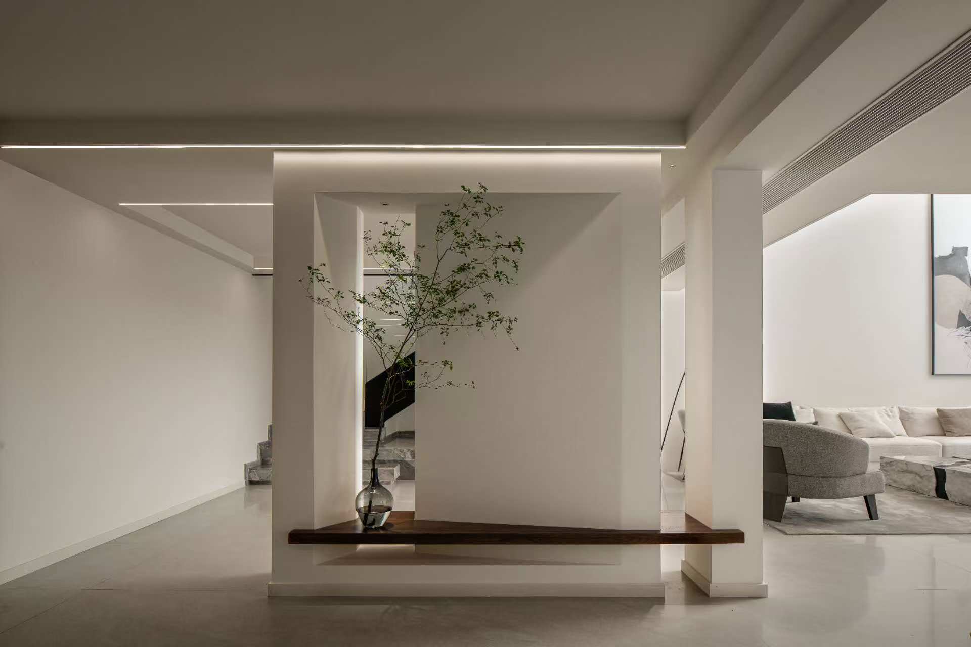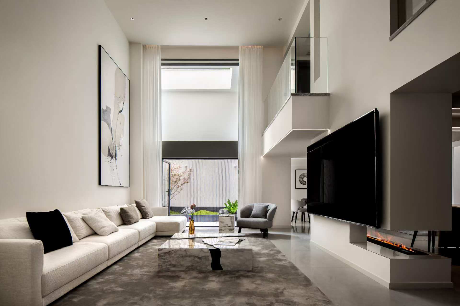 空间意境:整体以大面积的白色为基调,营造明亮、开阔的基底。局部采用灰色、黑色、原木色进行点缀和稳定视觉,形成鲜明对比,增强空间的层次与深度。