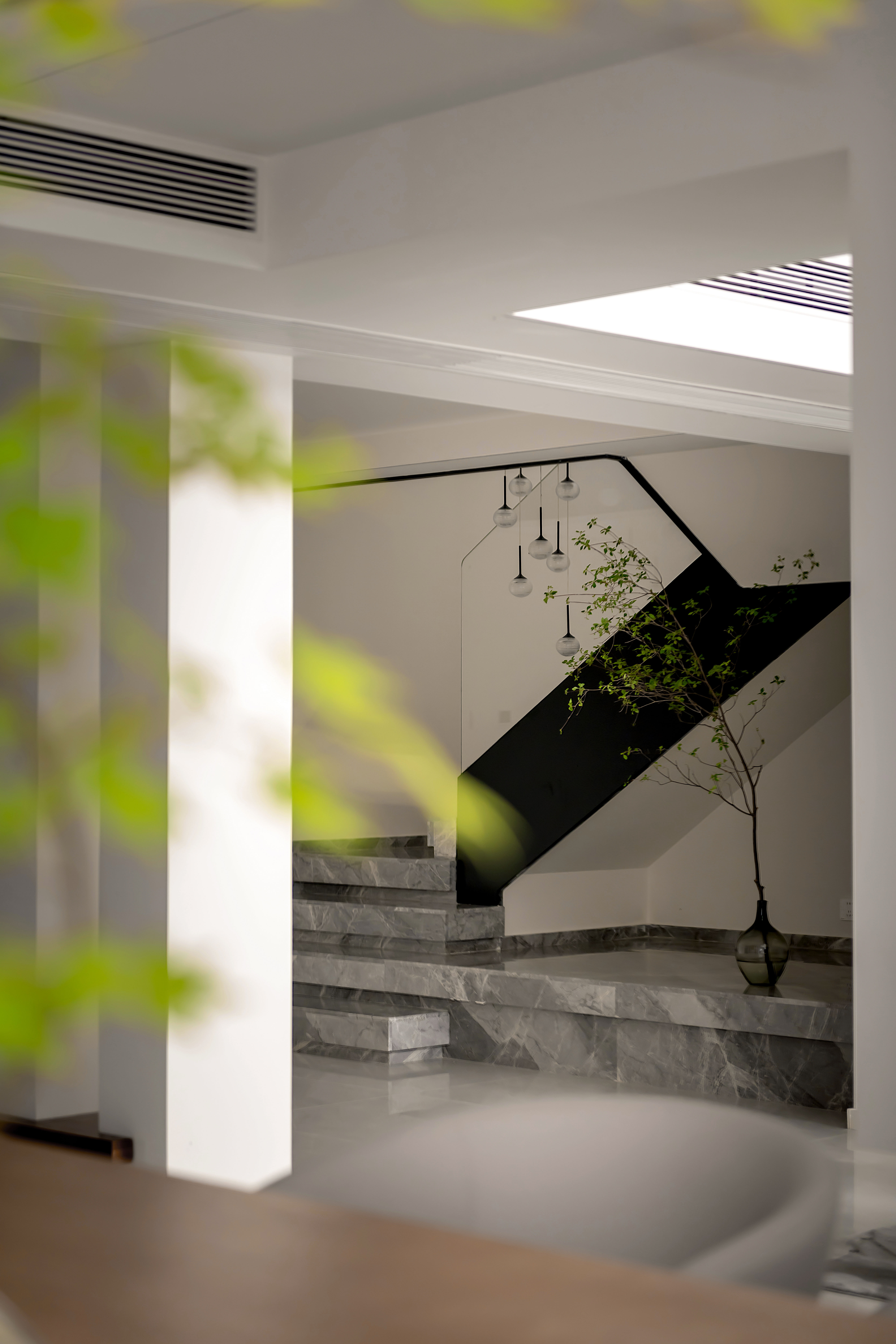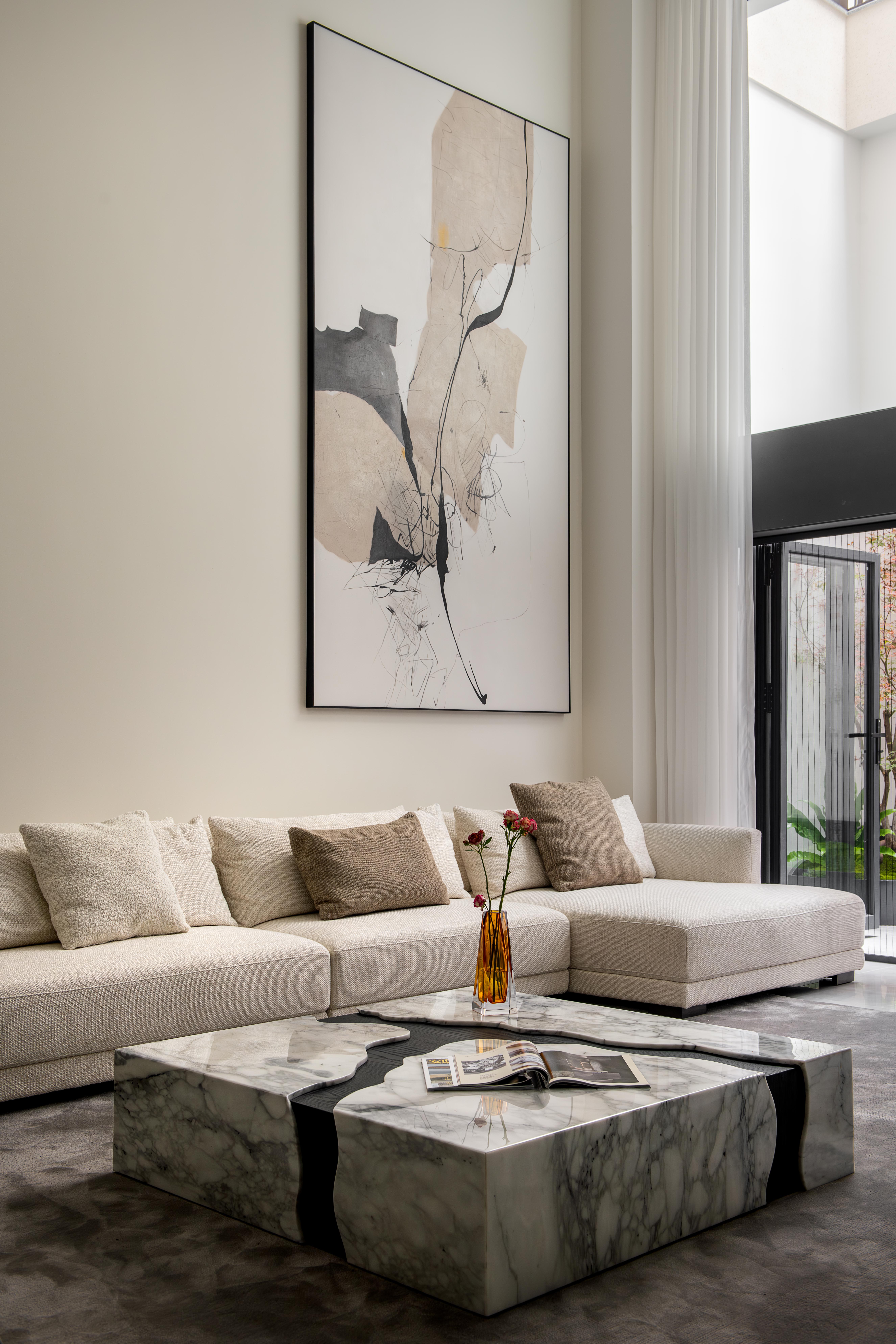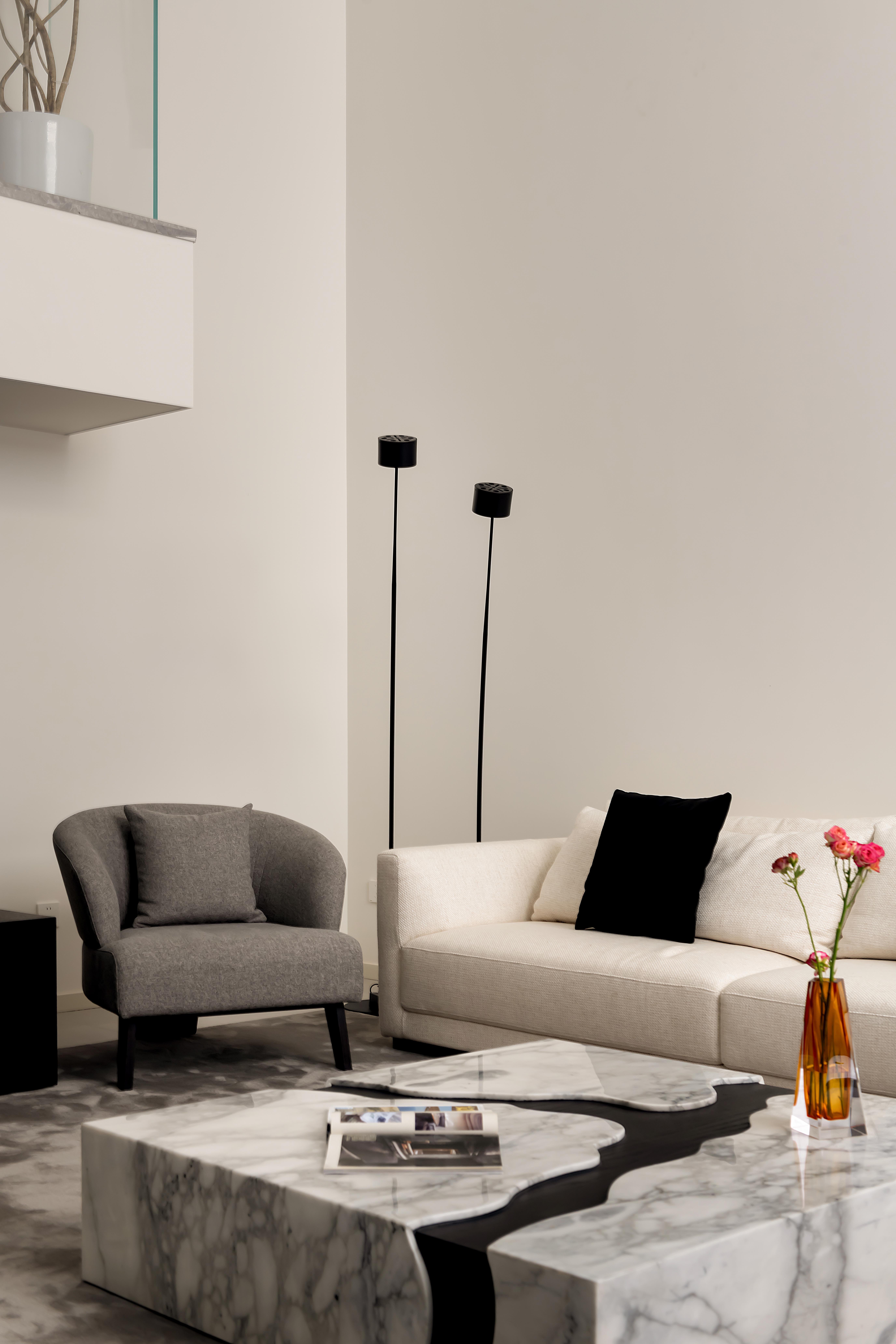 整体以大面积的白色为基调,营造明亮、开阔的基底。局部采用灰色、黑色、原木色进行点缀和稳定视觉,形成鲜明对比,增强空间的层次与深度。