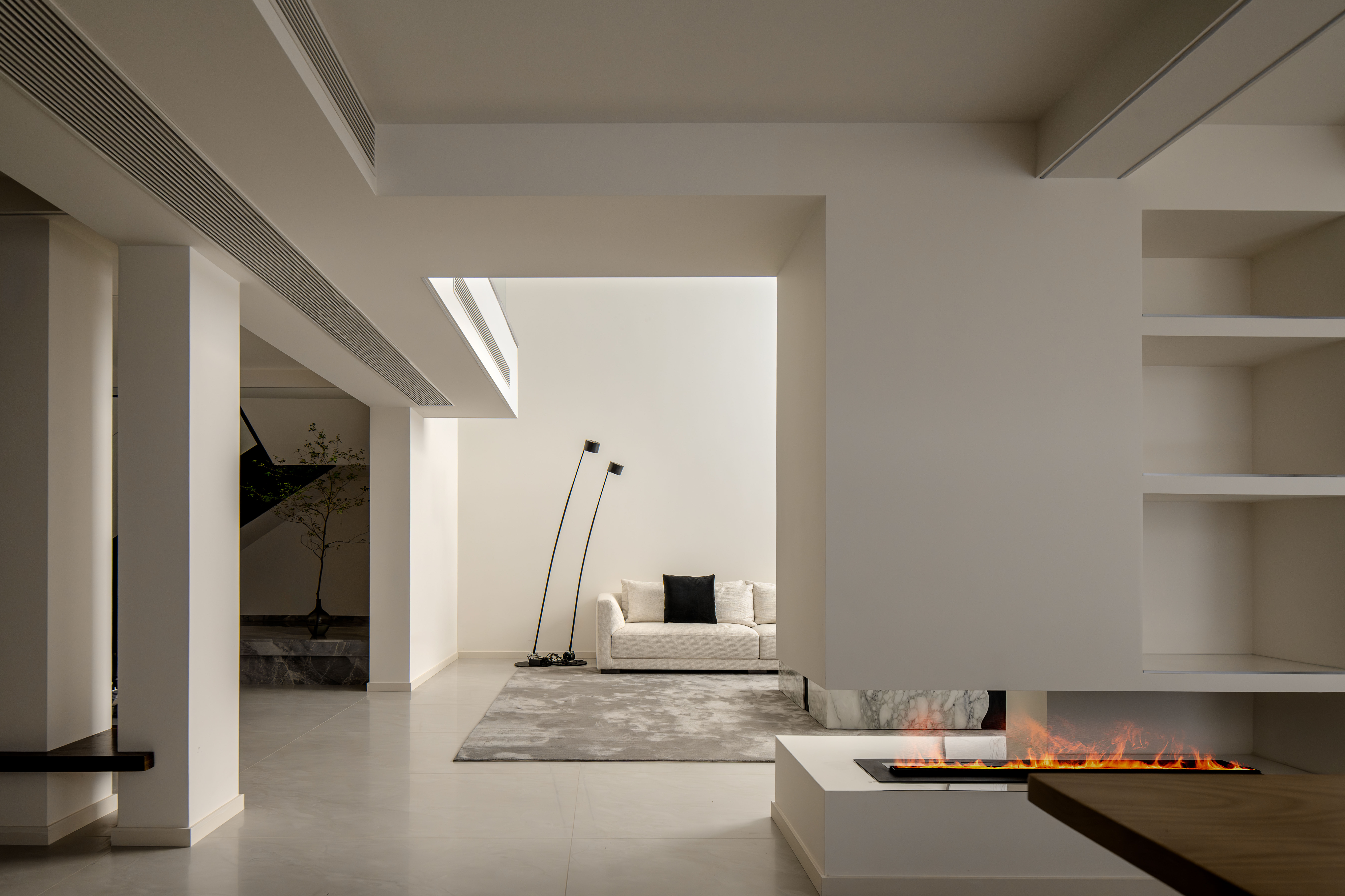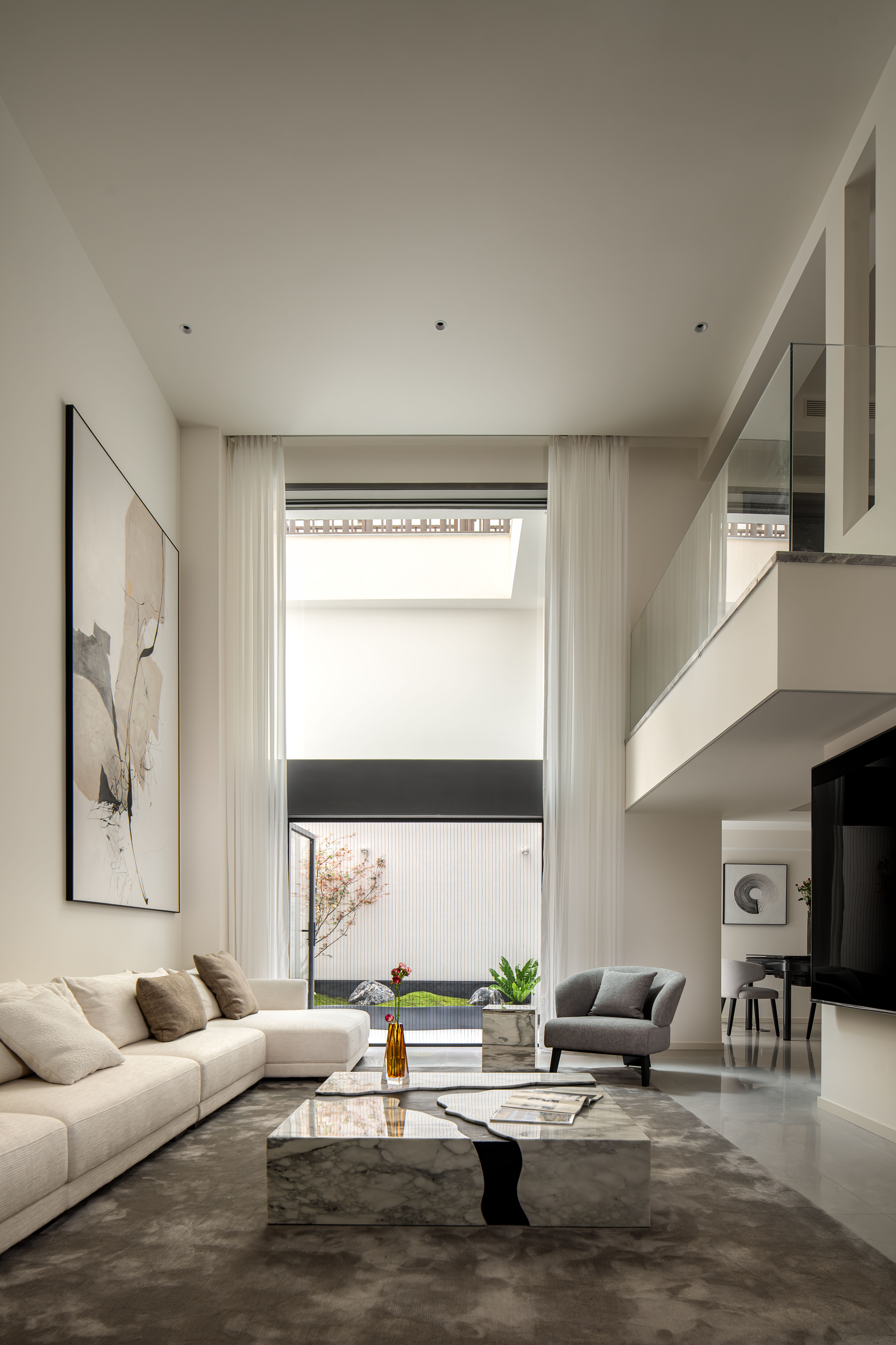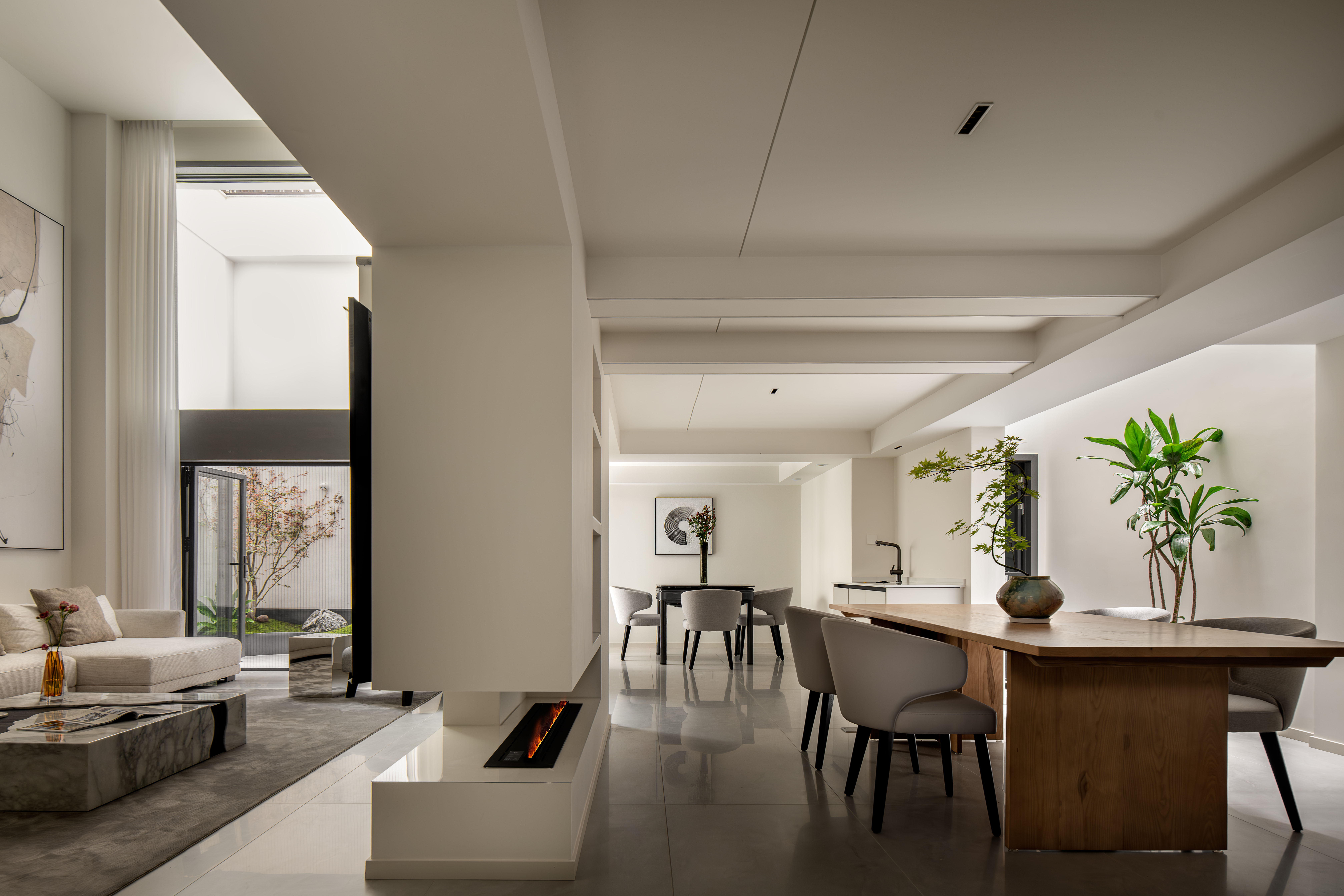 1.双采光井系统-引光入室,重塑空间:我们并非简单的开设两个天窗,而是对采光井进行系统性设计。一个为主采光井,位于核心区域的客厅,并对客厅做了挑高设计,引入更多的光线。另一个为次级采光井,服务于茶室和餐厅,让每个空间都有充分的采光,同时形成光影的层次与过度。