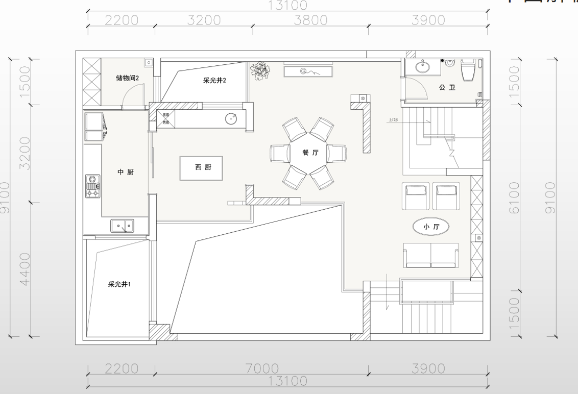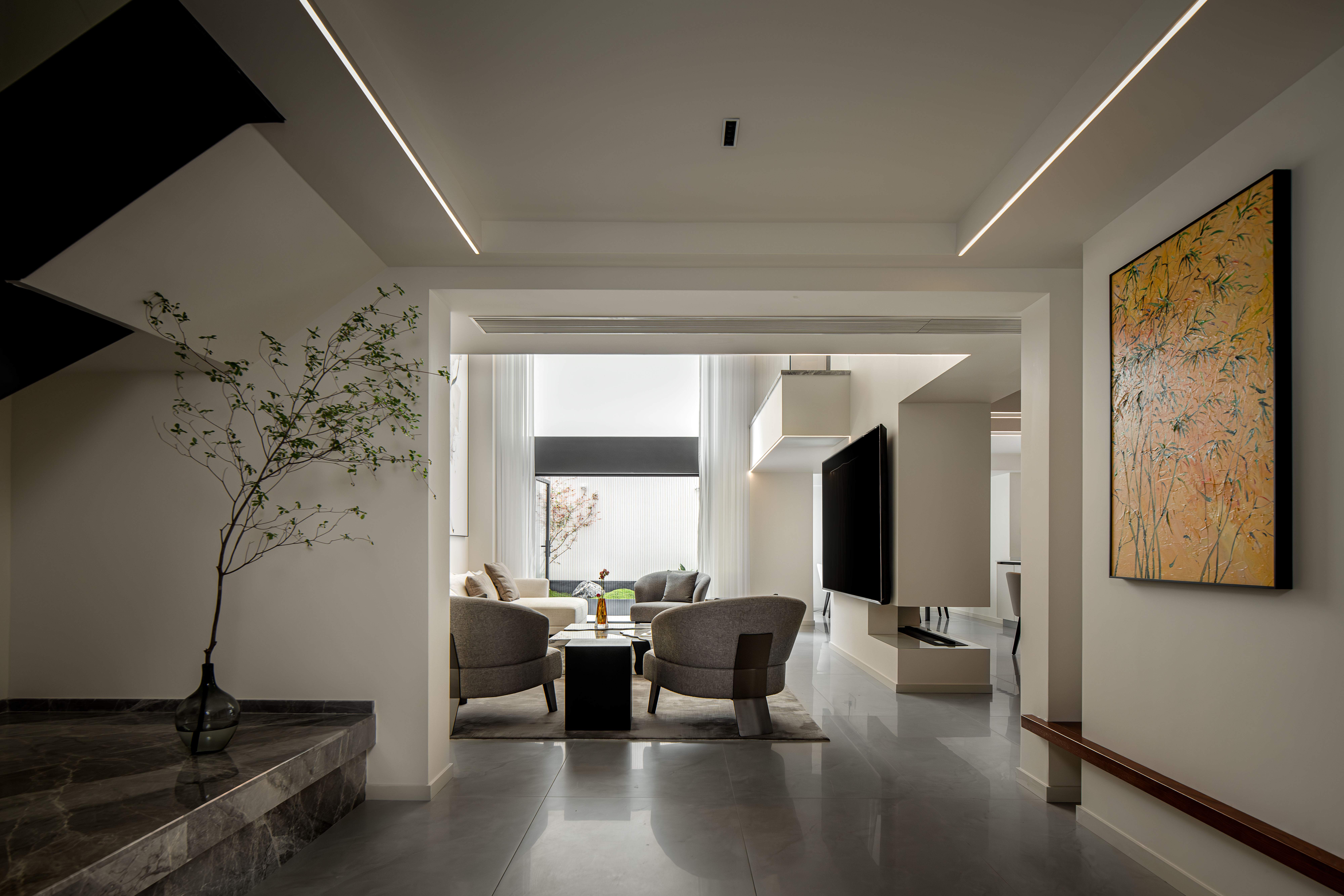 空间布局:通过纯粹的空间形态,以及流畅的空气流动,打造一个功能与美学高度统一的“地下室生活空间”。设计的核心策略是“向光而生,因风而活”,巧妙利用空间设计出“双“采光井!辅以新风系统,从根本上解决地下层的先天不足,实现与地上无异的舒适体验。