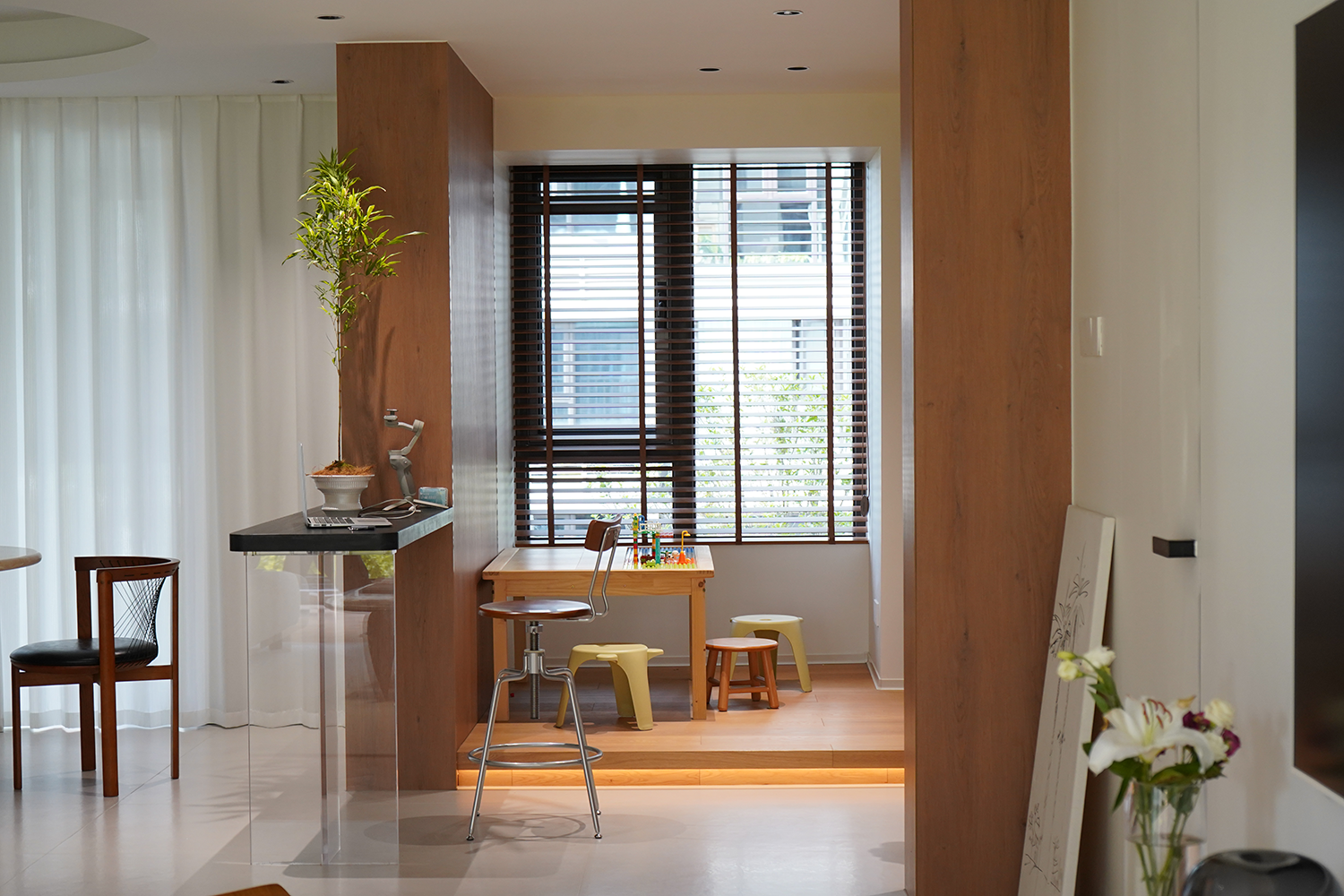 设计选材:1.纯白艺术漆+温润木色,阳光穿过梦幻帘的光影绝美的像幅画。