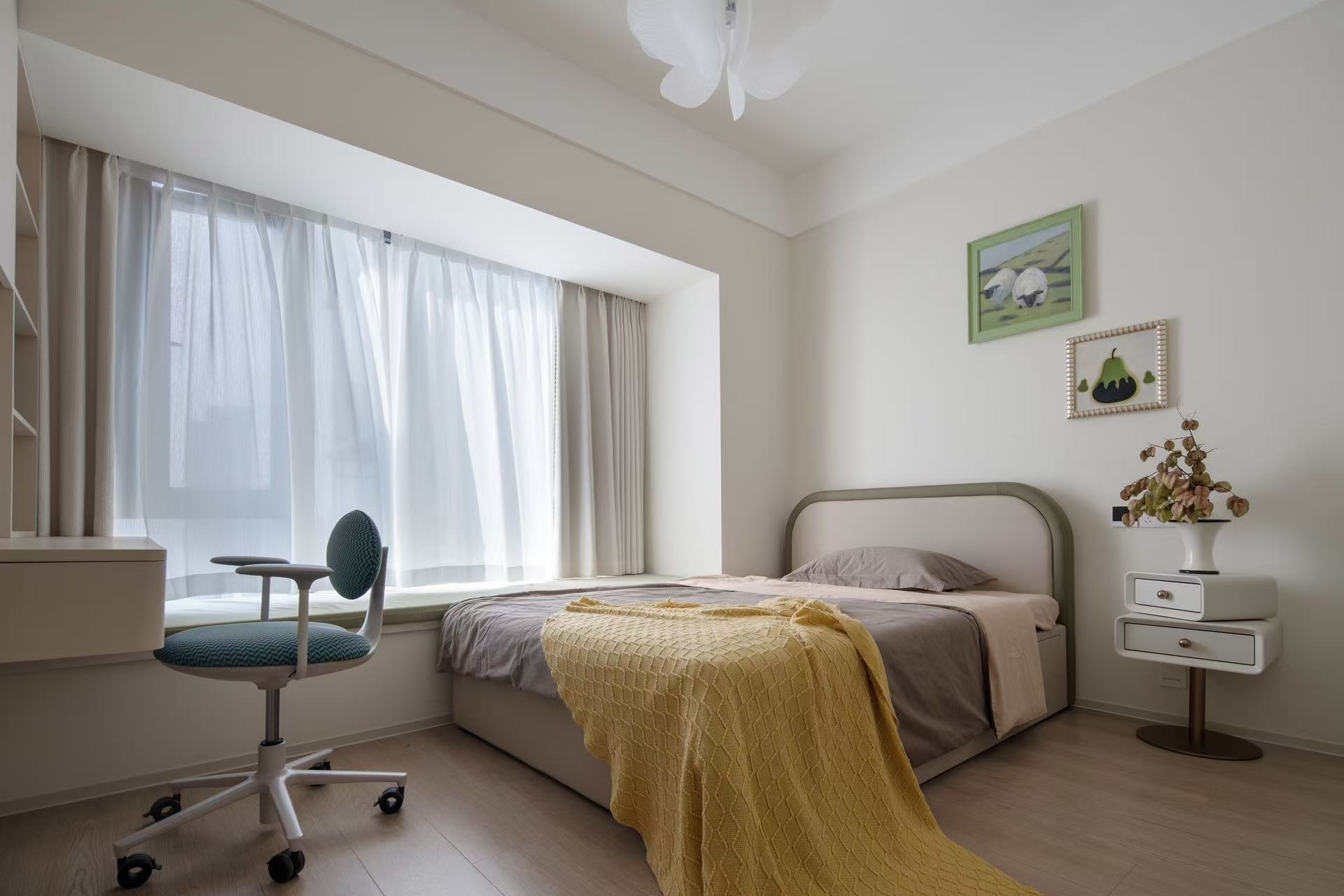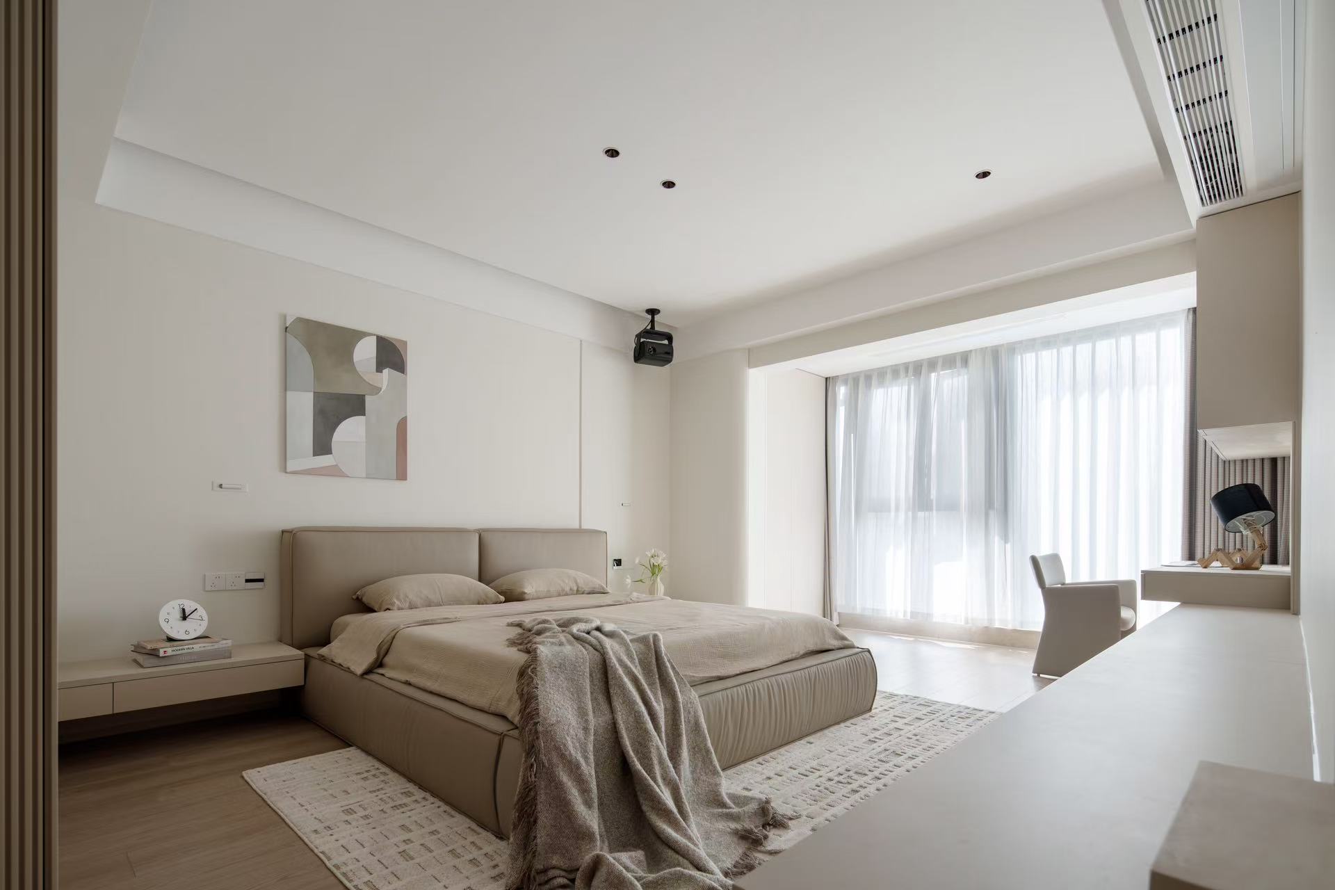 休憩放松场景:卧室配置柔软大床,营造彻底放松的睡眠环境,可满足业主“休憩、卸下疲惫”的需求,整体氛围静谧无压,贴合休息时的身心状态。