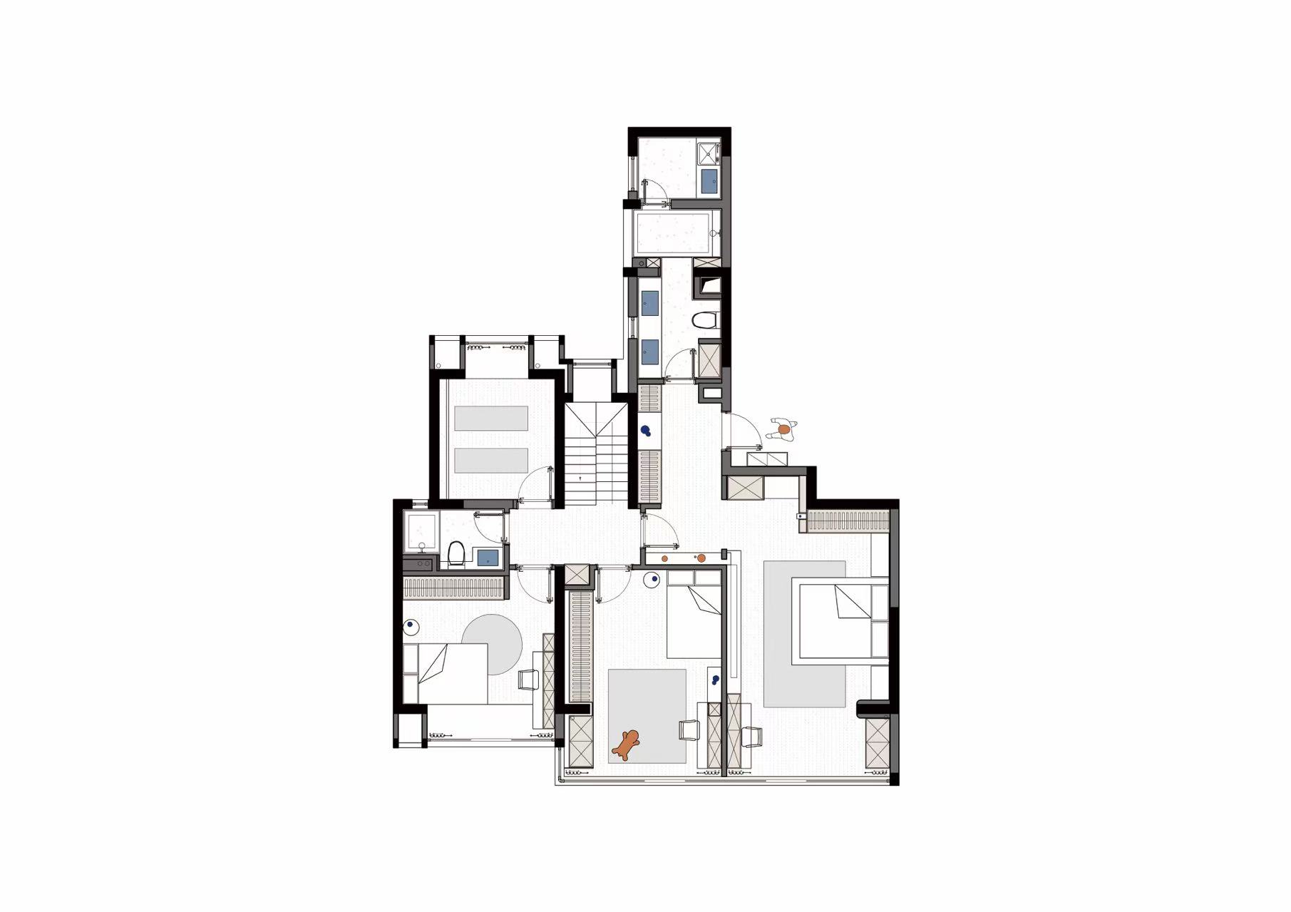 跃层衔接:重点优化地台与楼梯的衔接布局,通过“恰到好处的衔接设计”增强上下层空间的层次感与趣味性,避免跃层结构可能带来的空间割裂问题,让上下层动线自然流畅。 -