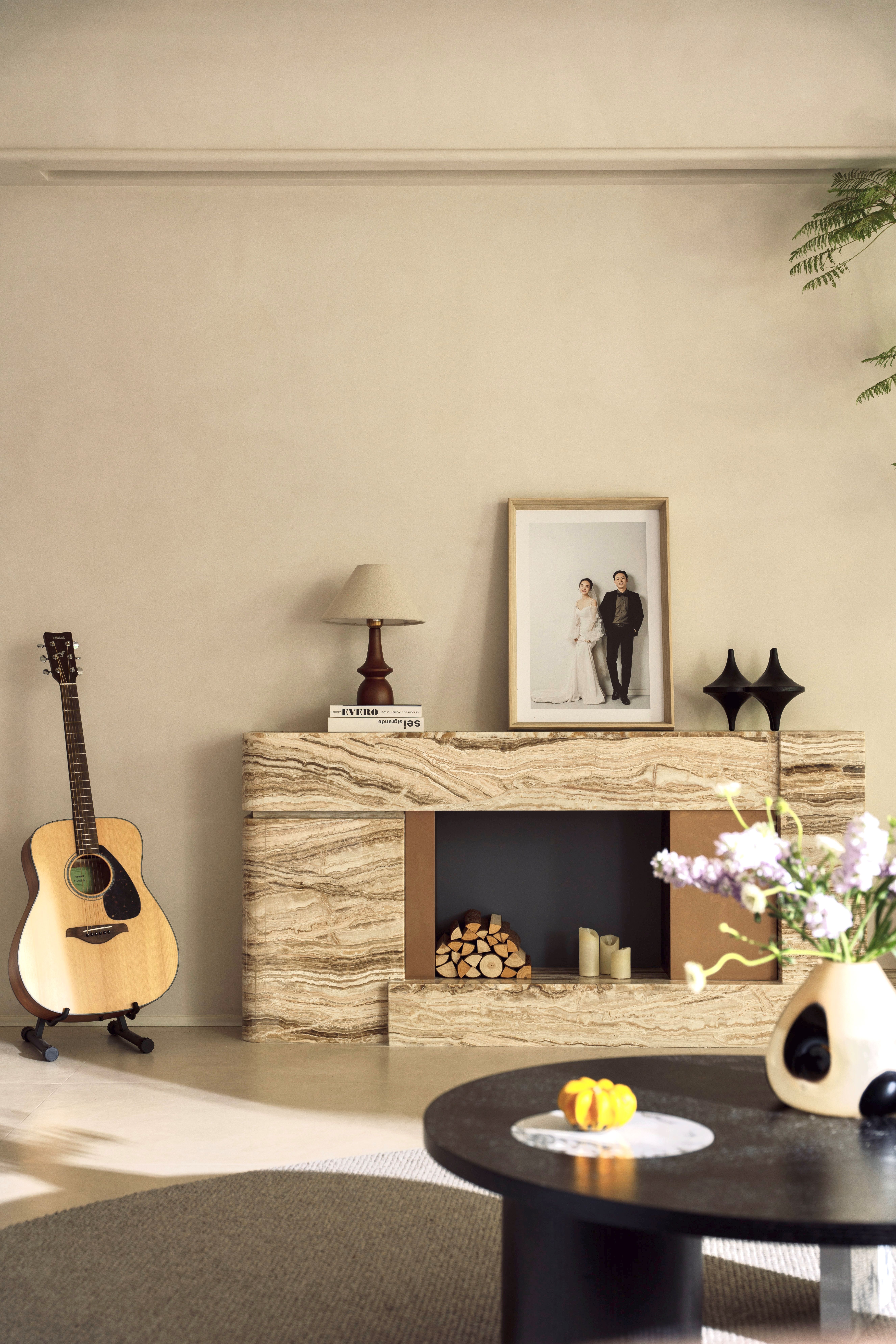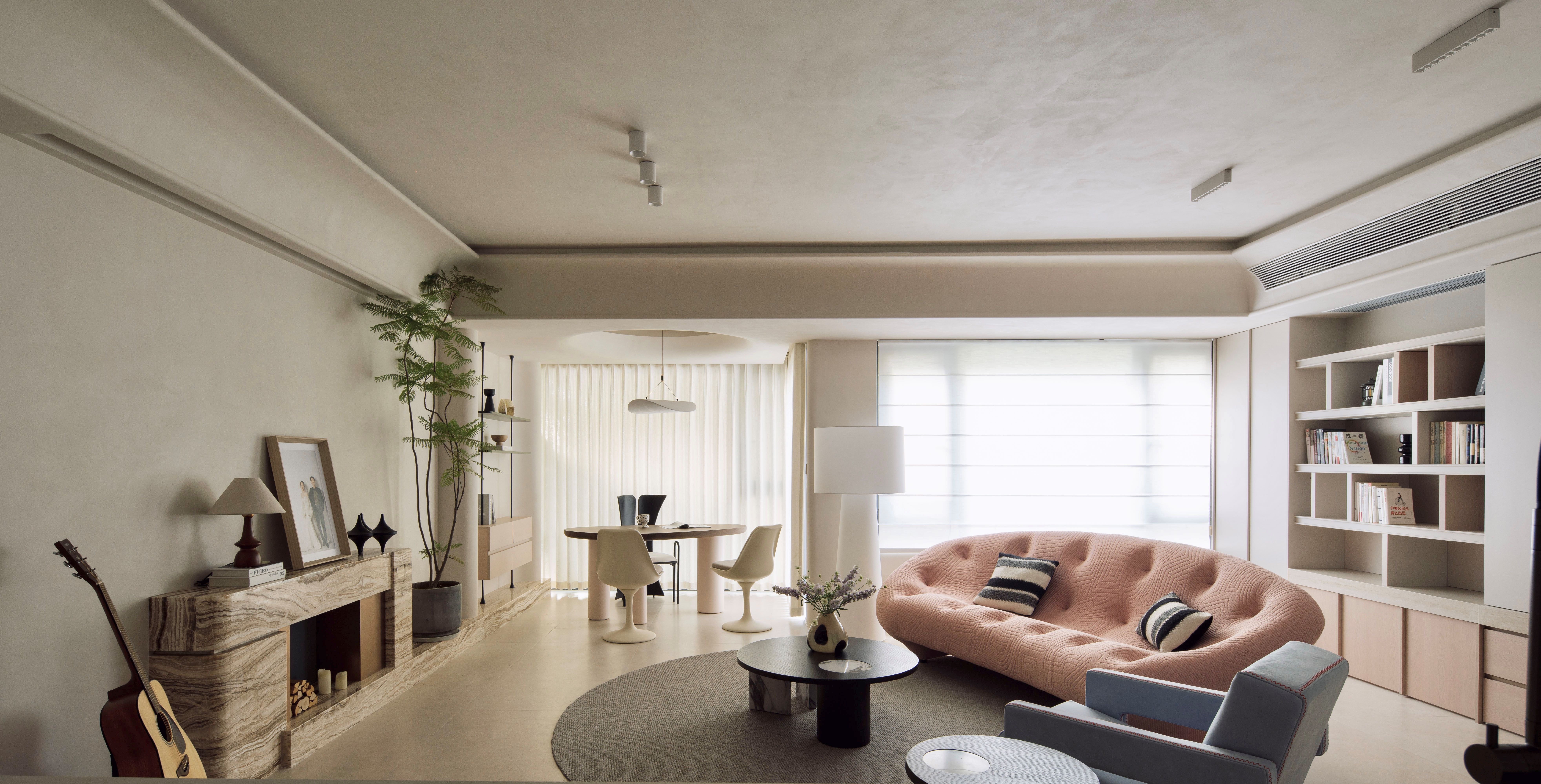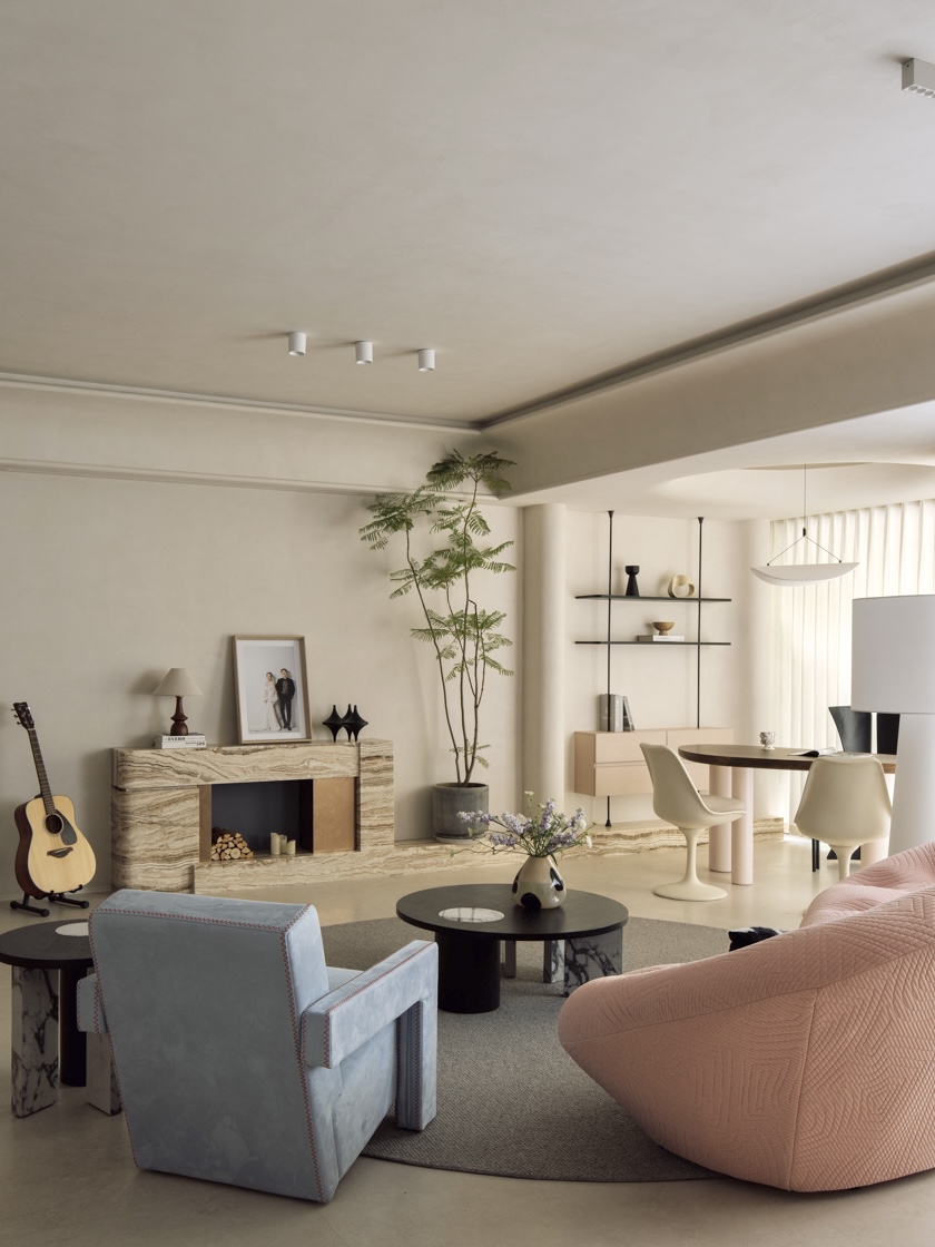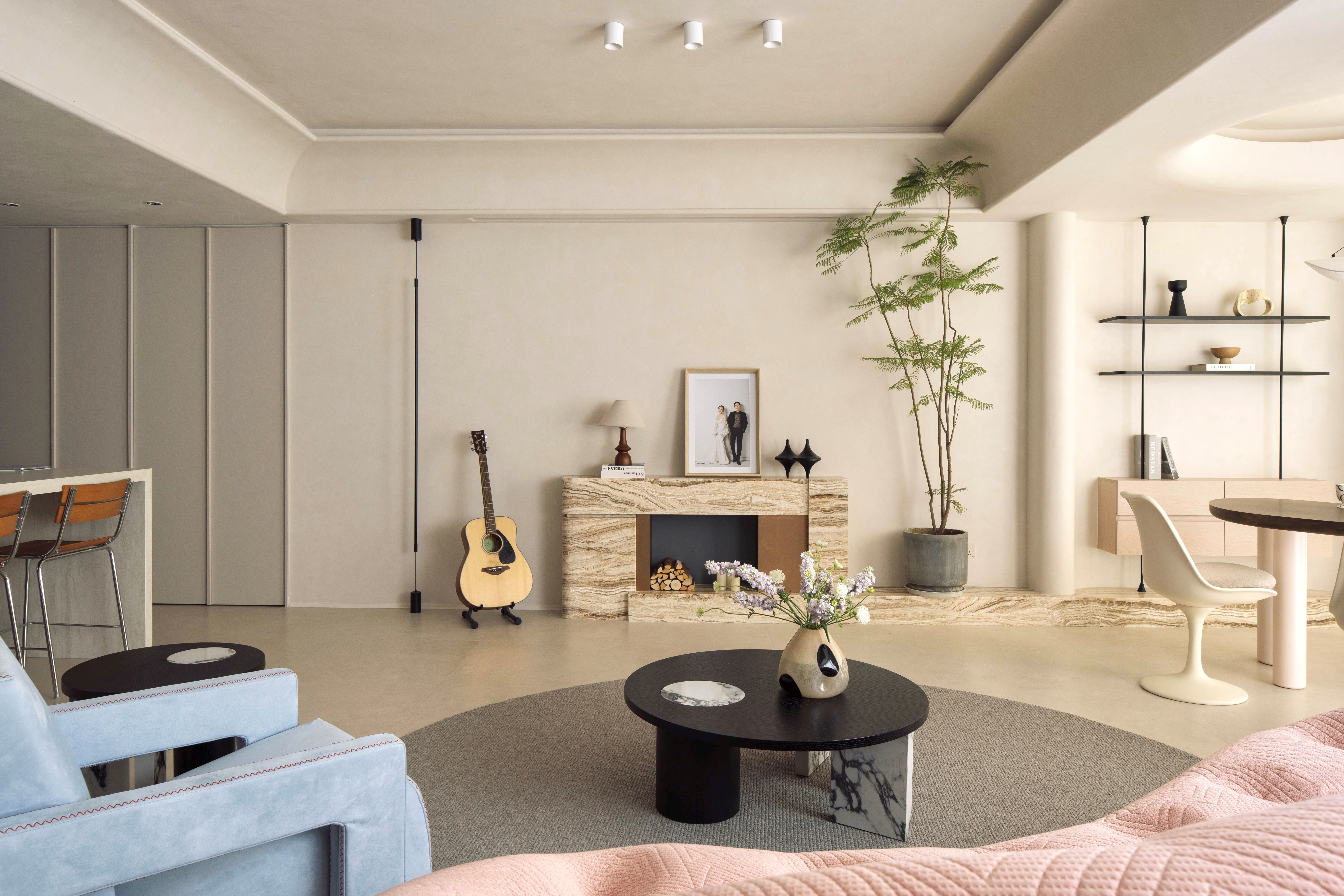 空间以粉色沙发与雾霾蓝单椅勾勒情绪曲线,温润原木与呼吸感洞石奠定大地基调。玉洞石壁炉如琥珀般凝结着地质时光的流动纹理,它不再仅是取暖之所,更是一座微型的地质艺术装置,成为视觉与精神的双重焦点。这是一处让材料自身叙事、让色彩随光歌唱的浪漫生命体。