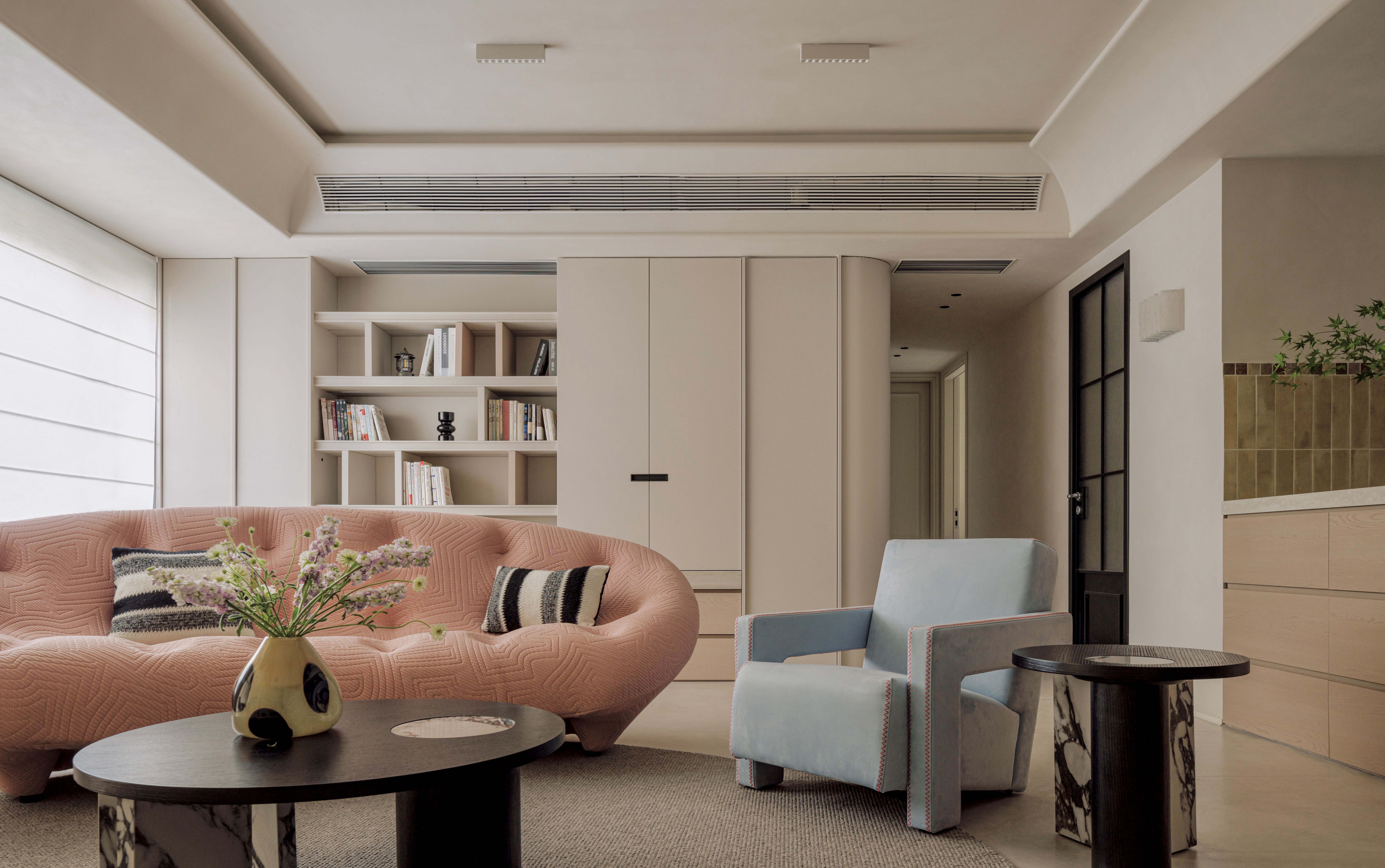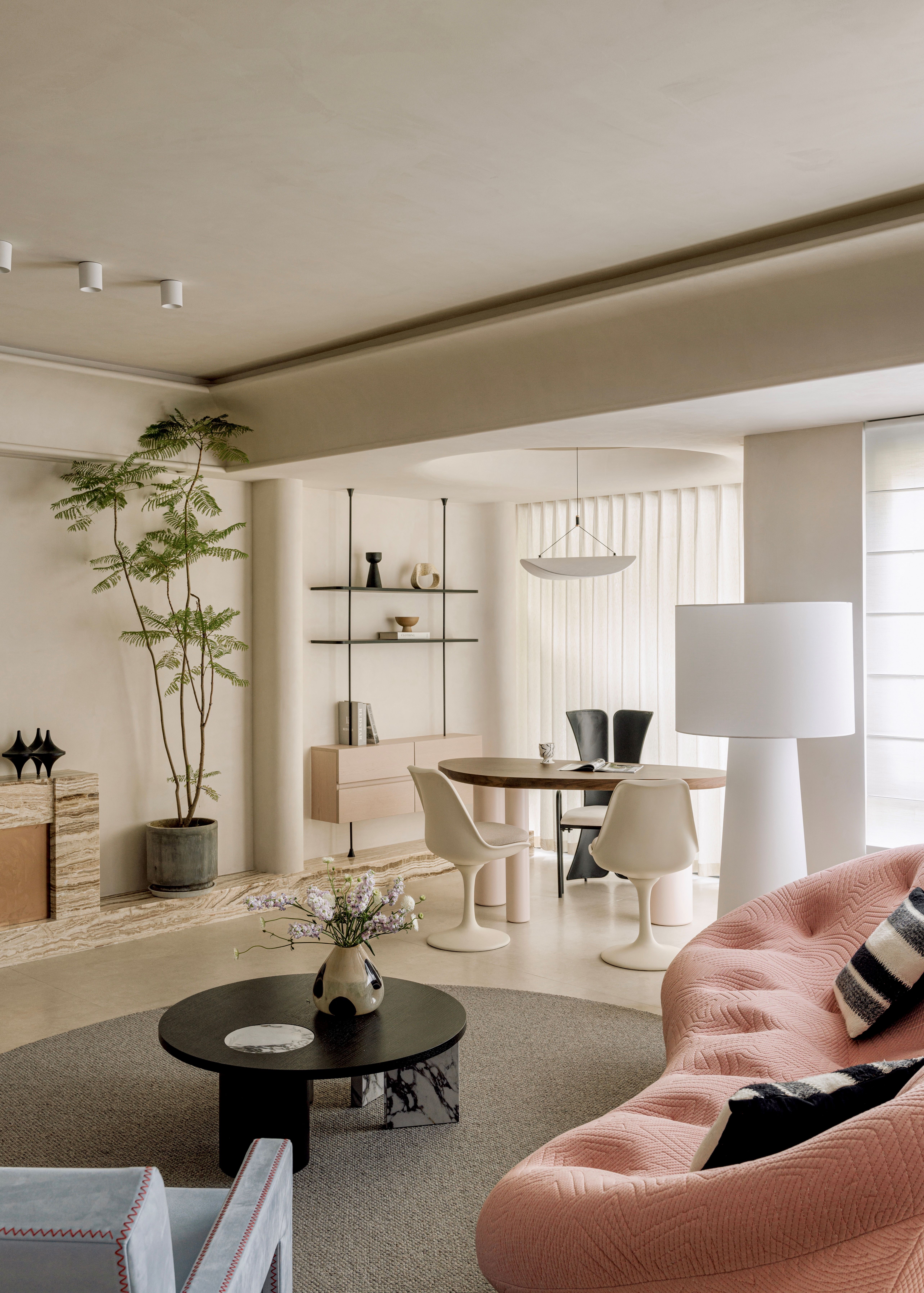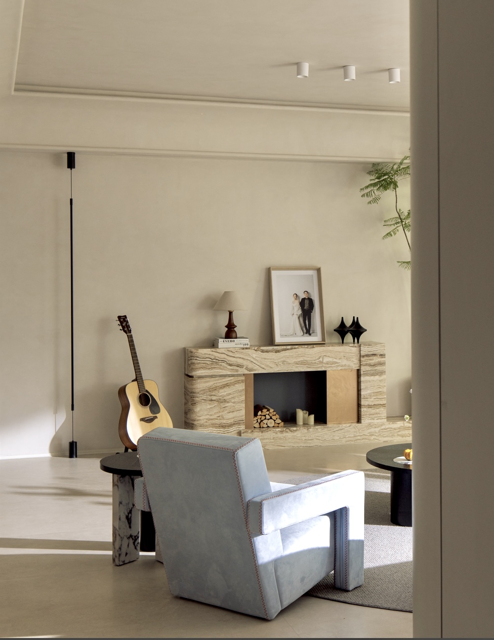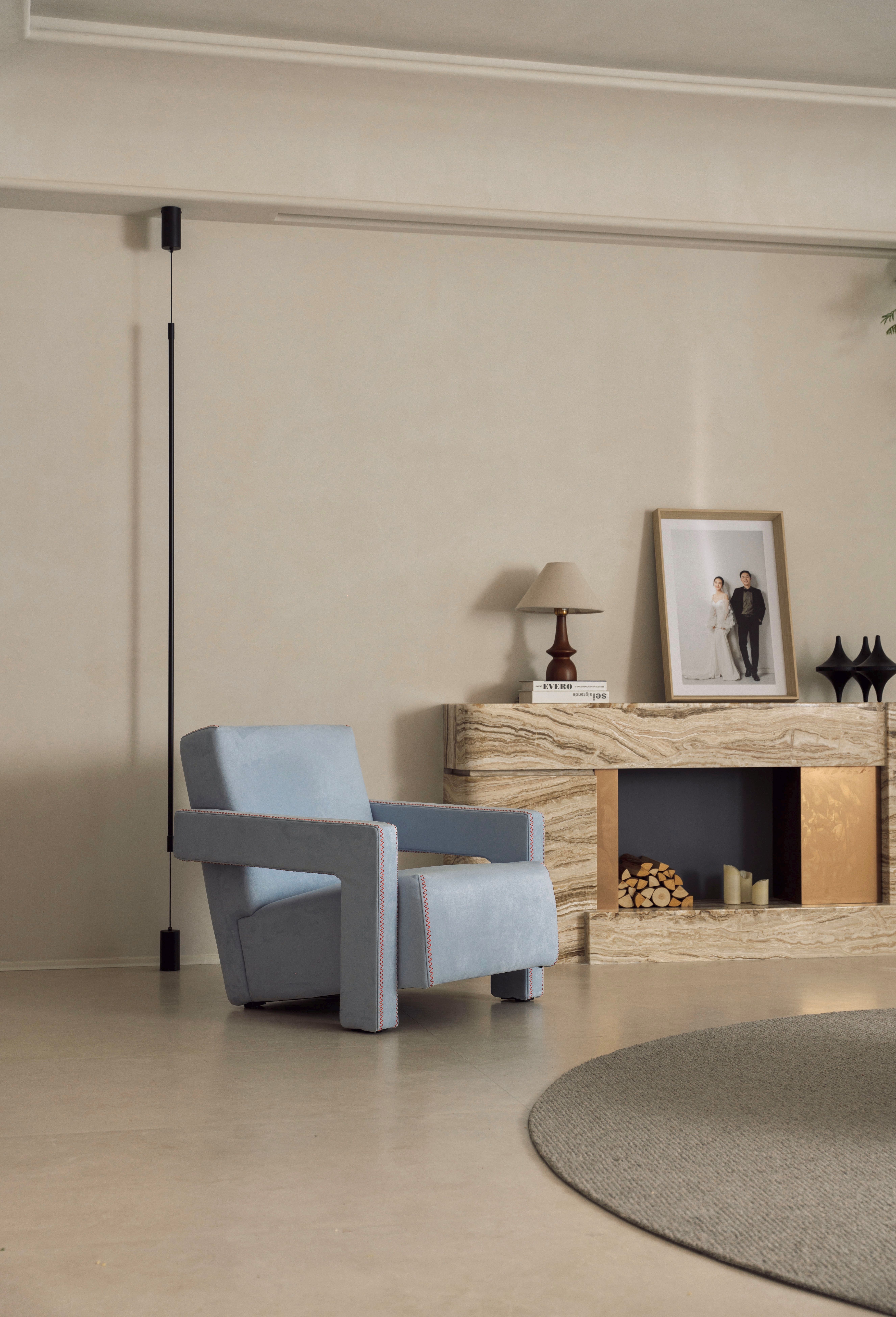 空间以粉色沙发与雾霾蓝单椅勾勒情绪曲线,温润原木与呼吸感洞石奠定大地基调。玉洞石壁炉如琥珀般凝结着地质时光的流动纹理,它不再仅是取暖之所,更是一座微型的地质艺术装置,成为视觉与精神的双重焦点。这是一处让材料自身叙事、让色彩随光歌唱的浪漫生命体。