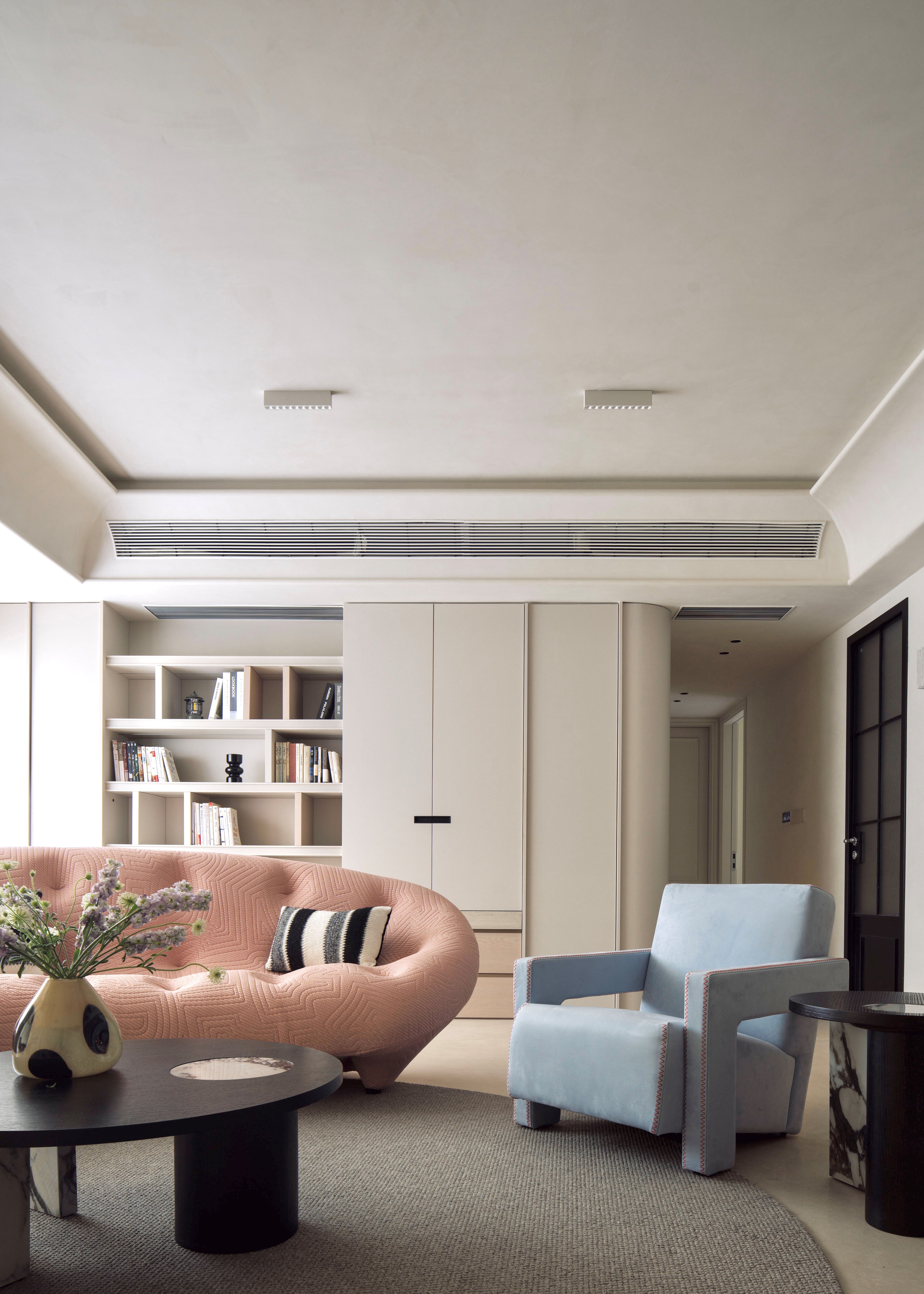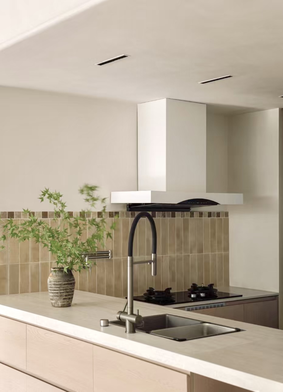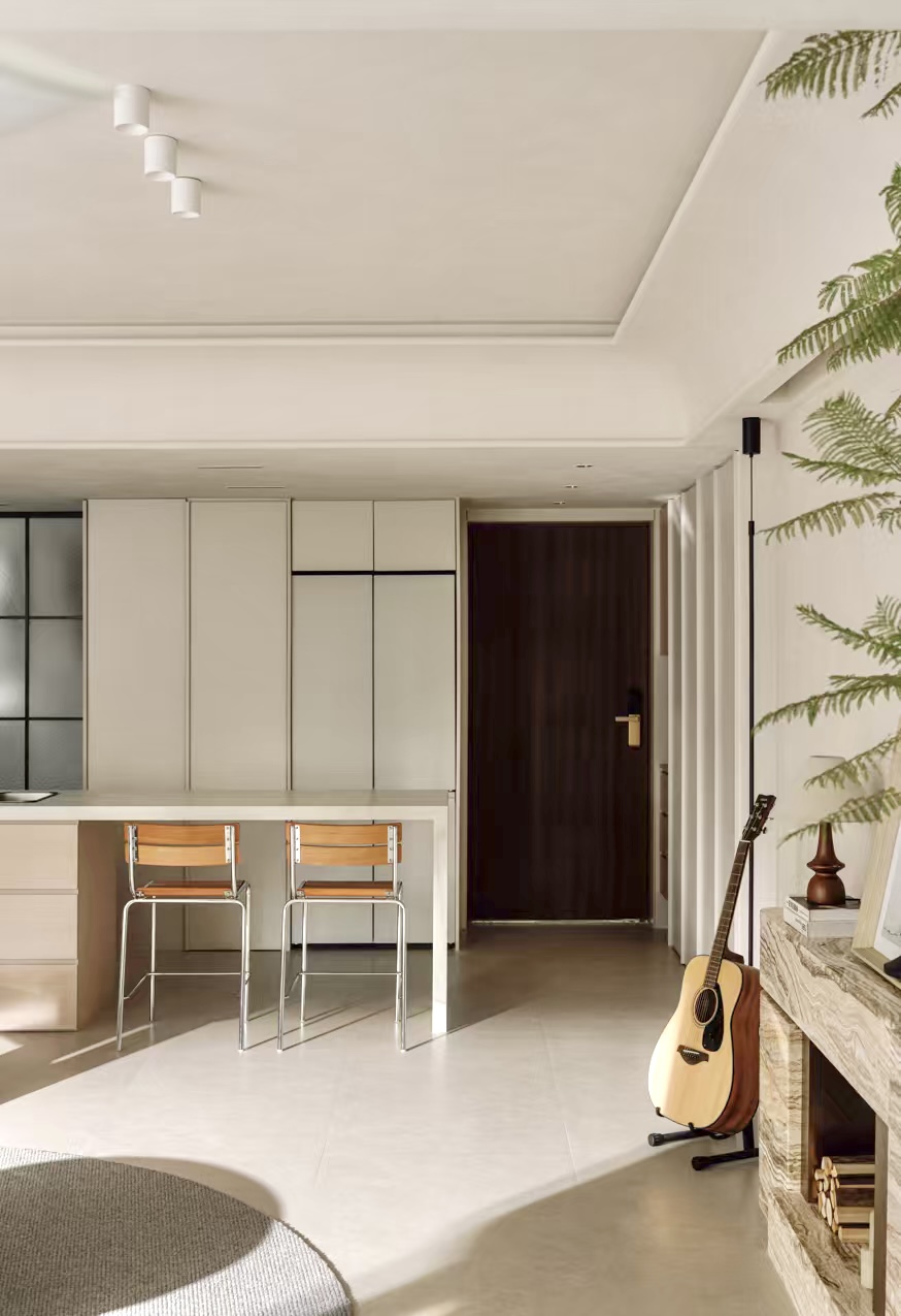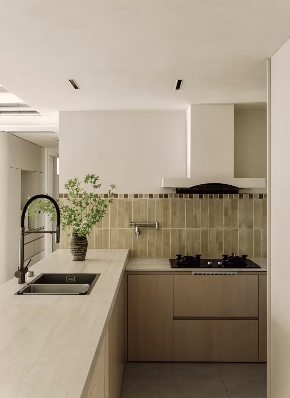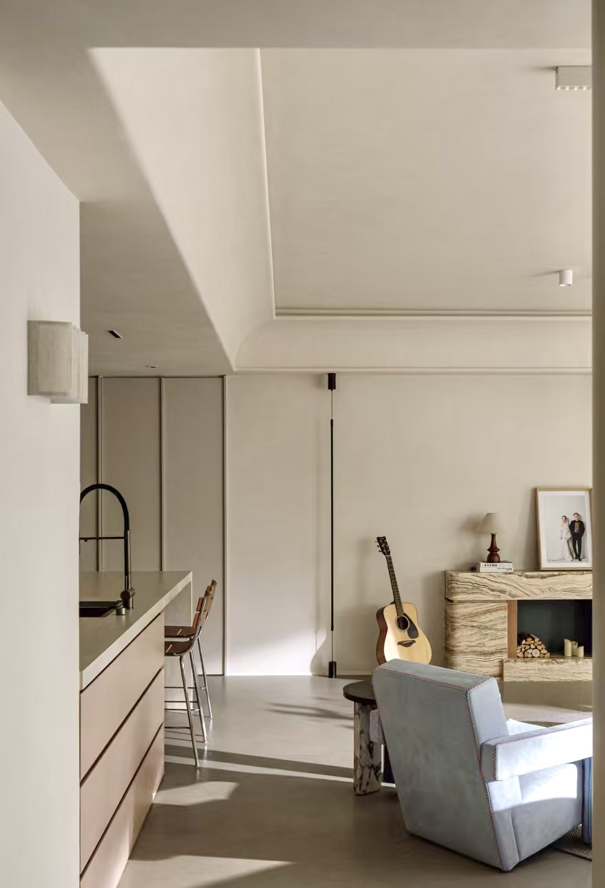设计选材:通过“粗犷原生肌理与极致细腻工艺的碰撞”——如洞石的天然孔洞与原木、奶茶白开放柜的平滑温润形成对话,以及“叙事性互动角落的营造”——开放柜层板间错落的留白如同“呼吸的间隙”,我们创造的不仅是一个空间,更是一场引领身心回归本源、唤醒内在浪漫的旅程。在这里,材料会说话,色彩会呼吸,静物皆可阅读。