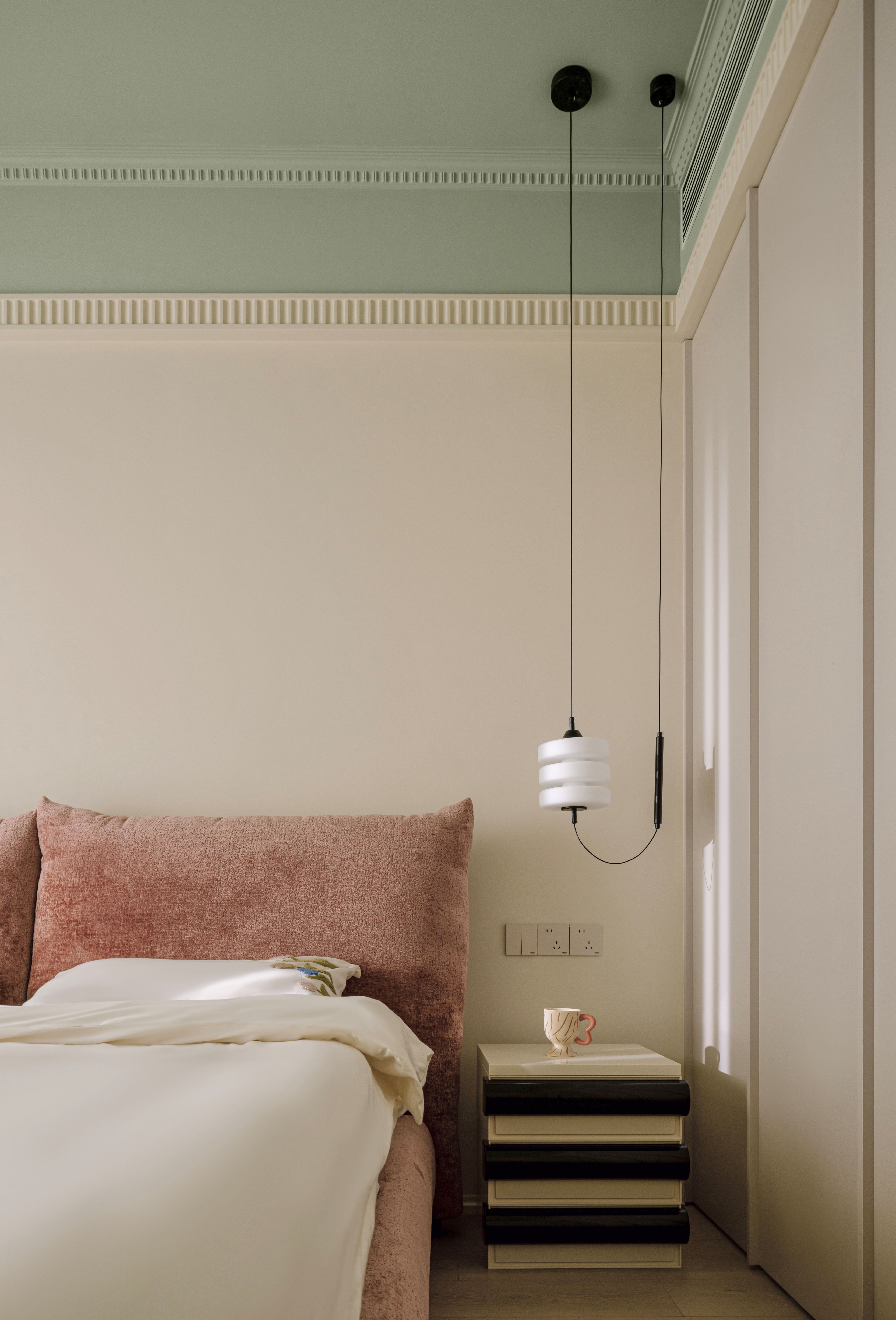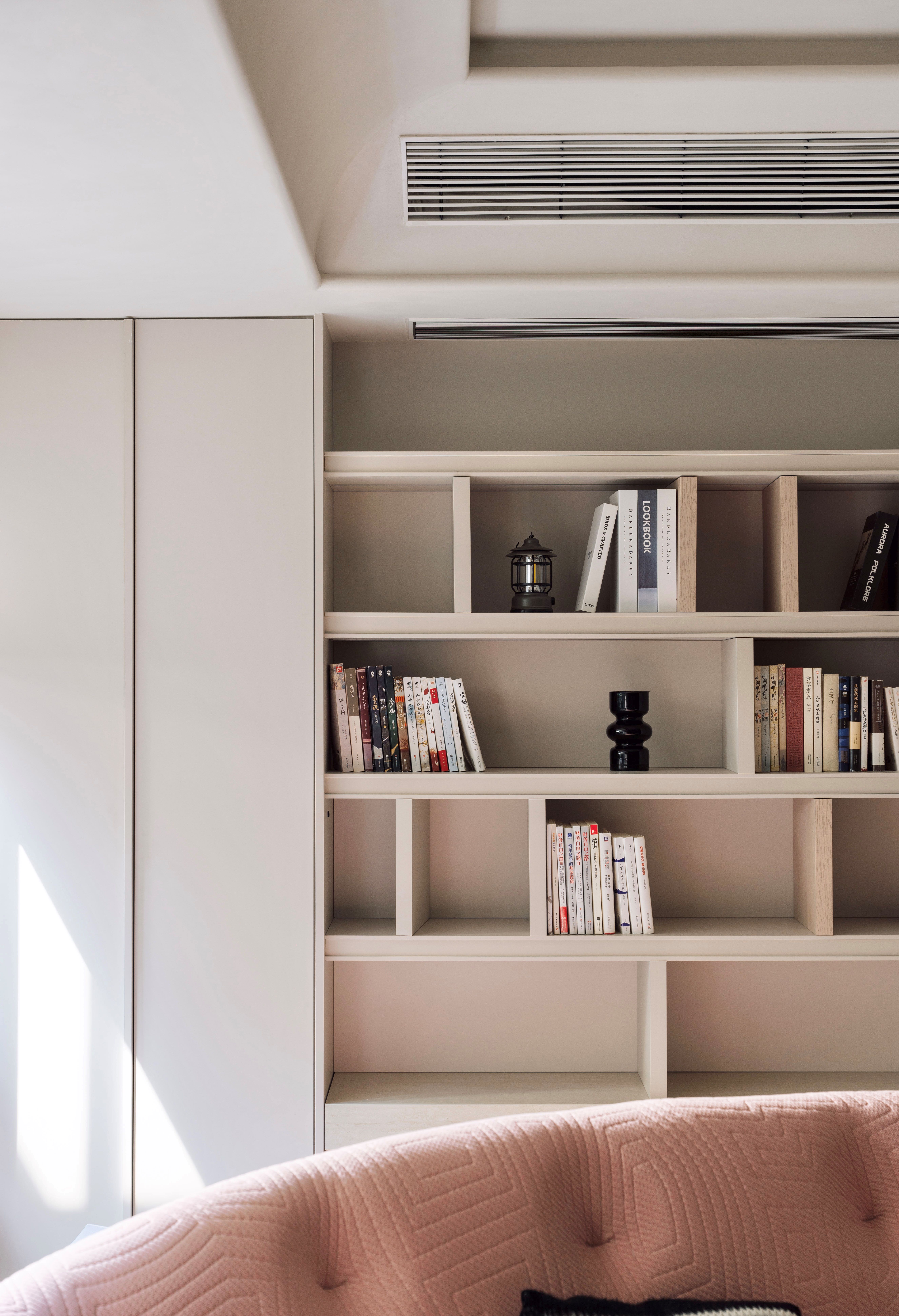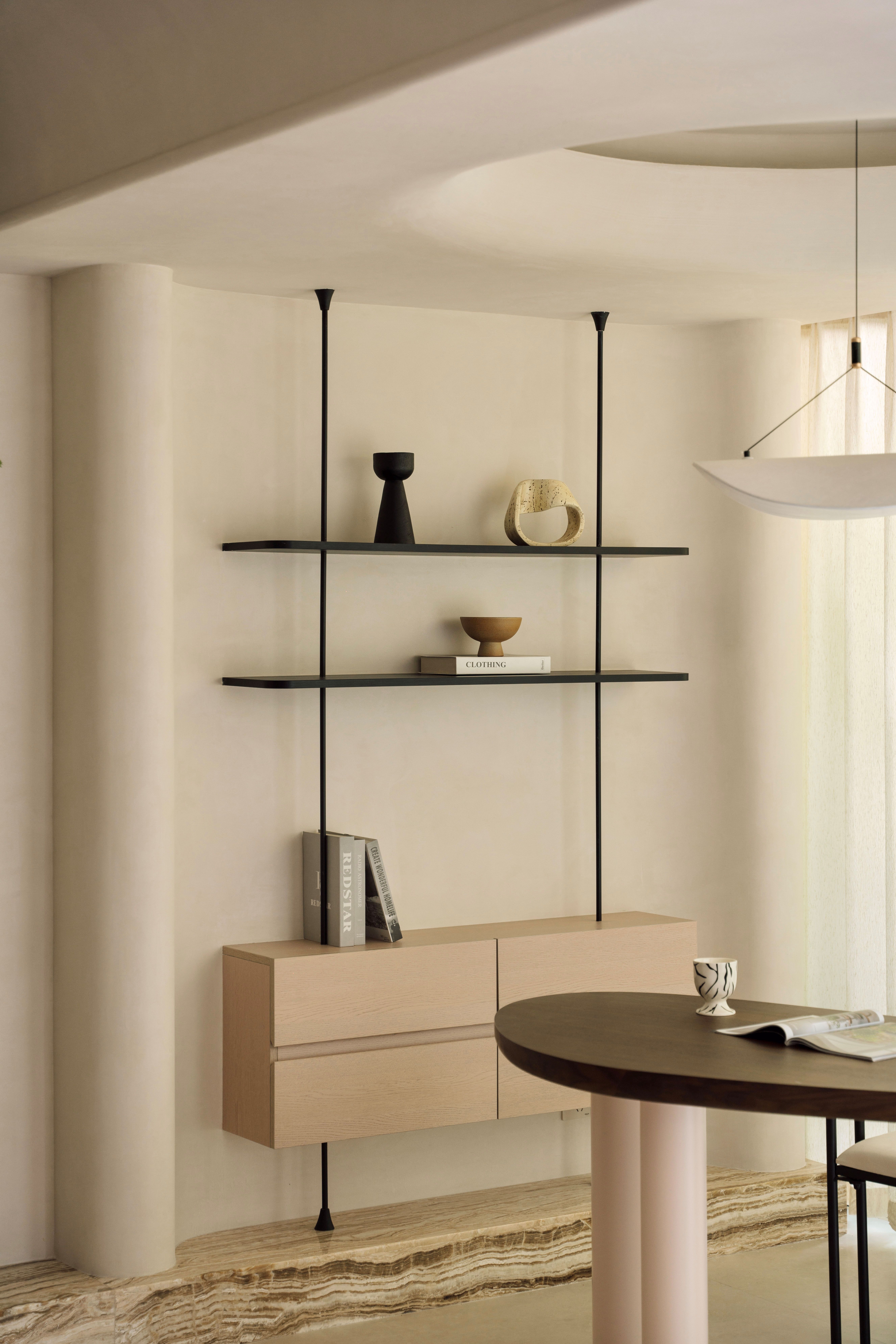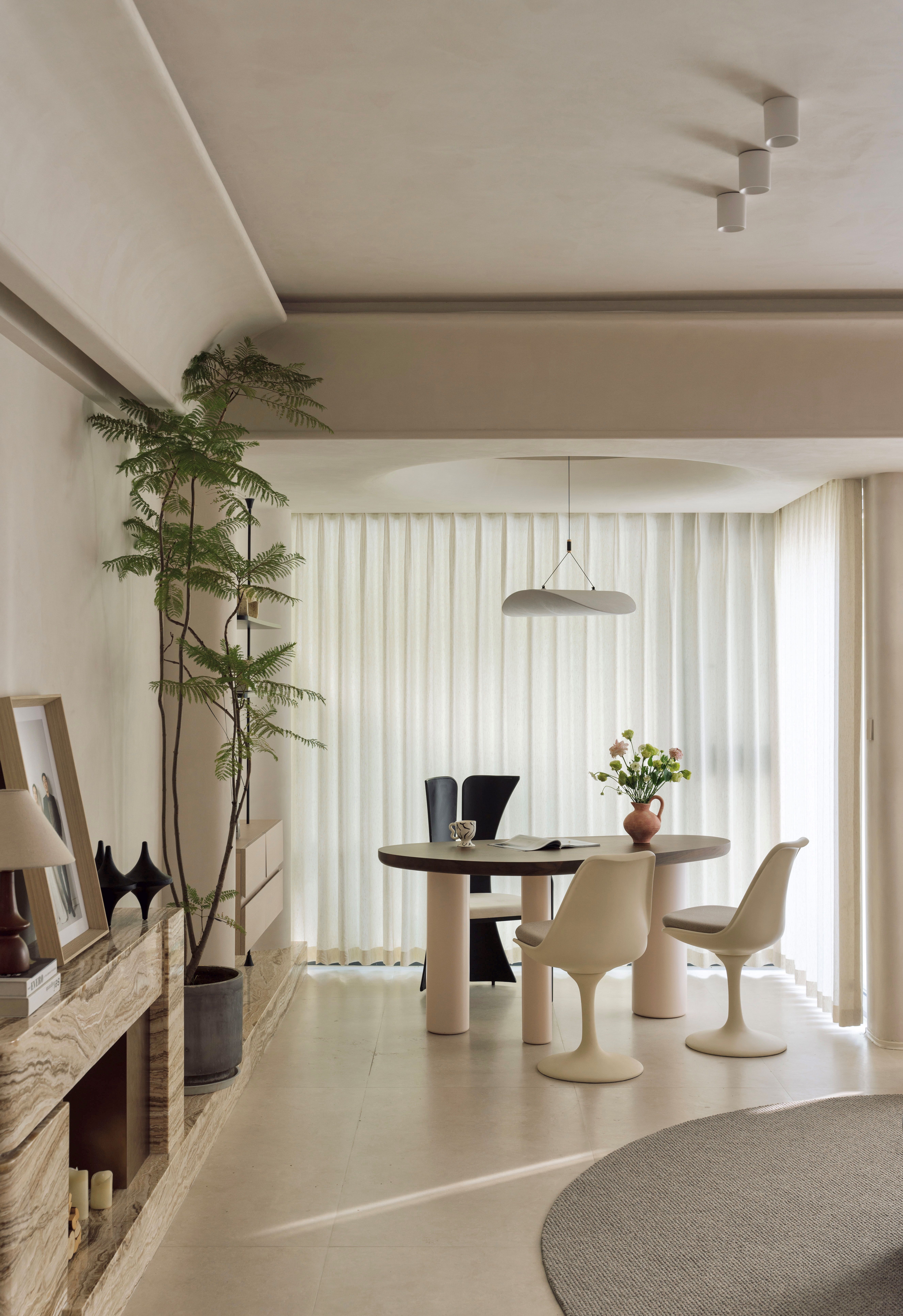 设计选材:通过“粗犷原生肌理与极致细腻工艺的碰撞”——如洞石的天然孔洞与原木、奶茶白开放柜的平滑温润形成对话,以及“叙事性互动角落的营造”——开放柜层板间错落的留白如同“呼吸的间隙”,我们创造的不仅是一个空间,更是一场引领身心回归本源、唤醒内在浪漫的旅程。在这里,材料会说话,色彩会呼吸,静物皆可阅读。