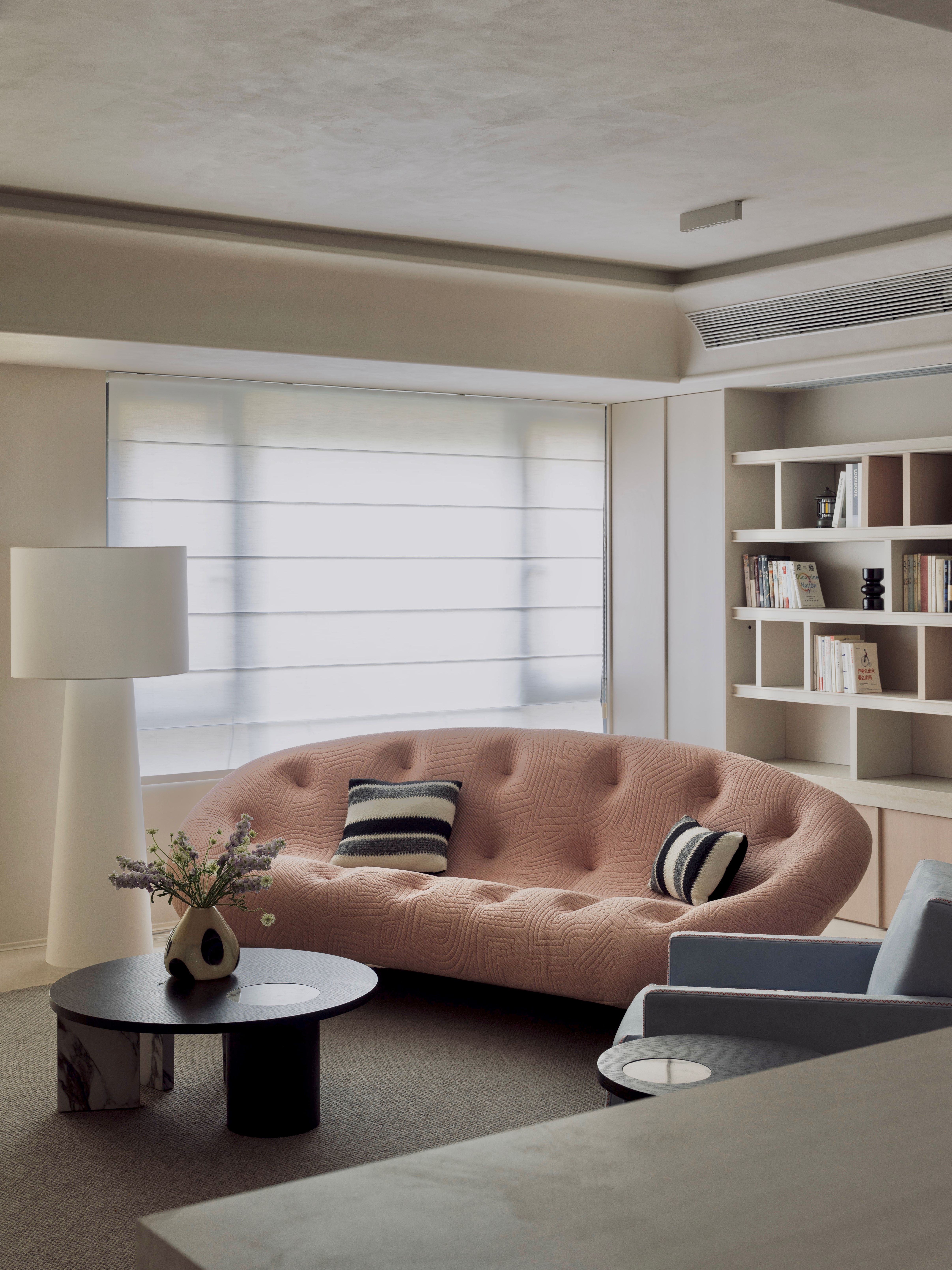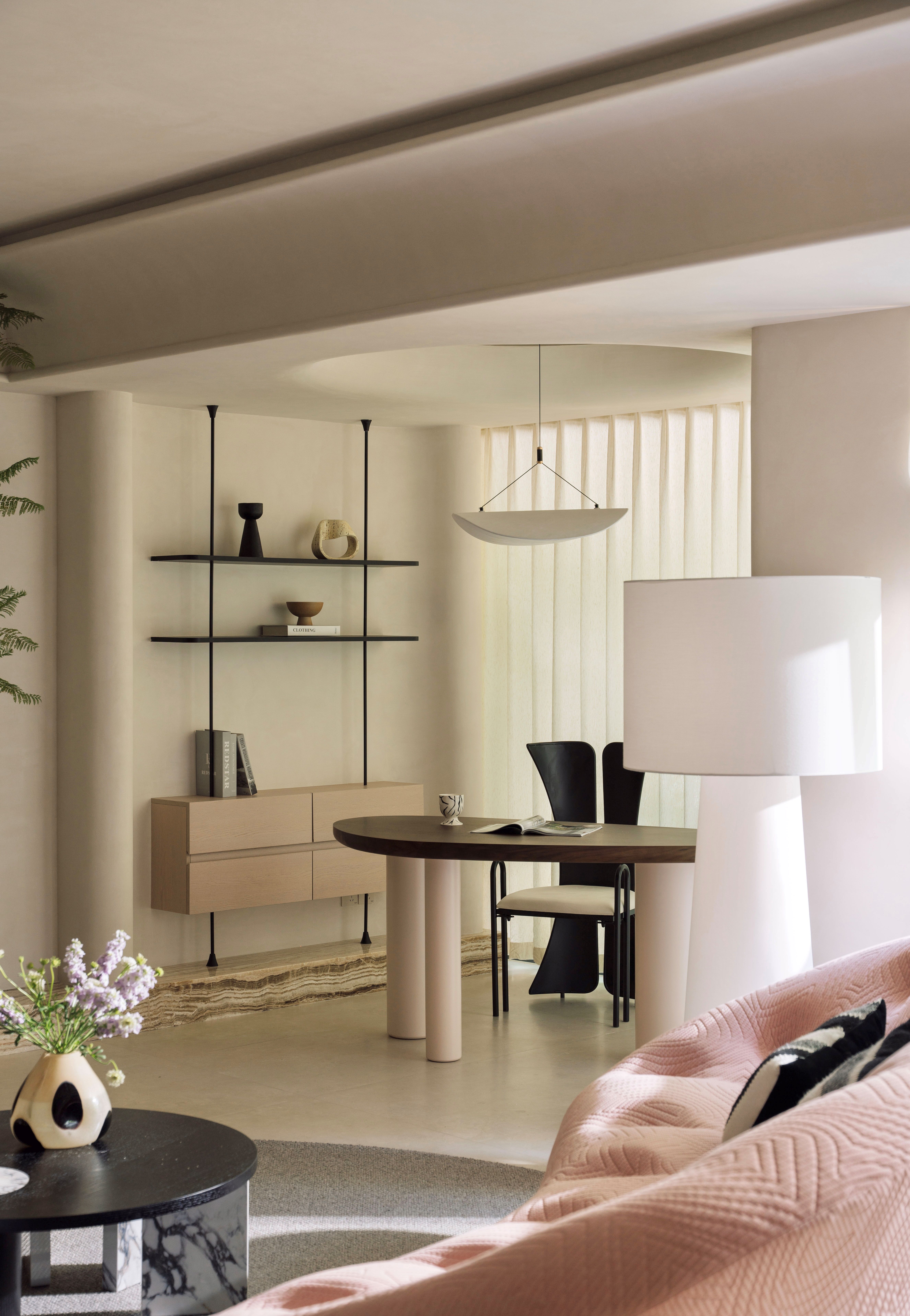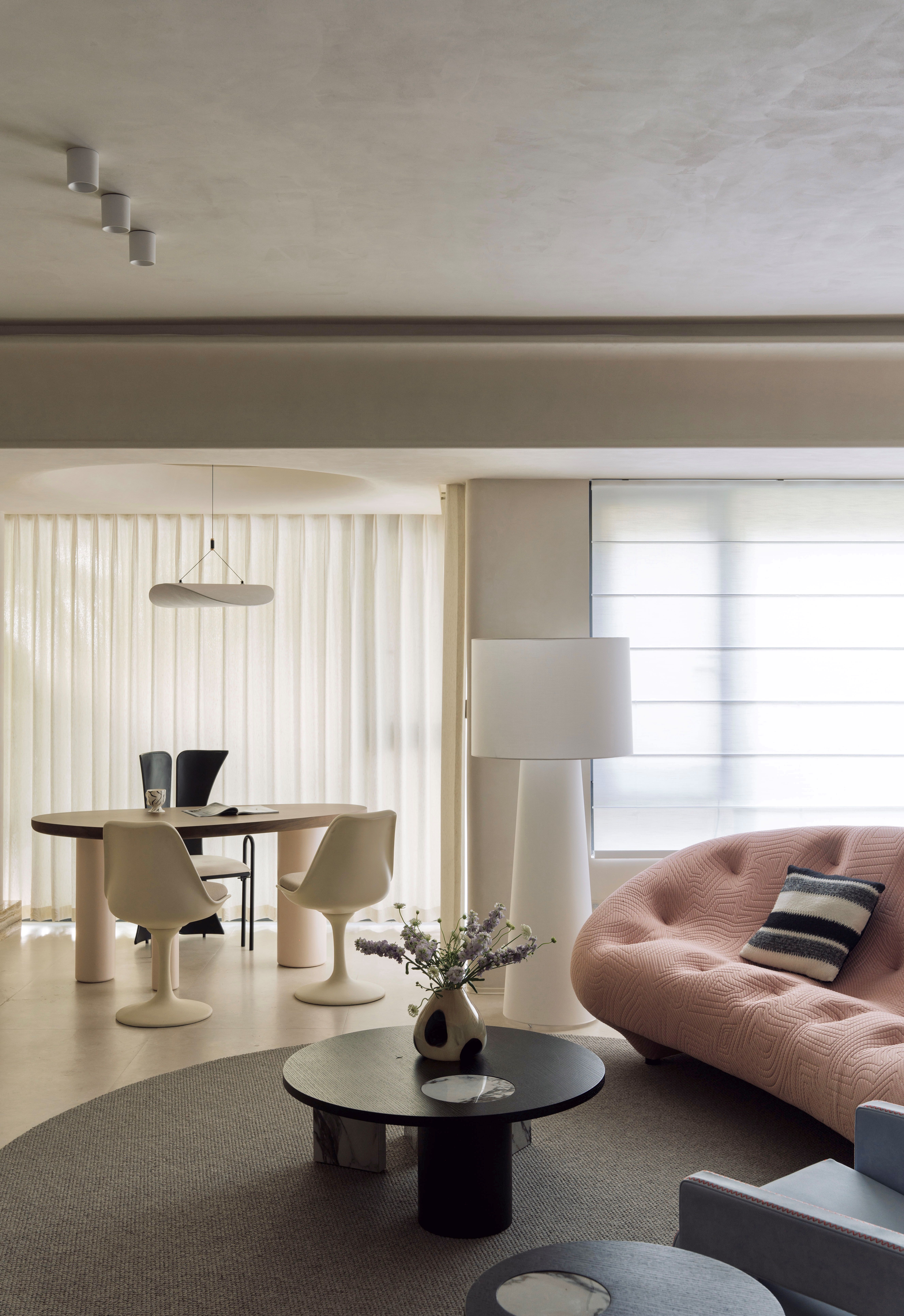 客厅去掉传统电视墙,让空间可以根据软装场景随意切换,让客厅与餐厨、办公形成开放式一体化,不同场景之间可以相互交流,是我非常喜欢的一种生活状态,可以增加与家人之前的情感链接 -