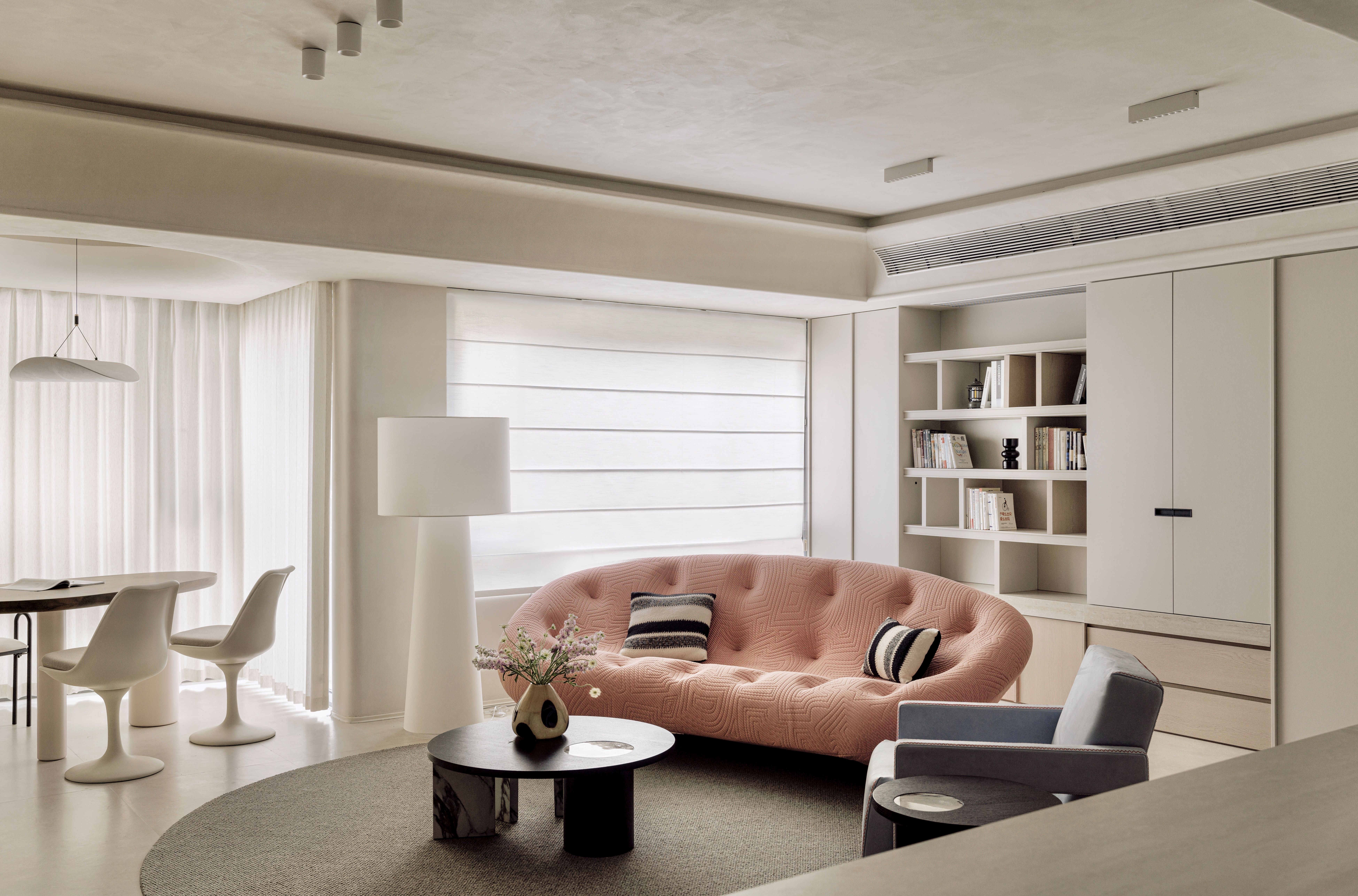 把小阳台打通融入到室内做为喝茶办公区域,阳台落水管包裹做成造型书架,椭圆书桌人多时还可以做为独立的用餐区域,坐8-10个人完全没问题非常nice