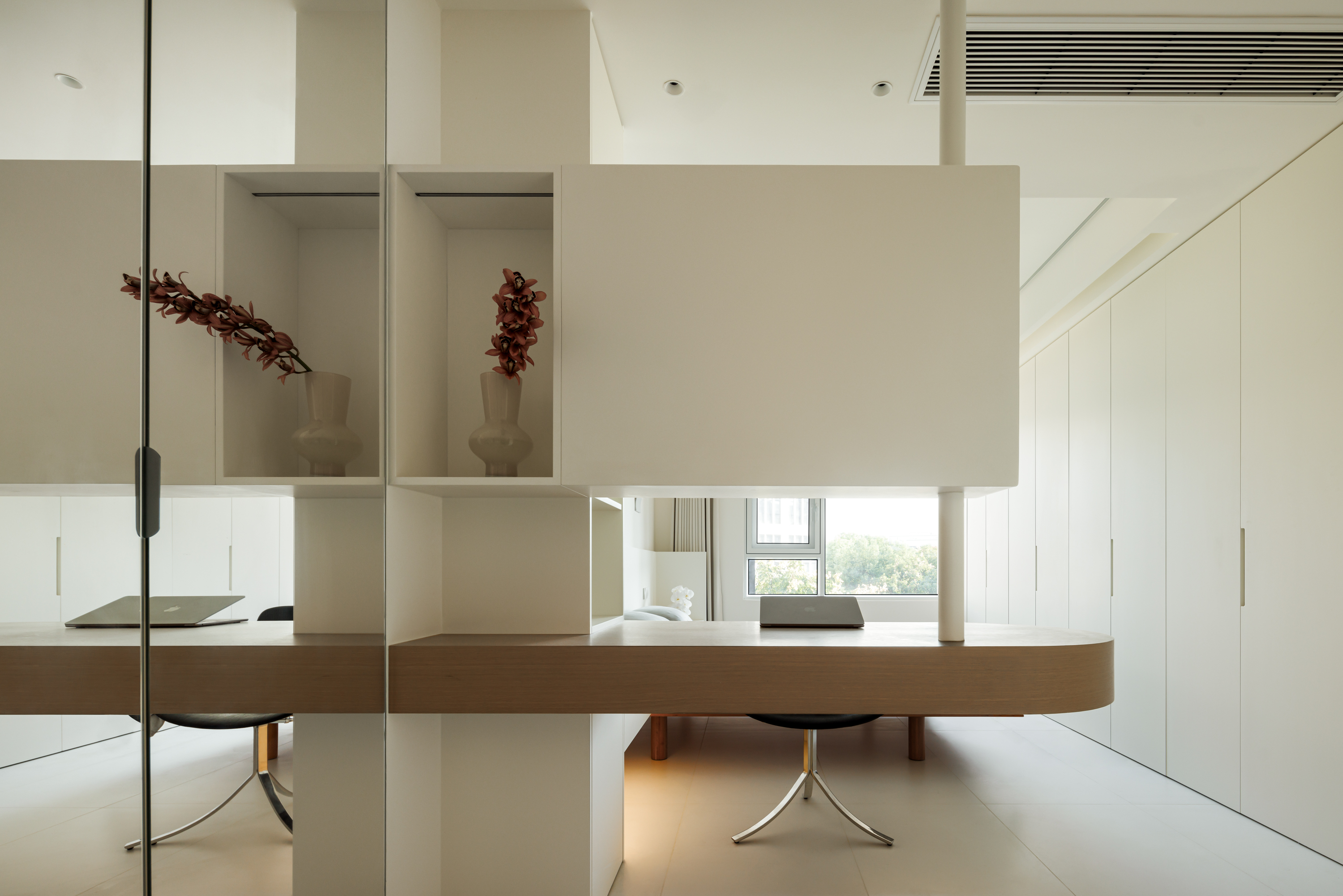 收纳即立面,占比高达19%:所有收纳均结合墙体与动线进行定制化设计(如入口储物间、床尾满墙柜、镜面柜隔断等),实现物品就近、隐形存放,使空间在满足超强储物需求后仍保持整洁与开阔。 -