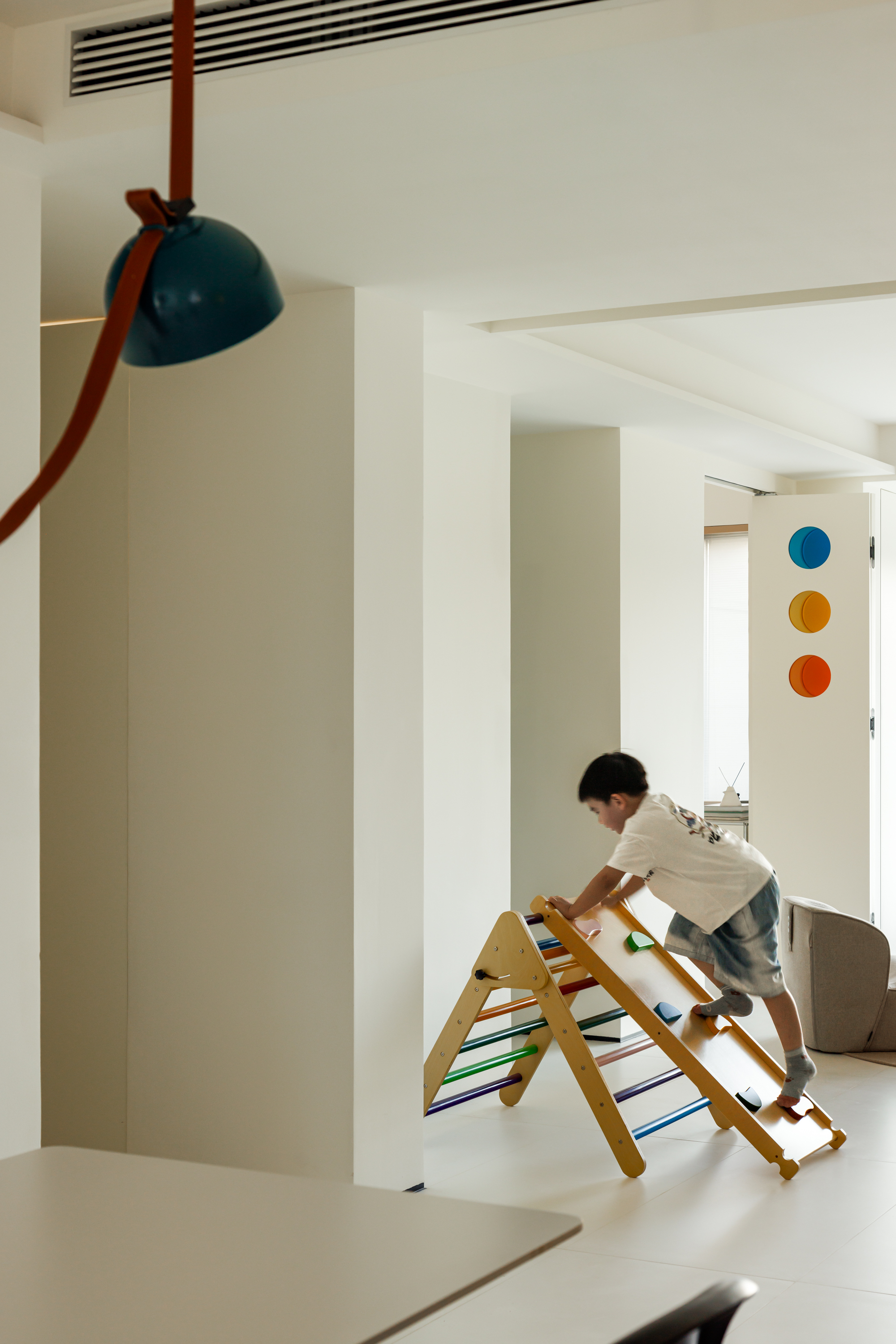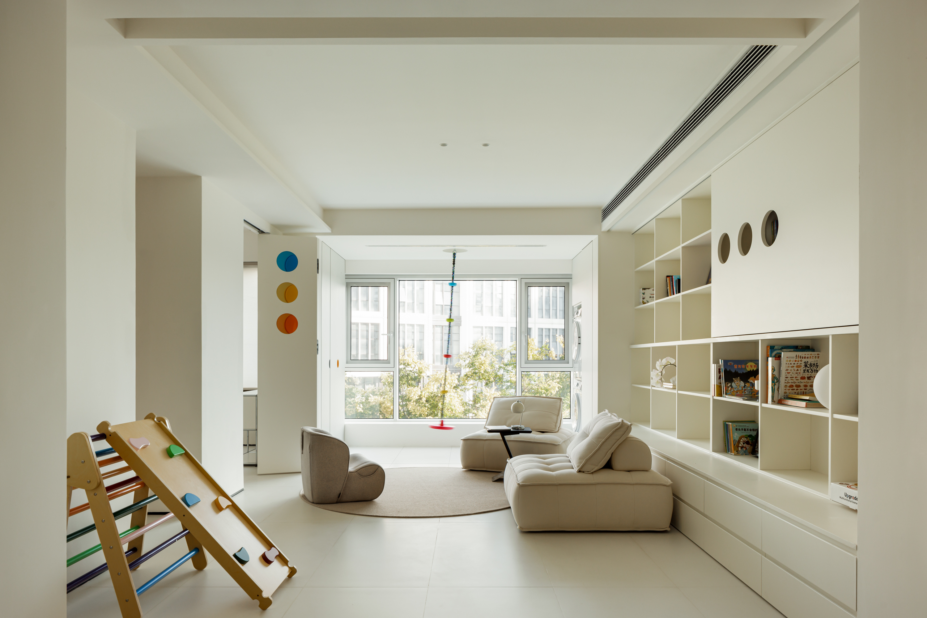 游戏设施家居化:在生活阳台嵌入儿童秋千,结合客厅书架墙设计攀岩点,将活动自然融入日常动线。