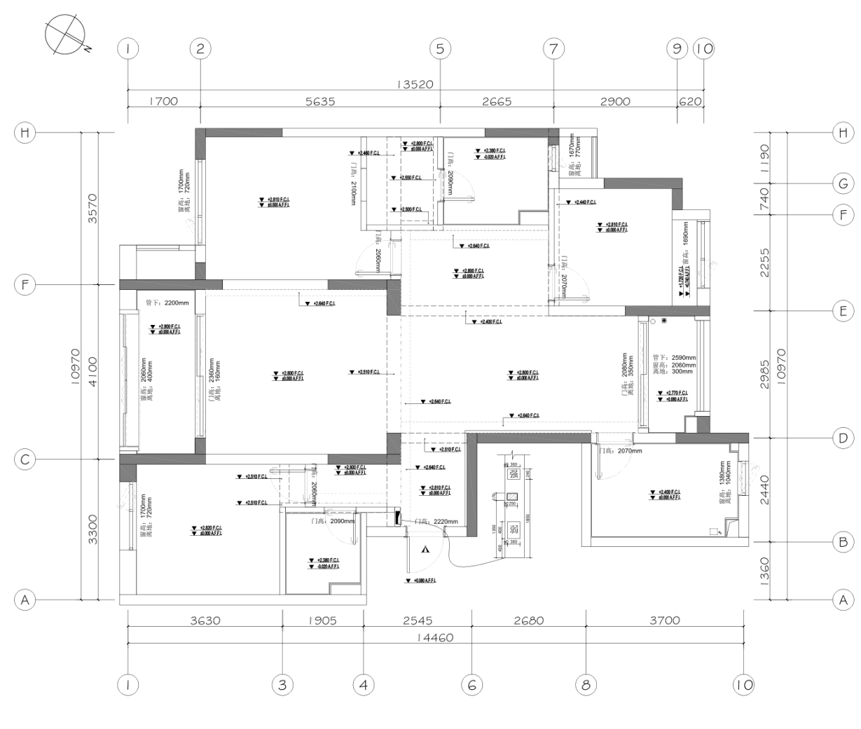 原始平面图 1. 原户型空间未被完全利用 2. 过道空间浪费,动线不合理 3. 东南角房间距离门口过近