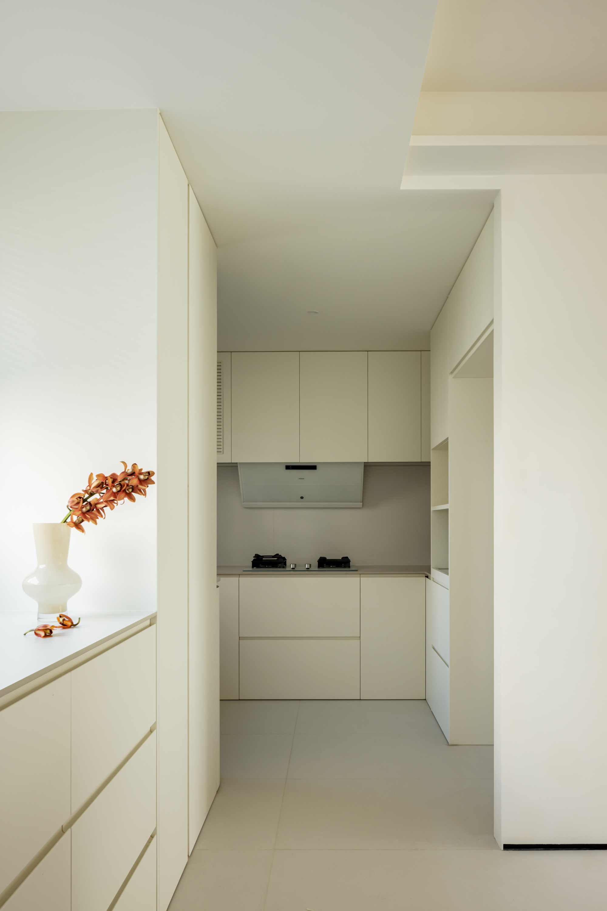 内包两个阳台,换来一个“一眼看到底”的家。妈妈在岛台烘焙,爸爸在沙发工作,宝宝在地毯玩耍。最好的陪伴,是各自忙碌,抬头就能看见彼此。