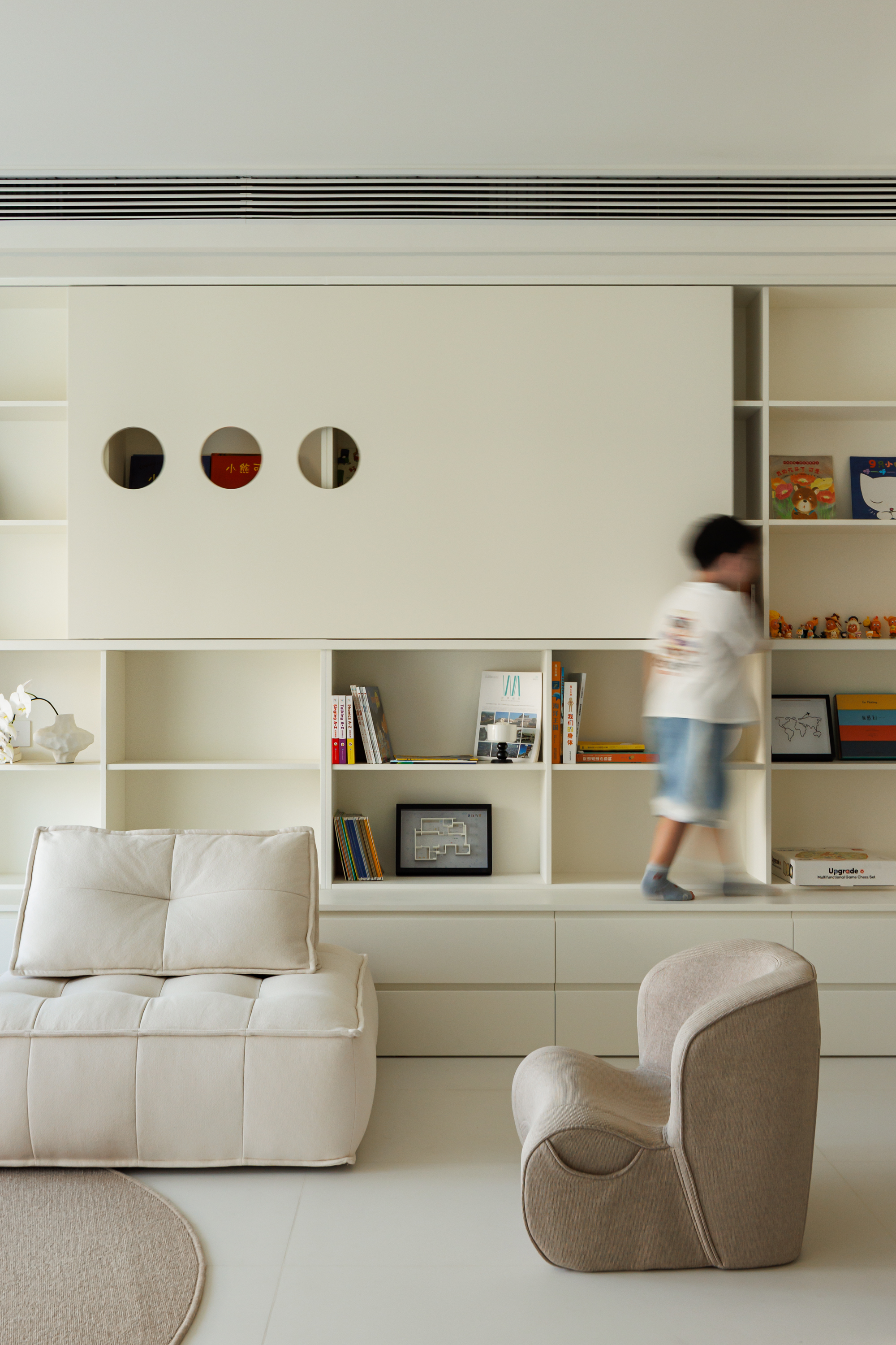 客厅摈弃传统电视墙设置投影与整面书架,放大储物且把图书馆和游乐场搬进家。