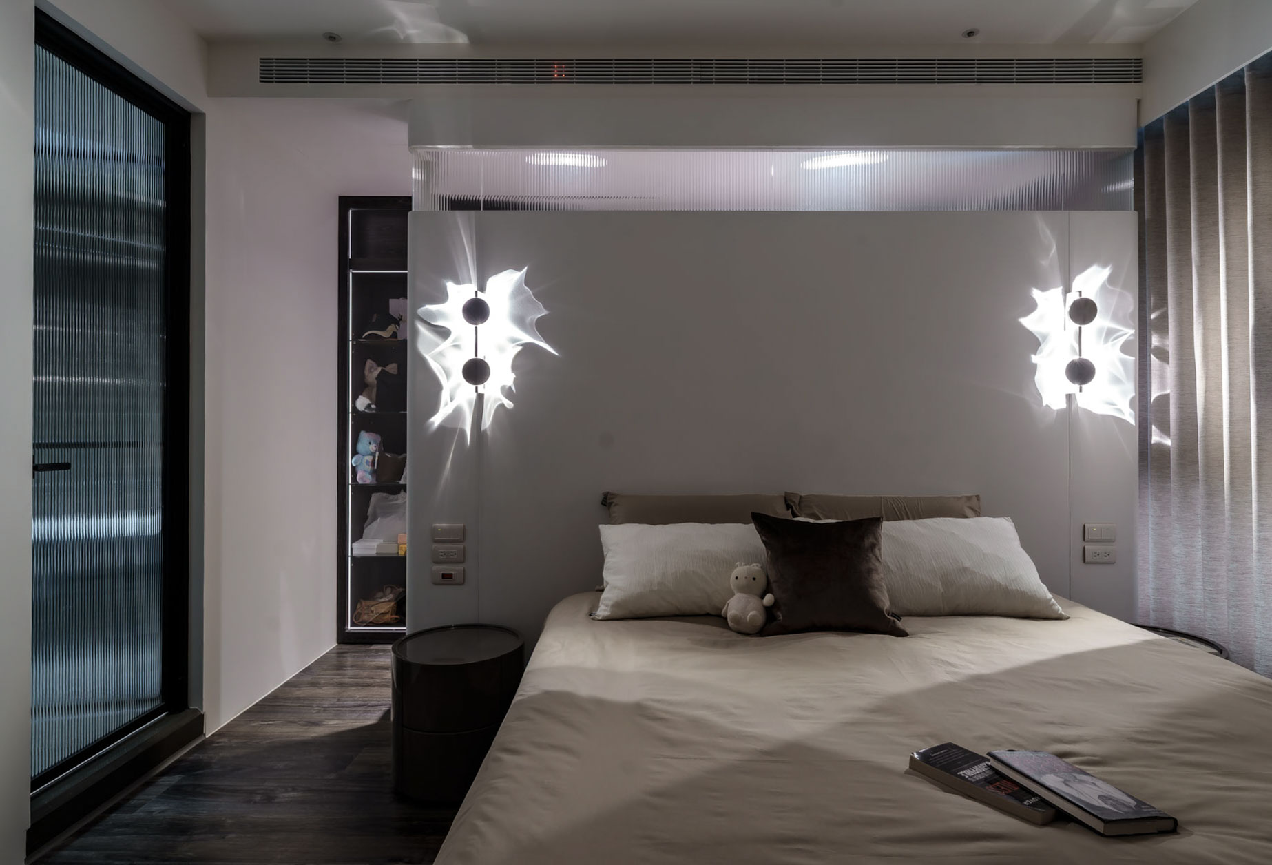 臥室區域則以低調而舒適為導向,整體尺度與材質延續公共空間,保持一致的色彩與材質基調,創造安靜且連貫的整體感受。床頭牆選用細膩塗裝與半透明材質,光線穿透後形成如同水面般細緻的流動感,與整體空間中對「流動與秩序」的設計理念呼應。照明設計以局部聚光為主,為私密空間營造出輕柔卻富有層次的視覺深度,配合隱藏式光源,讓臥室在不同使用情境中展現不同氛圍。 -