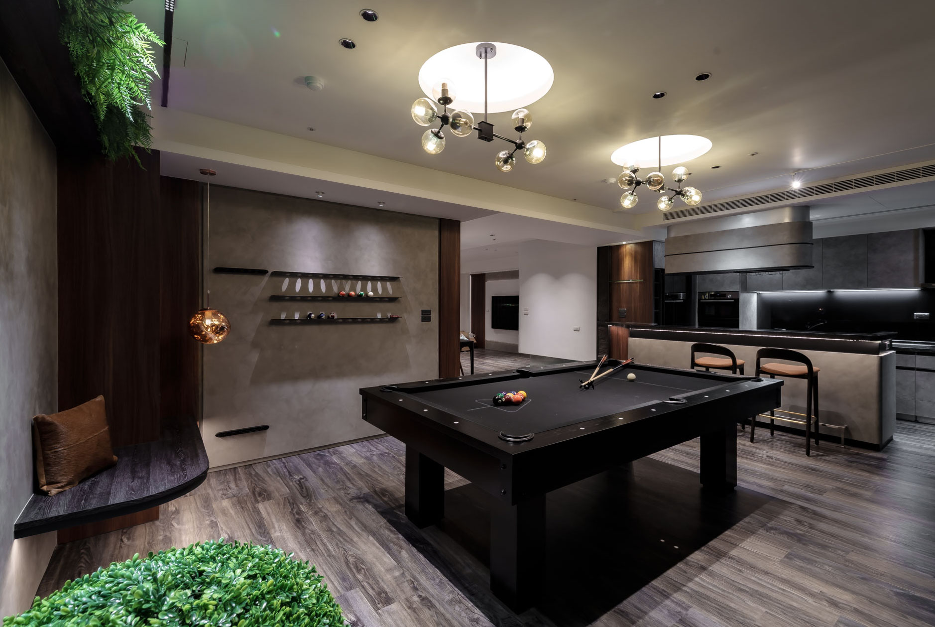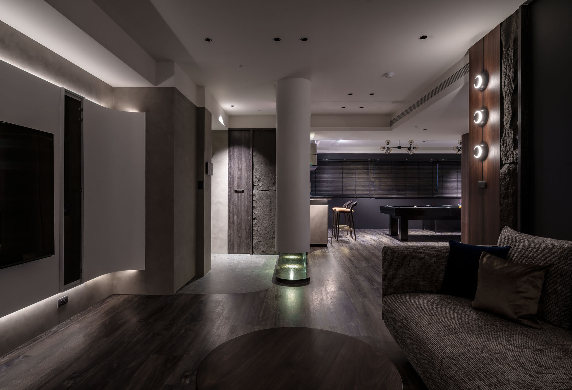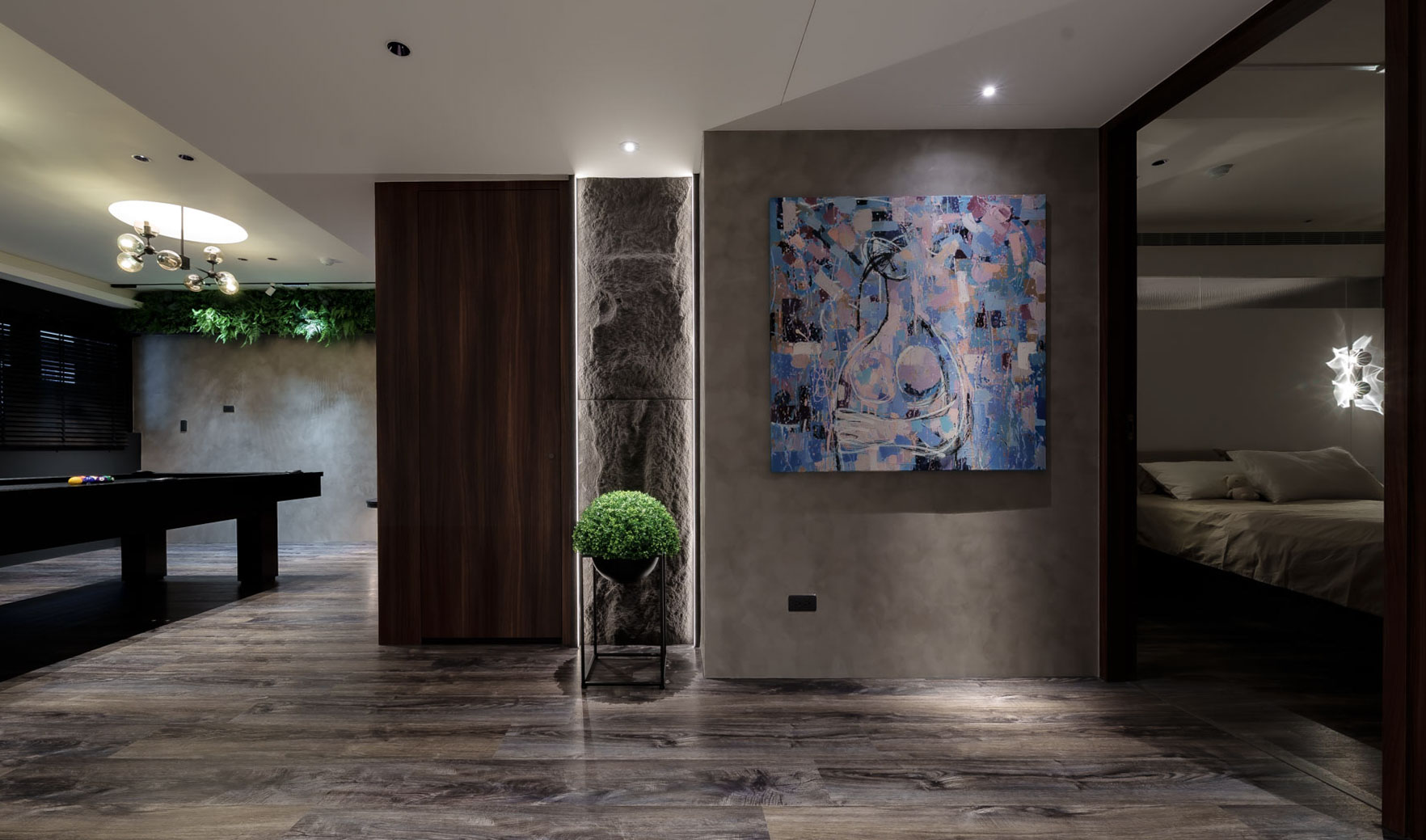 空间布局:進入客廳區域,空間整體開放但分區清晰,藉由吊燈與天花燈槽區分不同功能場域,讓客廳與後方吧台及娛樂空間形成相互呼應又互不干擾的動態關係。深色地坪沿整個視野延展,提供視覺連貫性;垂直方向則透過牆面材質與燈具層次形成秩序感:一側為平整深色塗裝背景,懸掛藝術畫作,另一側則運用岩石與木紋,為視覺與觸覺增添粗獷又溫暖的對比,展現出自然元素與現代語言的共融。