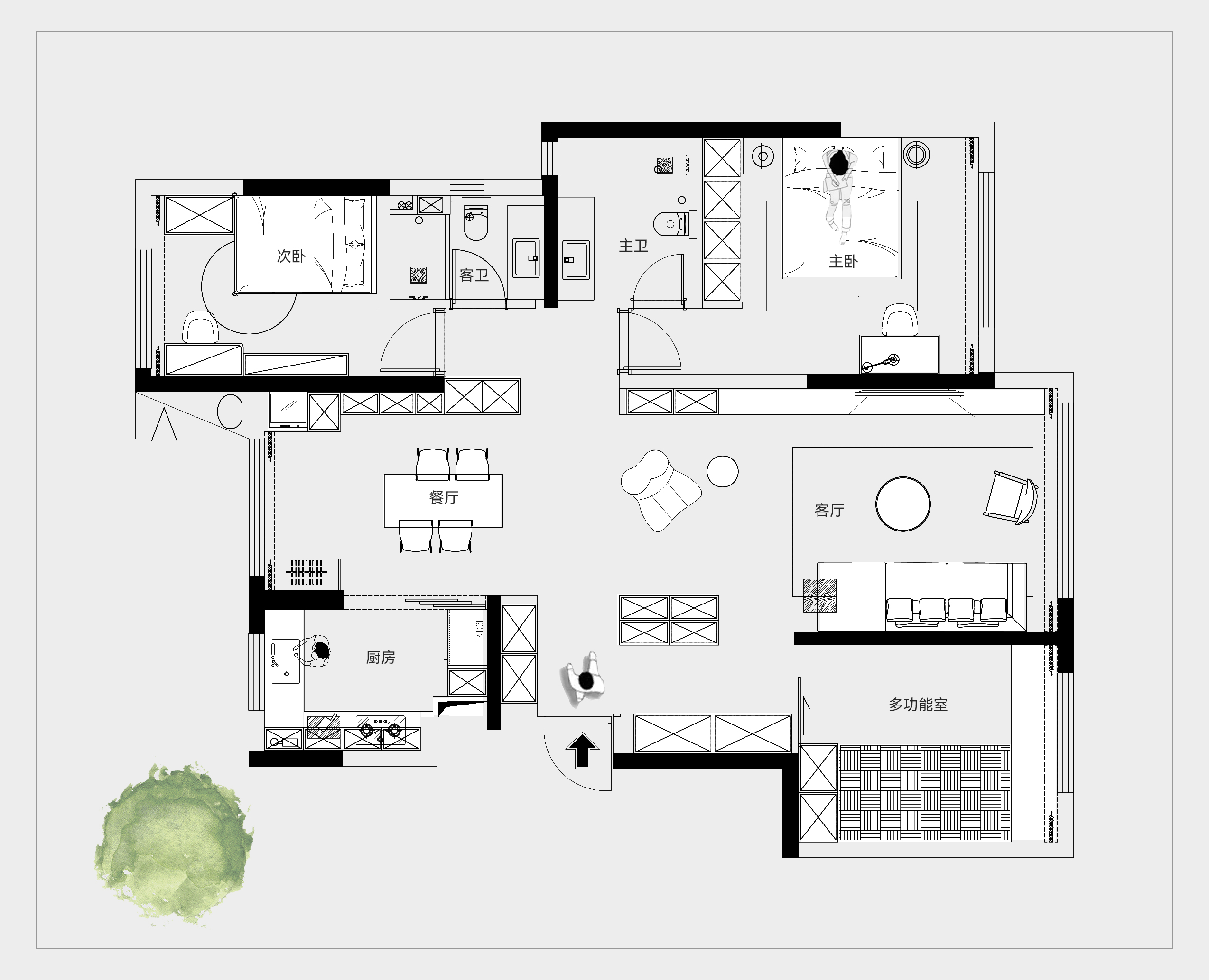 将南北两个阳台墙垛拆除,将阳台空间纳入客餐厅,极大程度的开放客餐厅区域,增加通透感