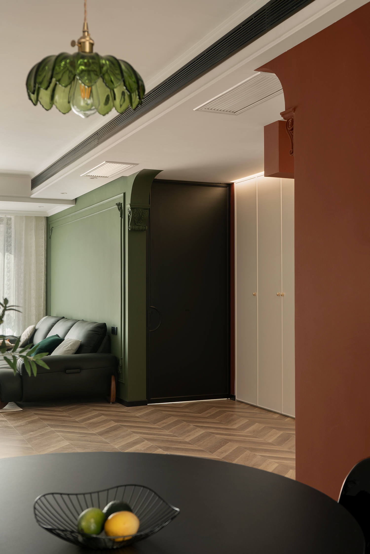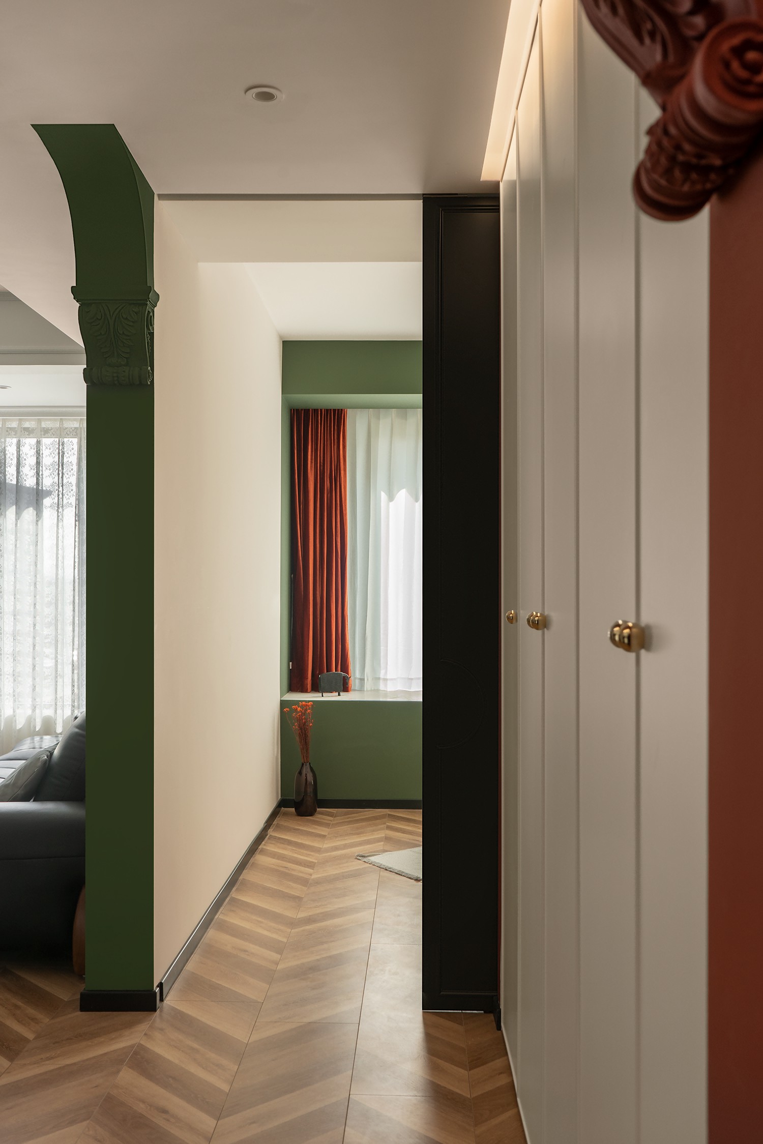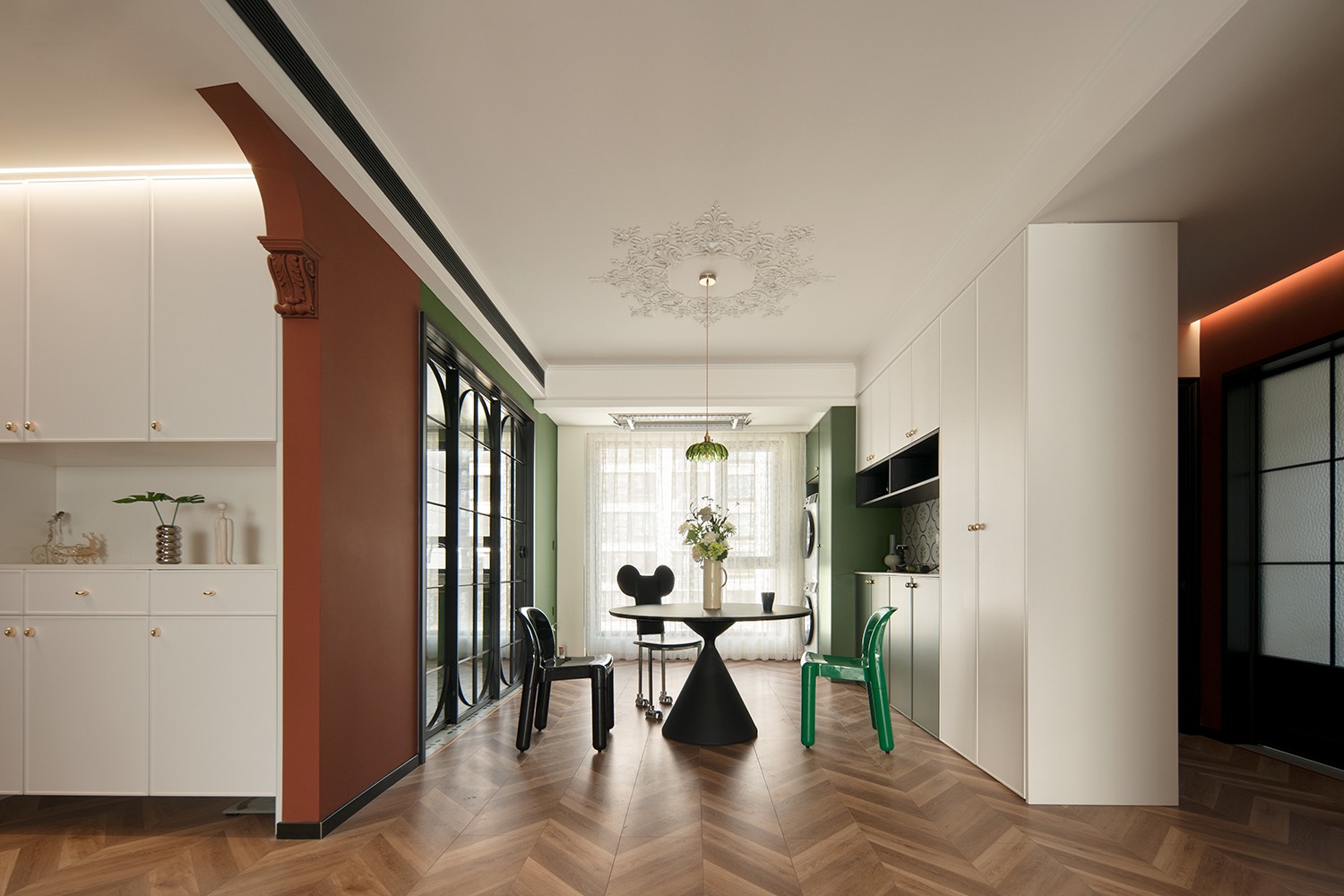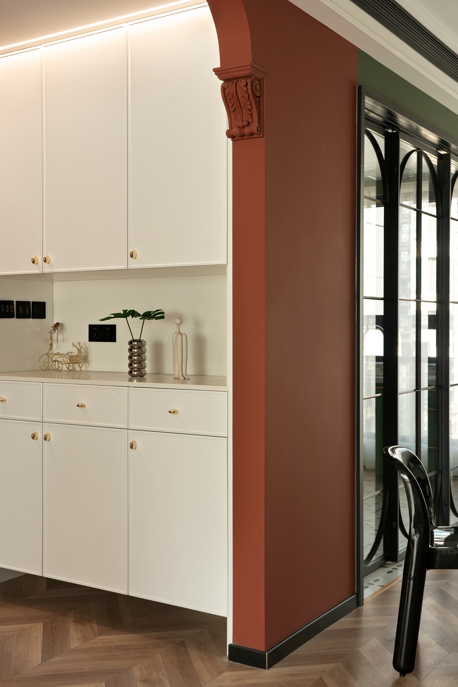 朱红色与墨绿色相互碰撞,古典的拱门造型,带有浓郁的宫廷色彩,又富含感性,优雅的格调带着真实的古朴和原味的典雅。