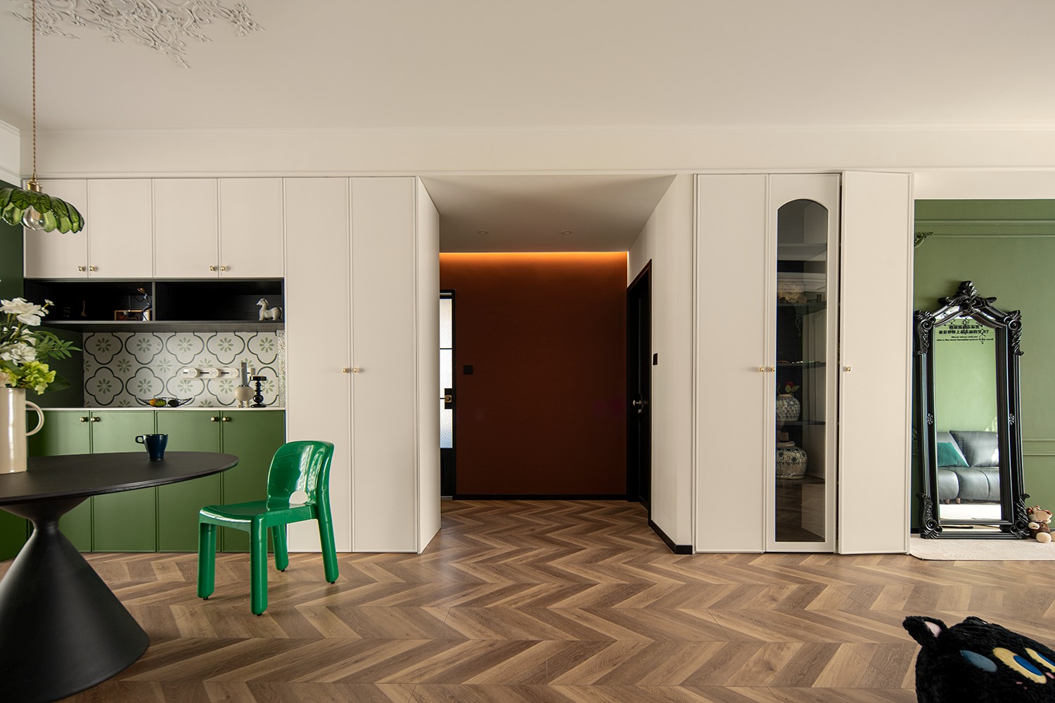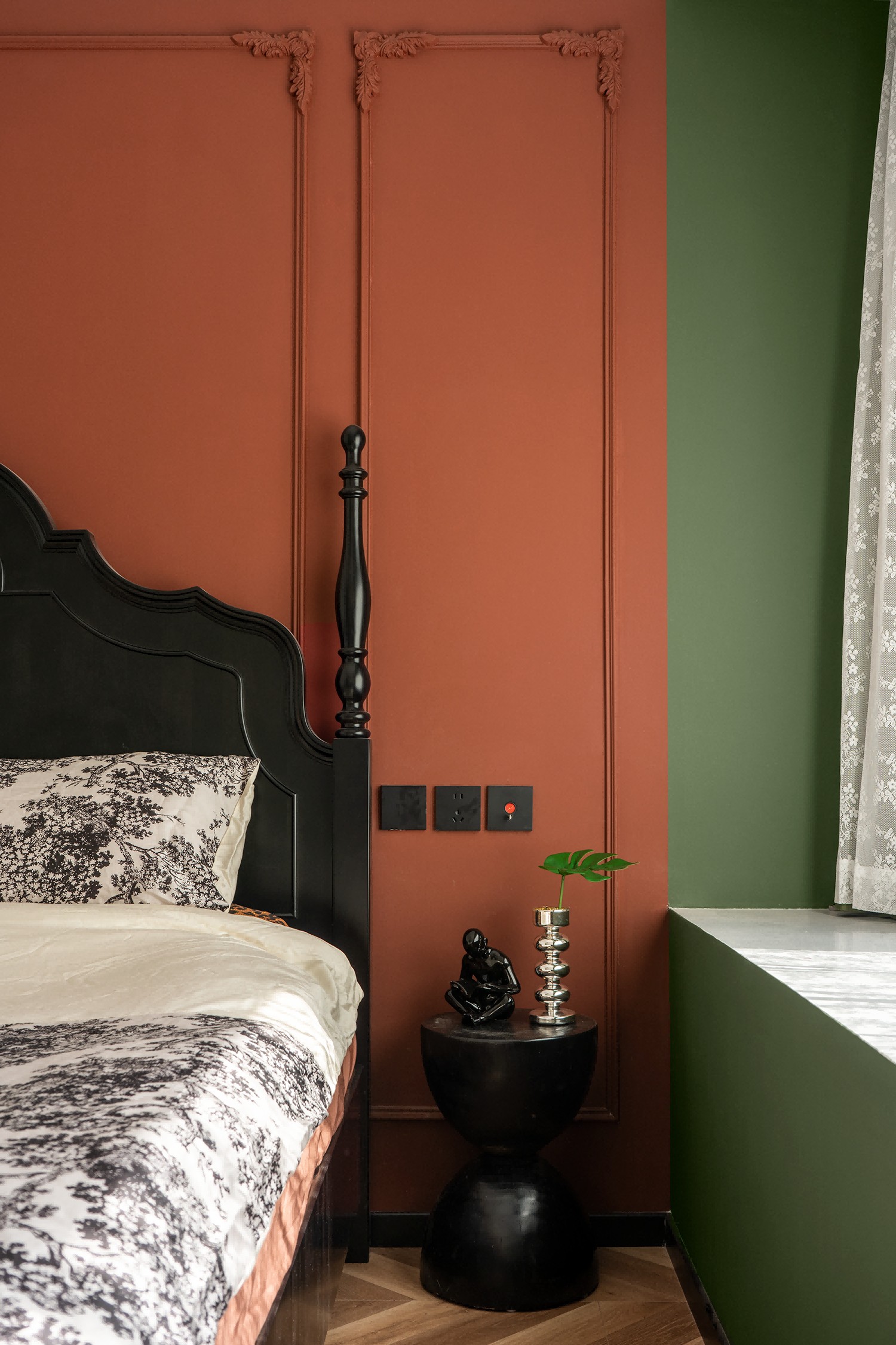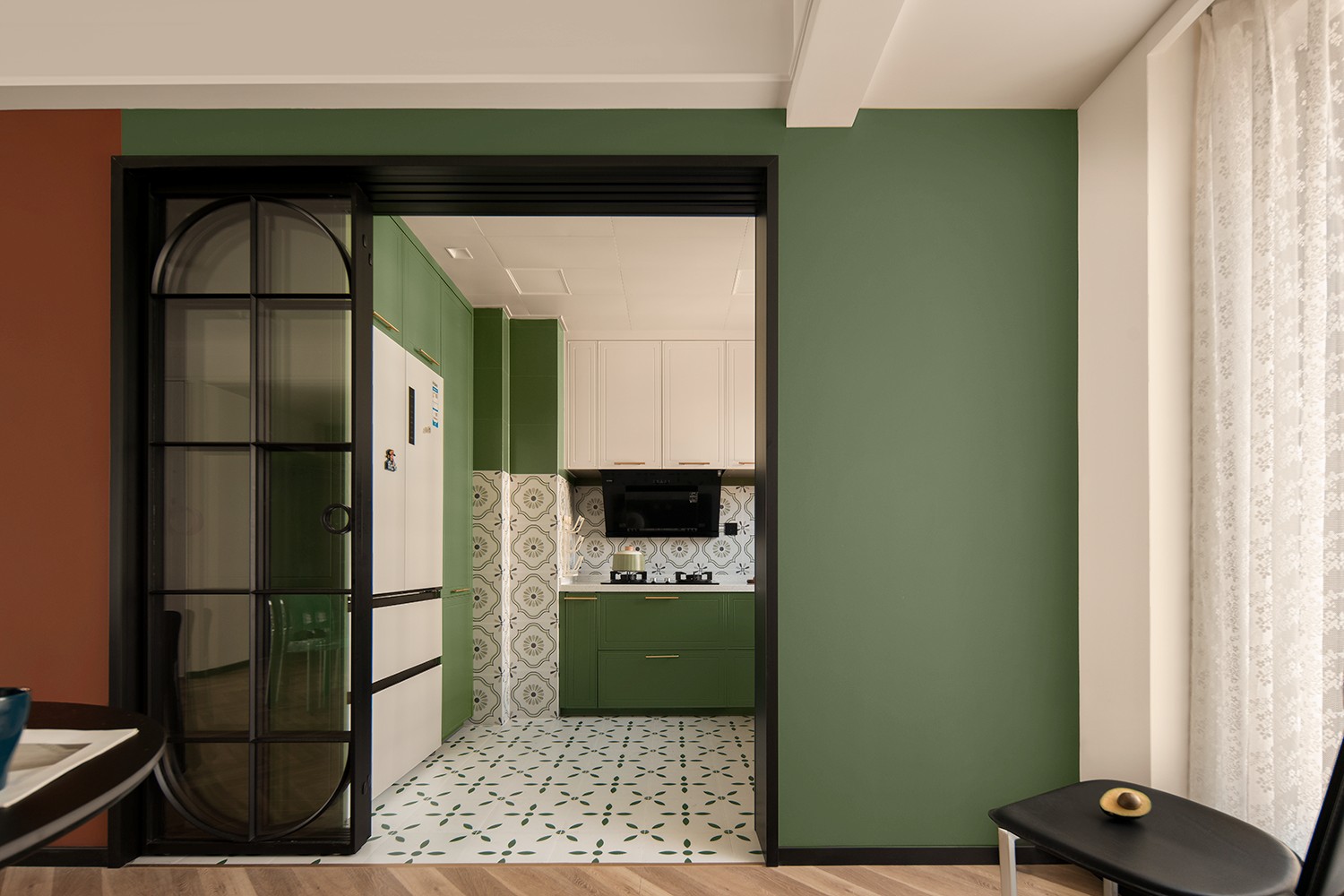 朱红色与墨绿色相互碰撞,古典的拱门造型,带有浓郁的宫廷色彩,又富含感性,优雅的格调带着真实的古朴和原味的典雅。