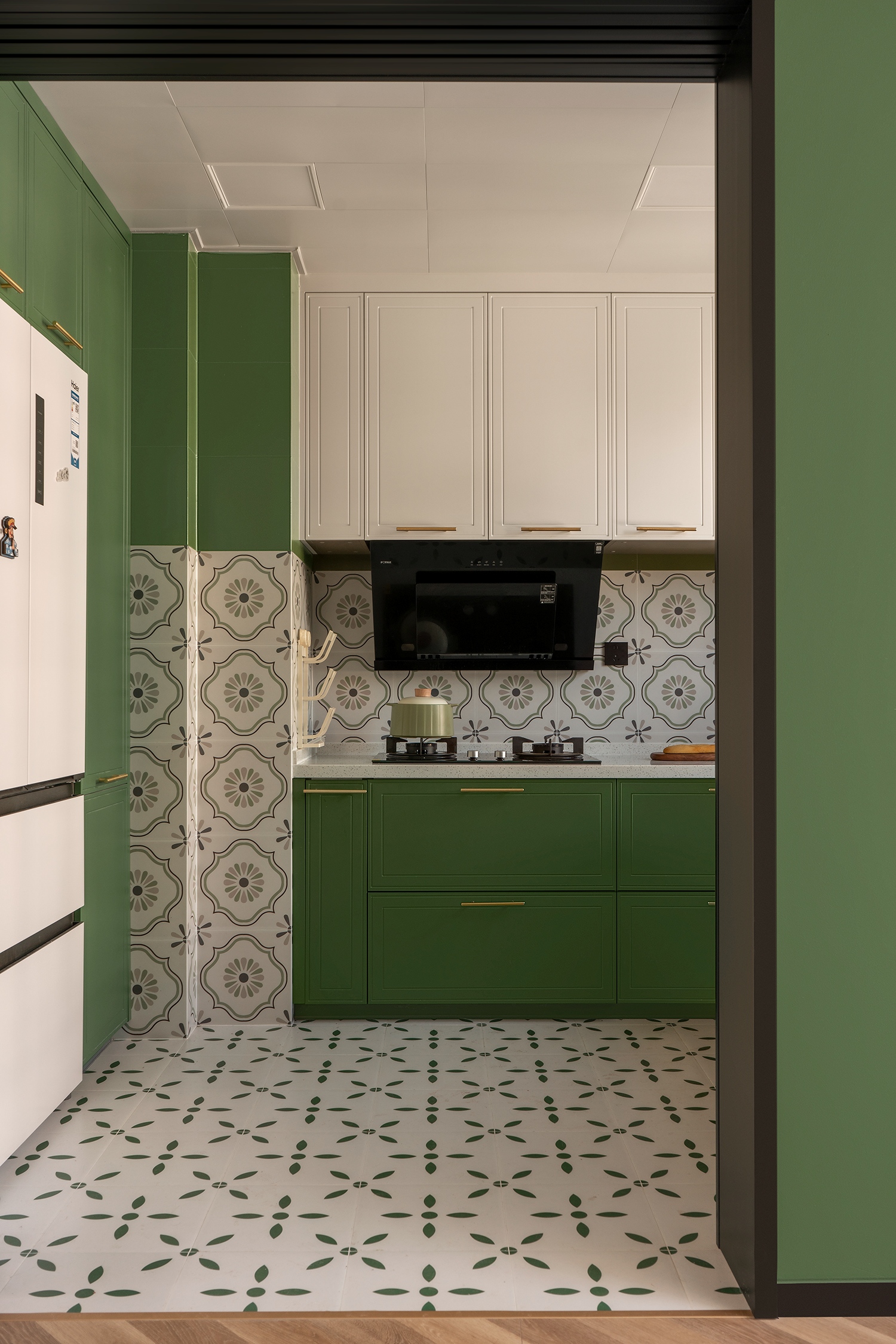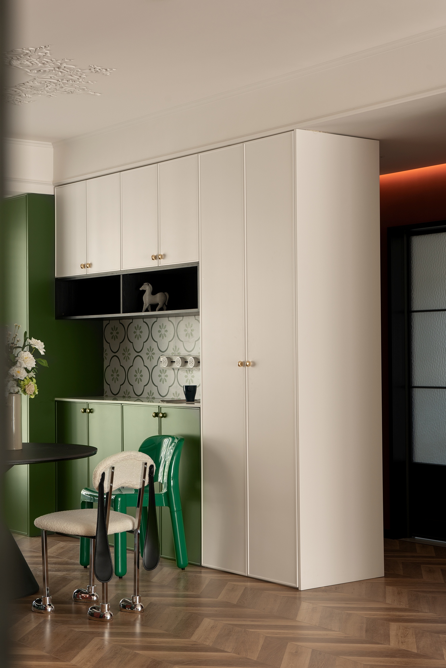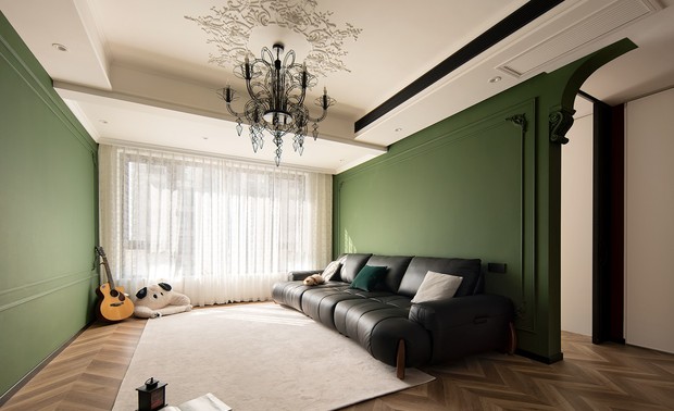 根据风格定位选用木地板通铺,厨房卫生间的小花砖点缀增强视觉感受,厨房联动的推拉门进一步开放入口空间,法式造型的门型呼应整体风格,乳胶漆选用佐敦艺术涂料,更环保,色彩饱和度更高。