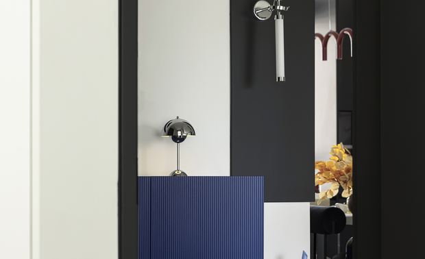 进入主卧玄关以圆弧石膏板承接,用克莱因蓝涂染,跳脱沉闷,为黑白空间注入亮点,营造宁静舒适的睡眠环境。
