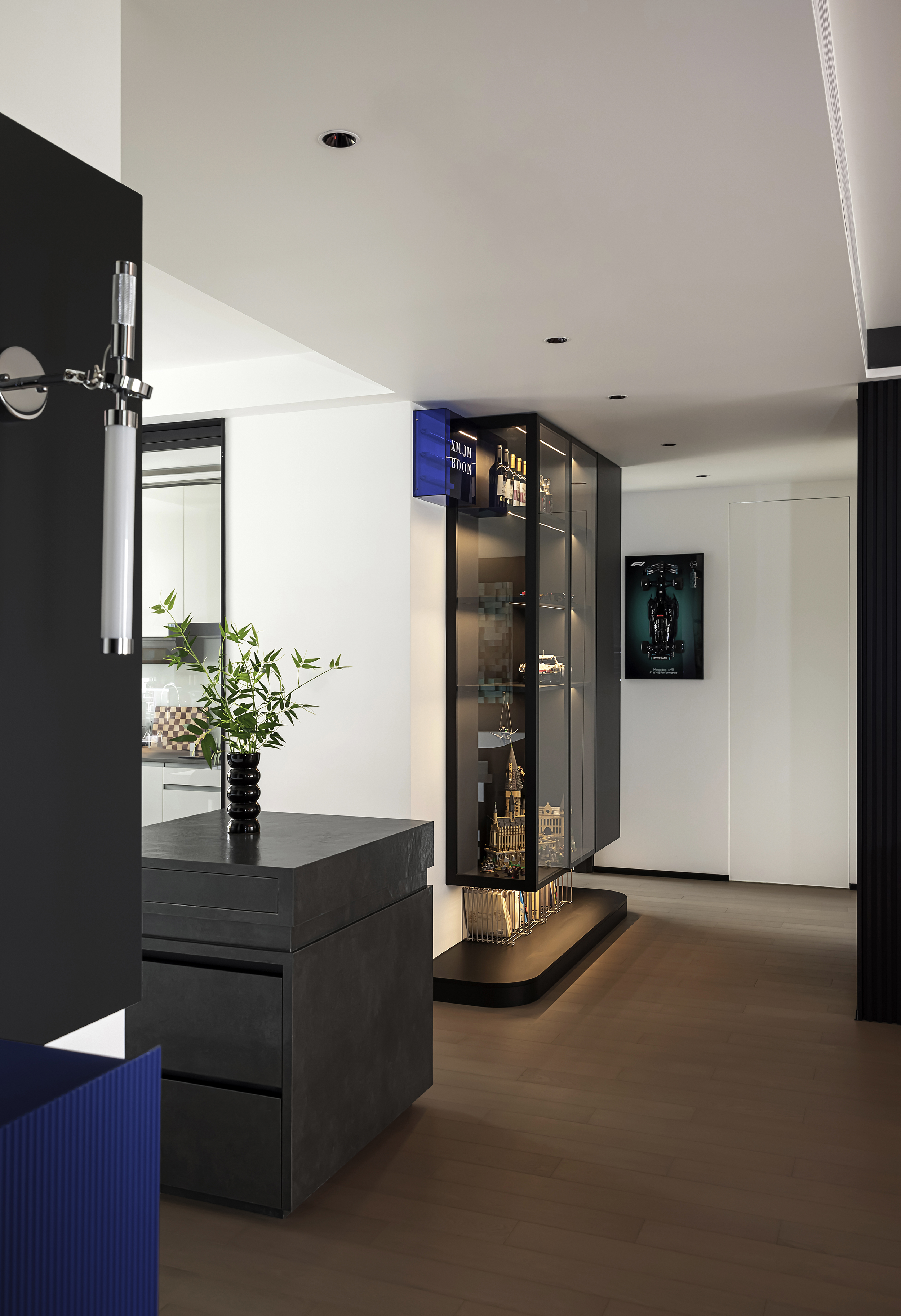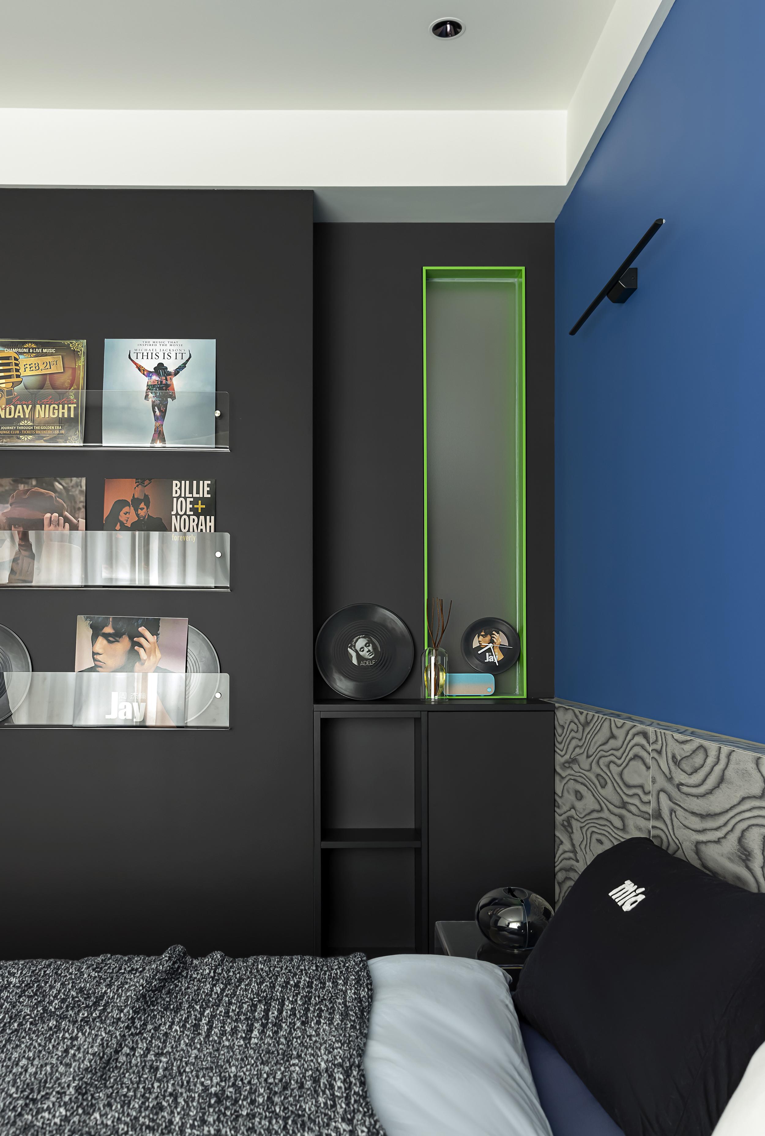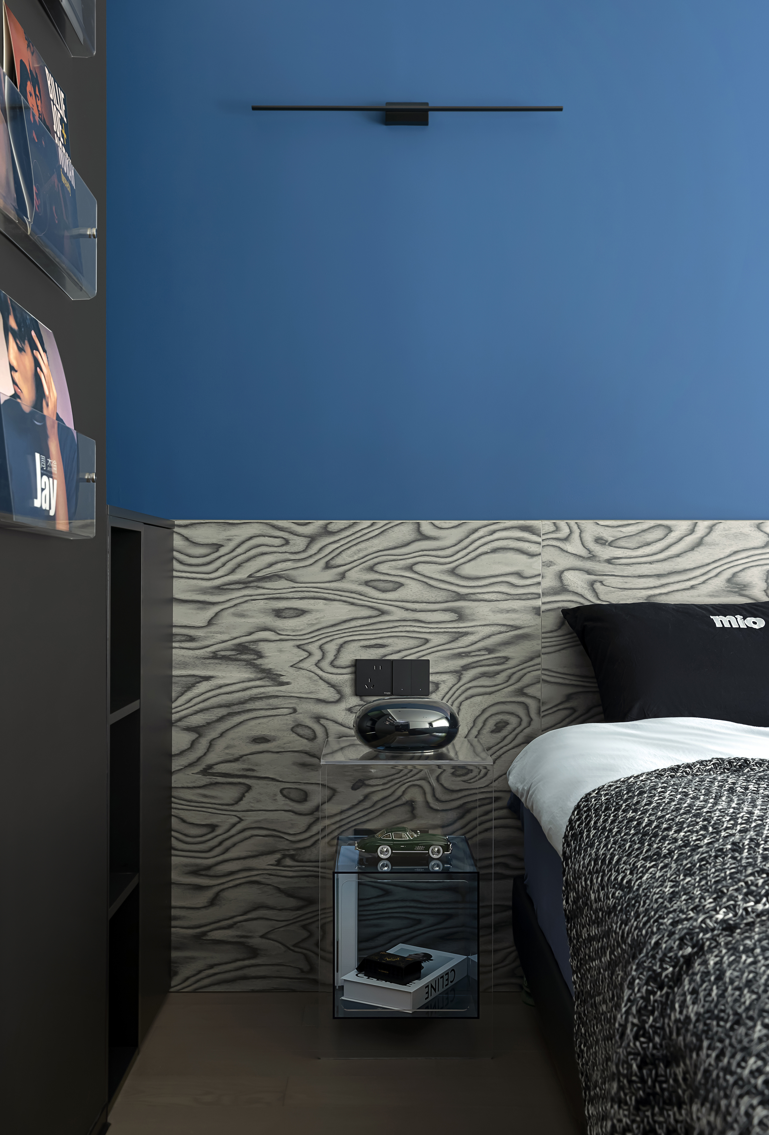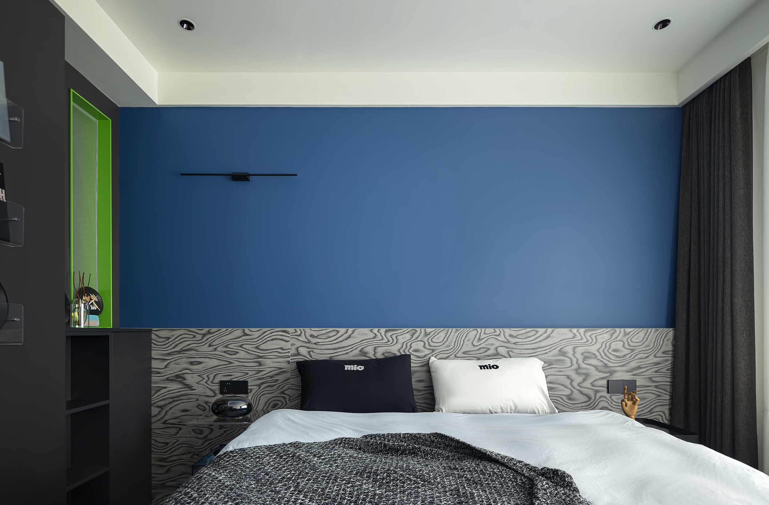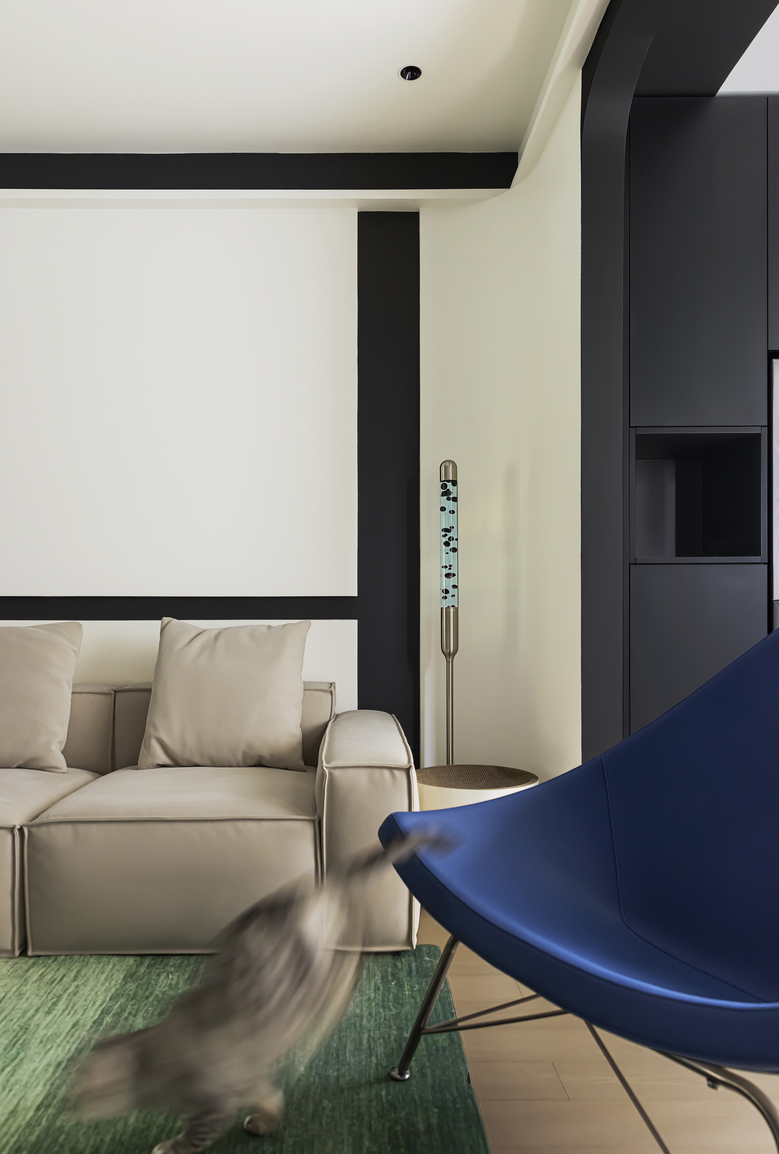 黑白主义与克莱因蓝柜椅不规则点缀,既保持简约基调,又注入视觉焦点。