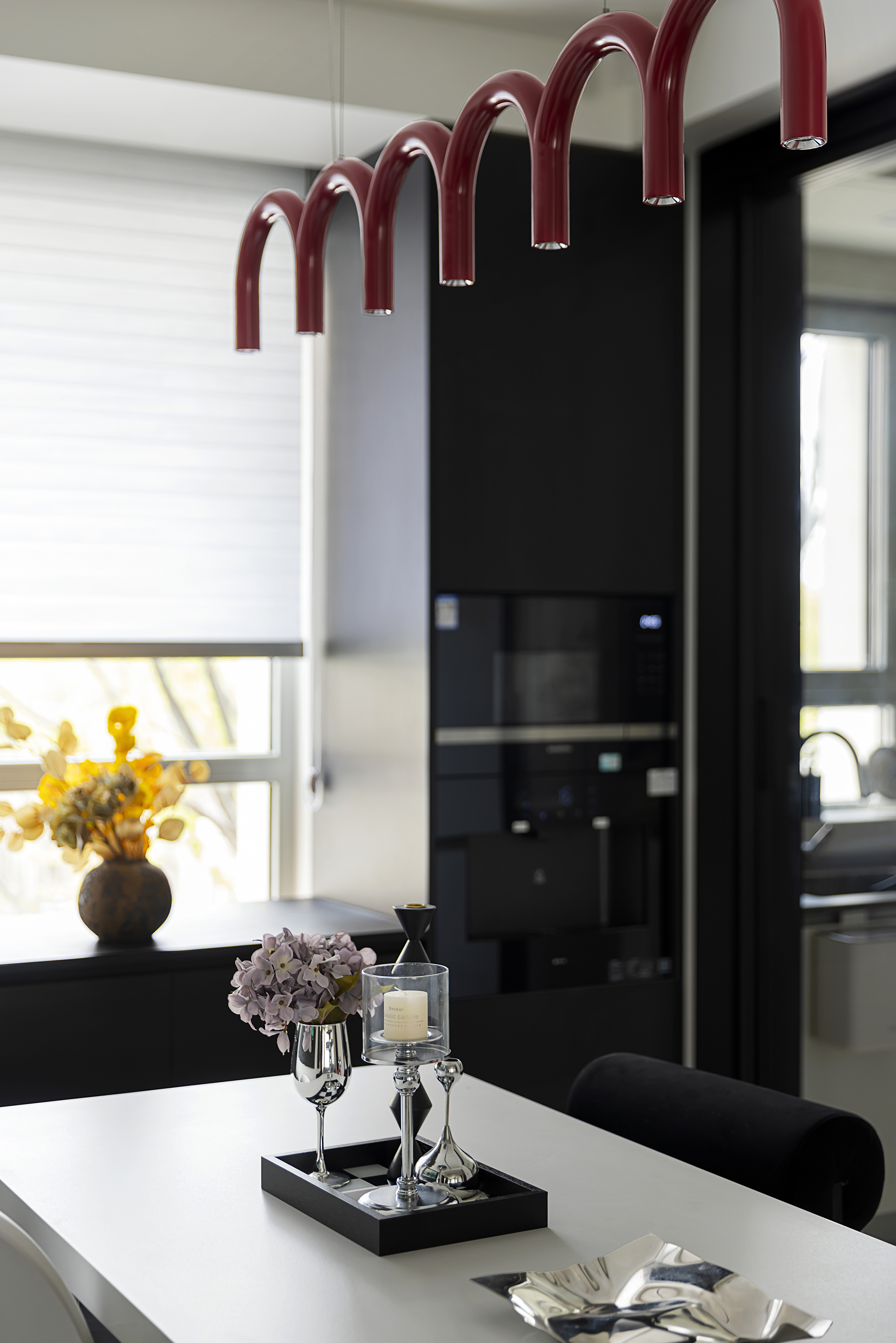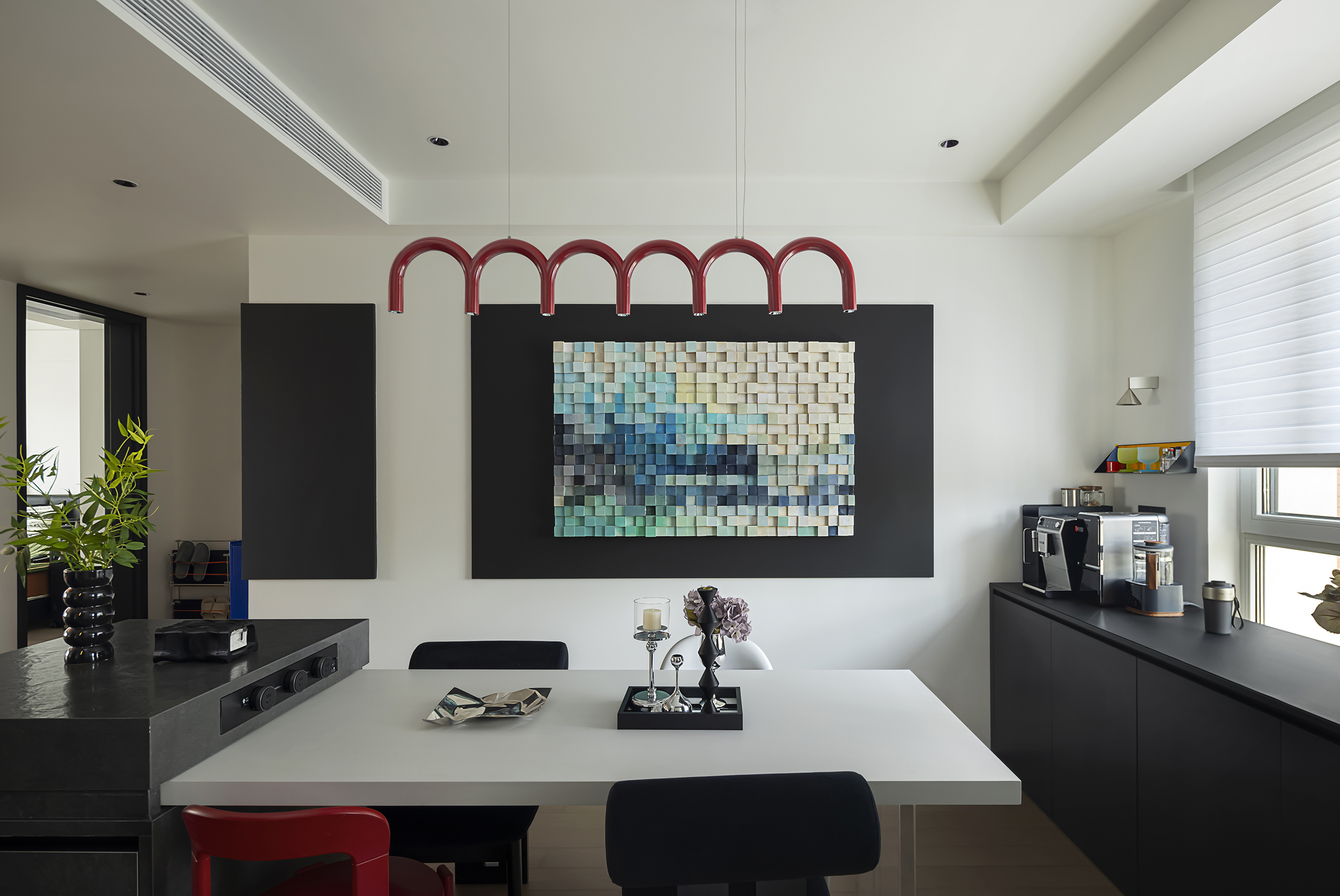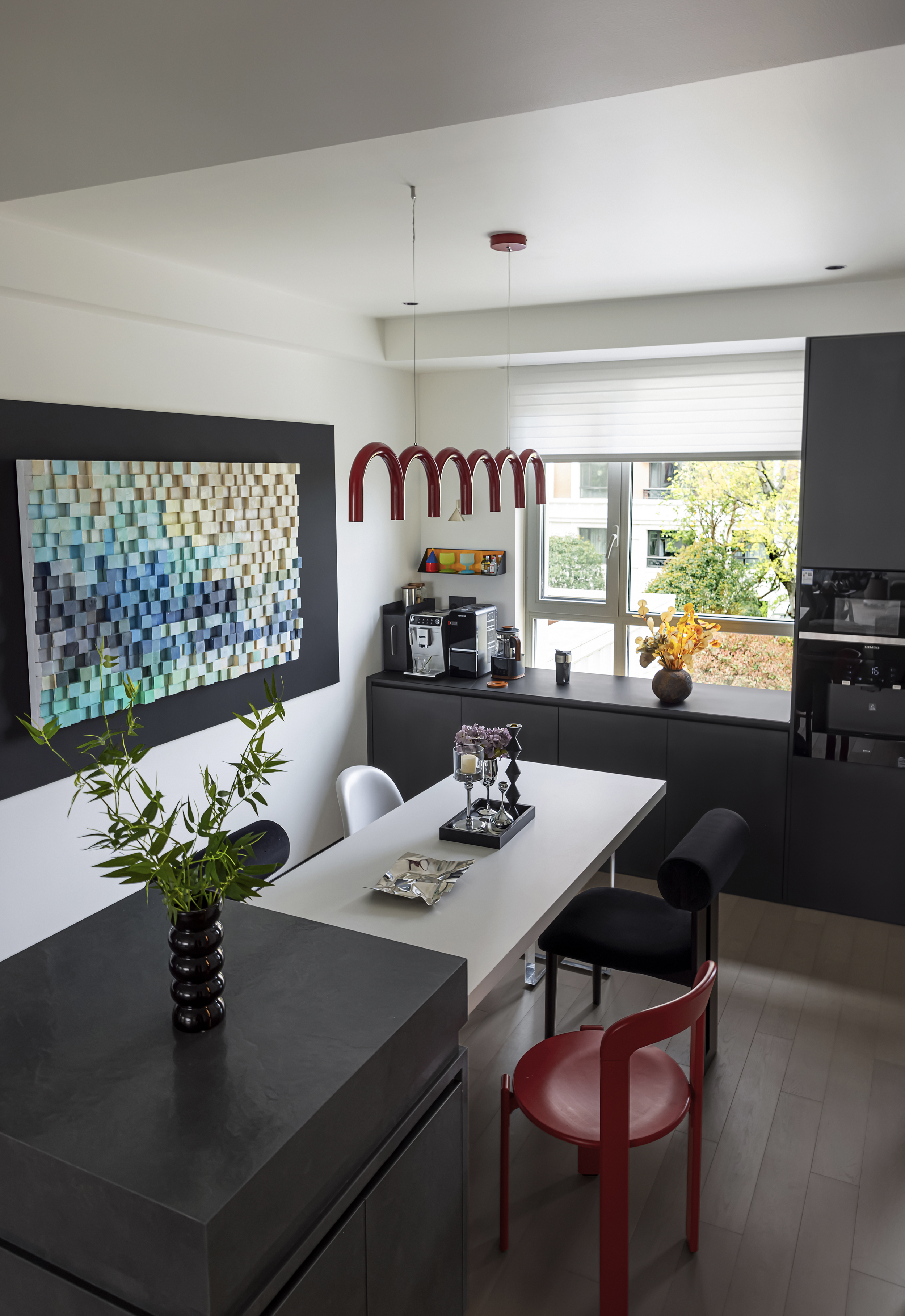 台面与柜体选用黑色岩板与烤漆板材,搭配红色金属艺术吊灯、蓝色艺术屏风,材质的冷暖、软硬碰撞,让空间兼具先锋质感与触摸温度 -