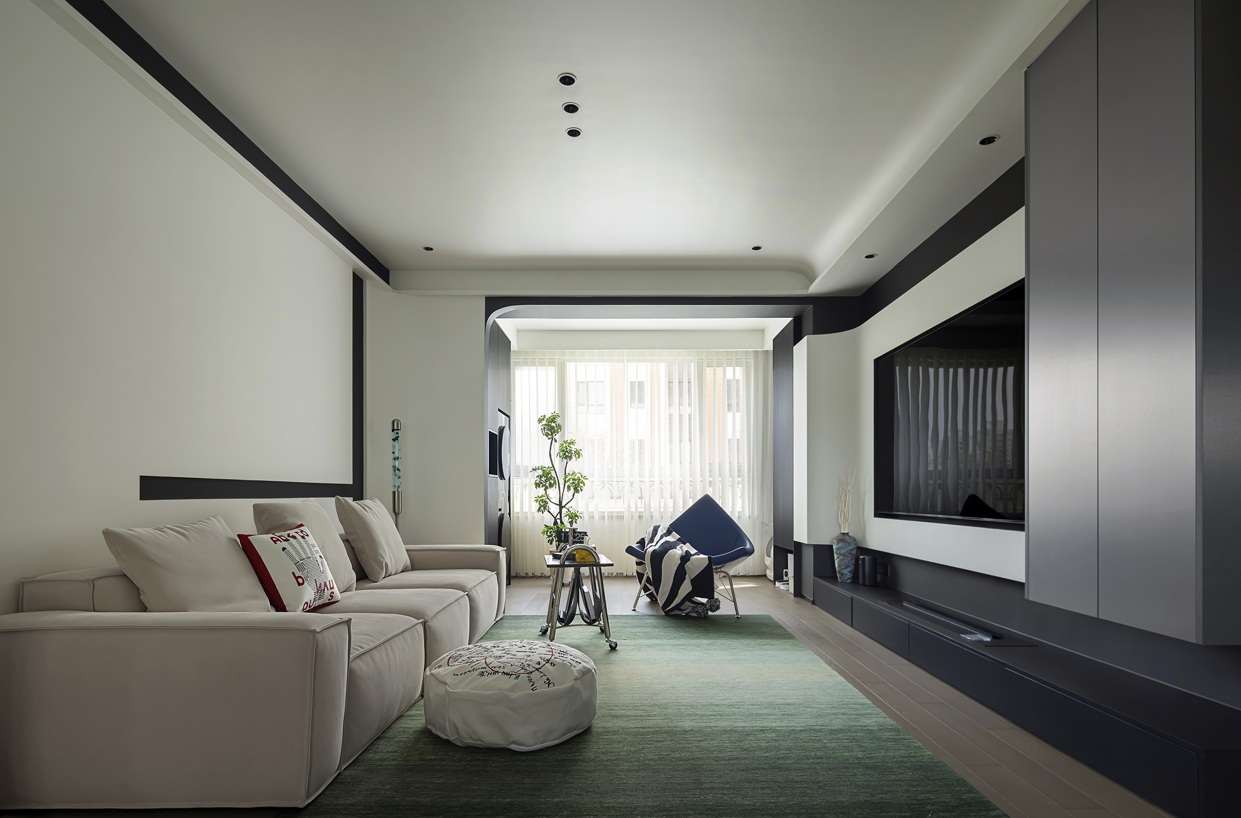宽敞的空间在线条框定之下,呈现沉静之感,米色沙发与森系地毯更添几分幽静。