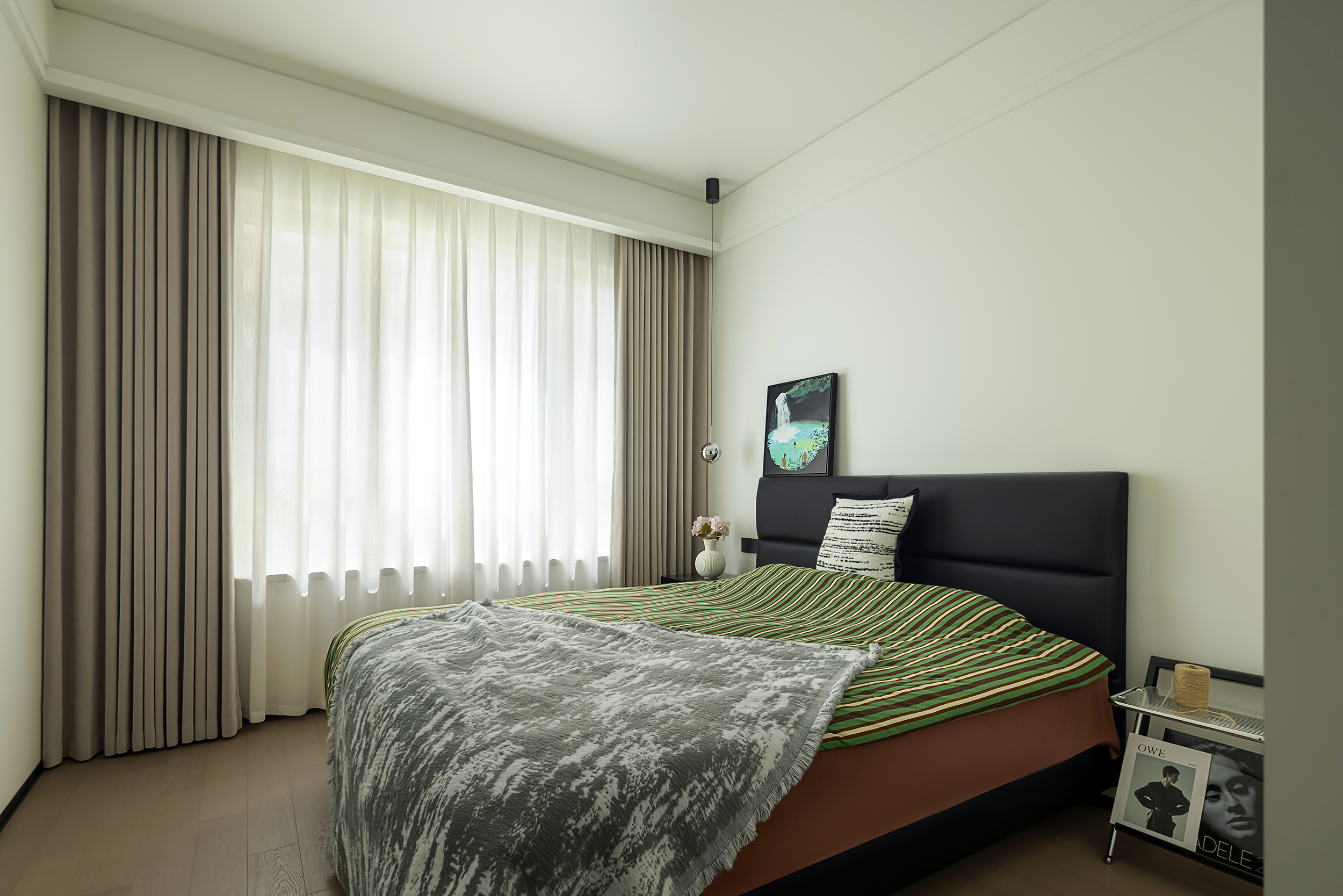 设计选材:地面选用浅灰色橡木实木地板,温润木质感中和冷硬基调