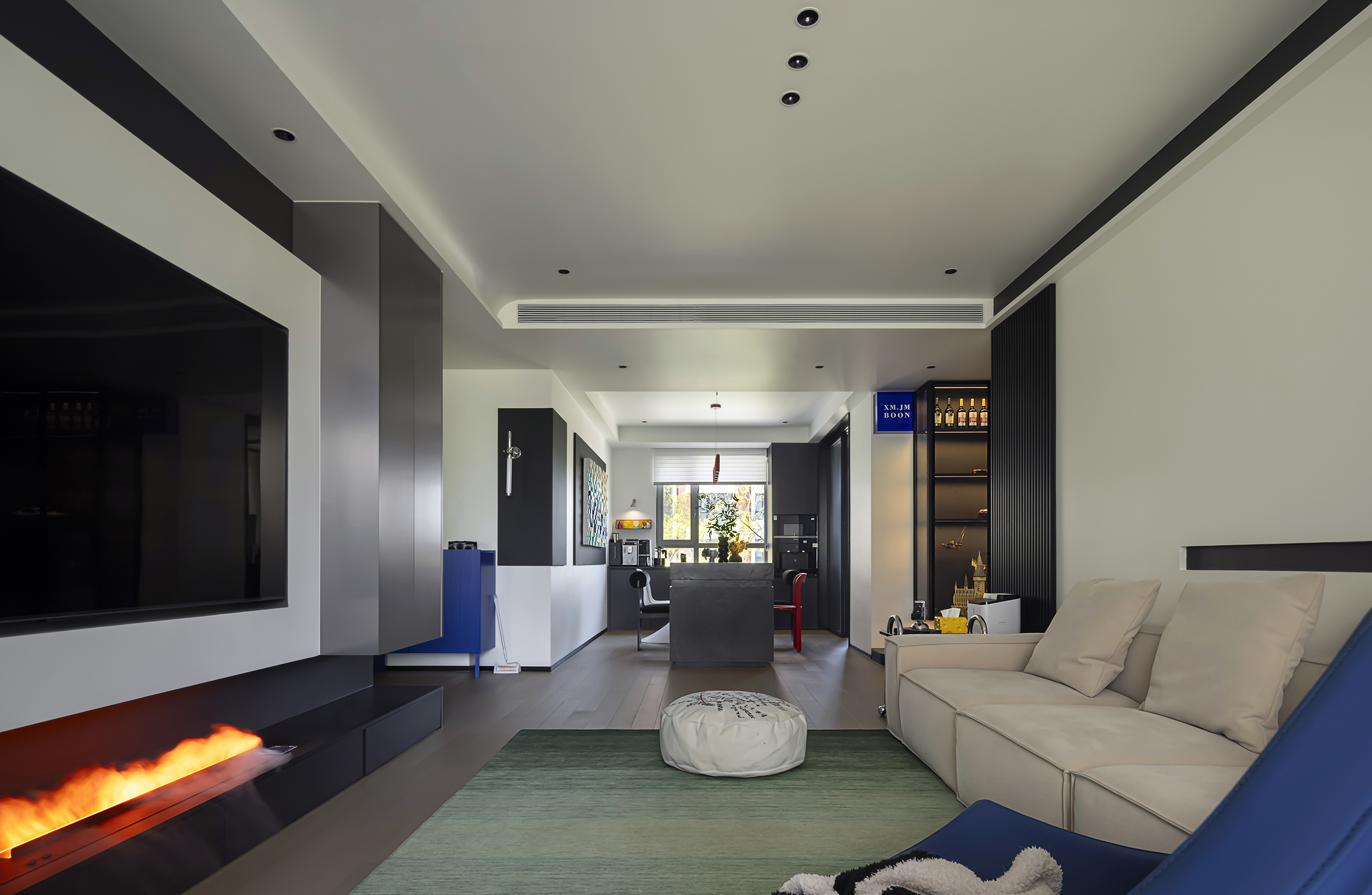 空间意境:1、客厅以悬浮壁炉、模块化沙发打造松弛的社交休闲场景,蓝绿软装与黑白基底形成视觉张力