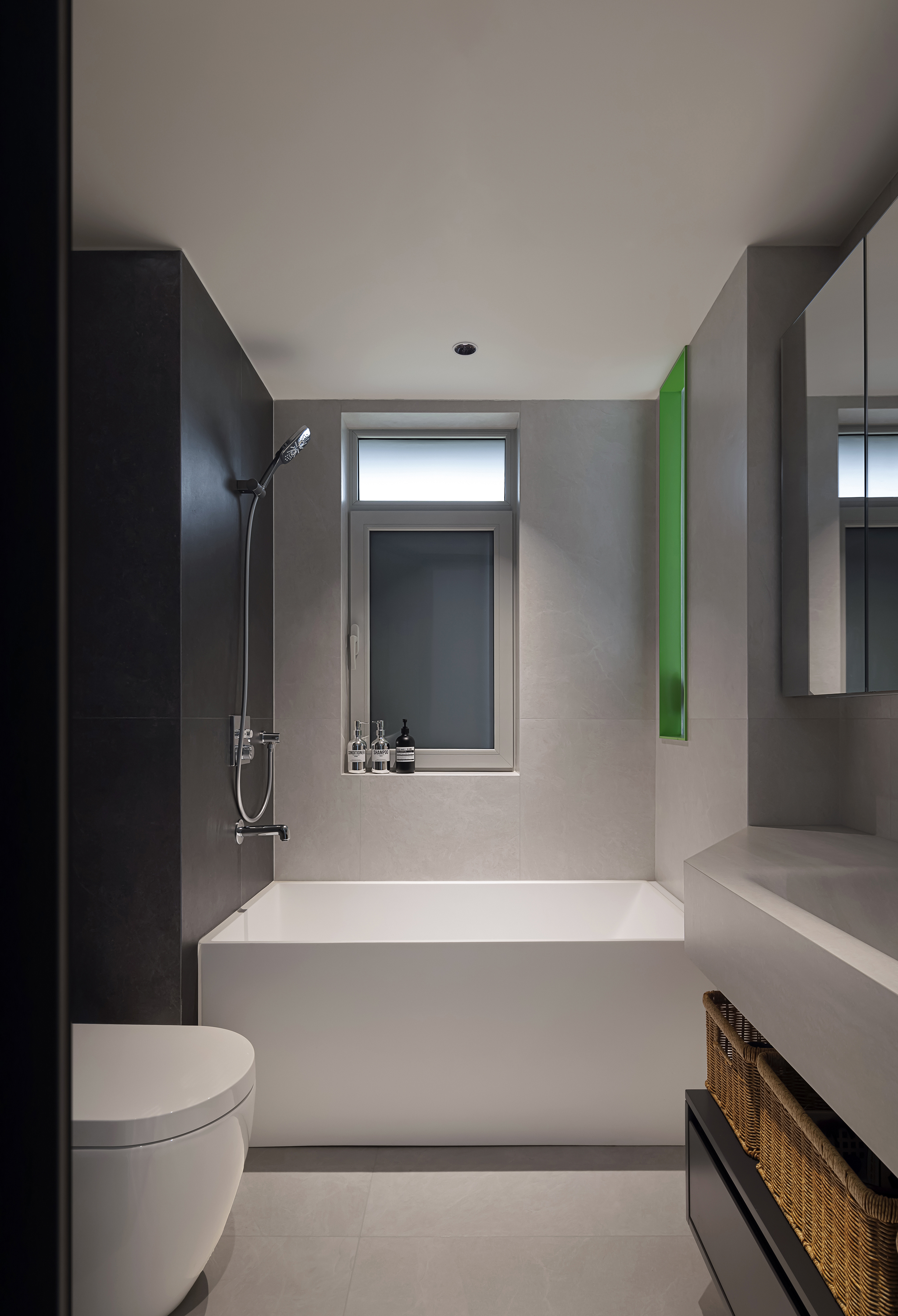 浴室常规的黑白灰搭配,简约中透露高级格调。浴缸贴合墙面尺寸,放大空间视觉,享受惬意时刻。绿色磨砂玻璃隔断卧室,突破格局束缚,彰显年轻主义。