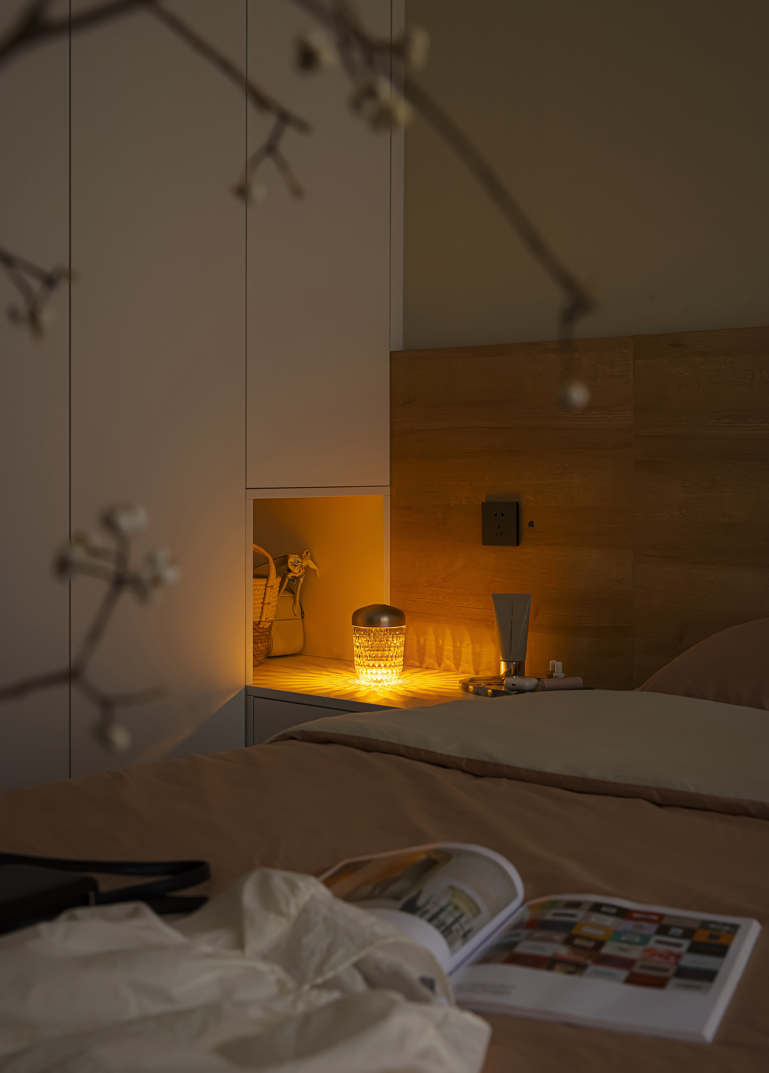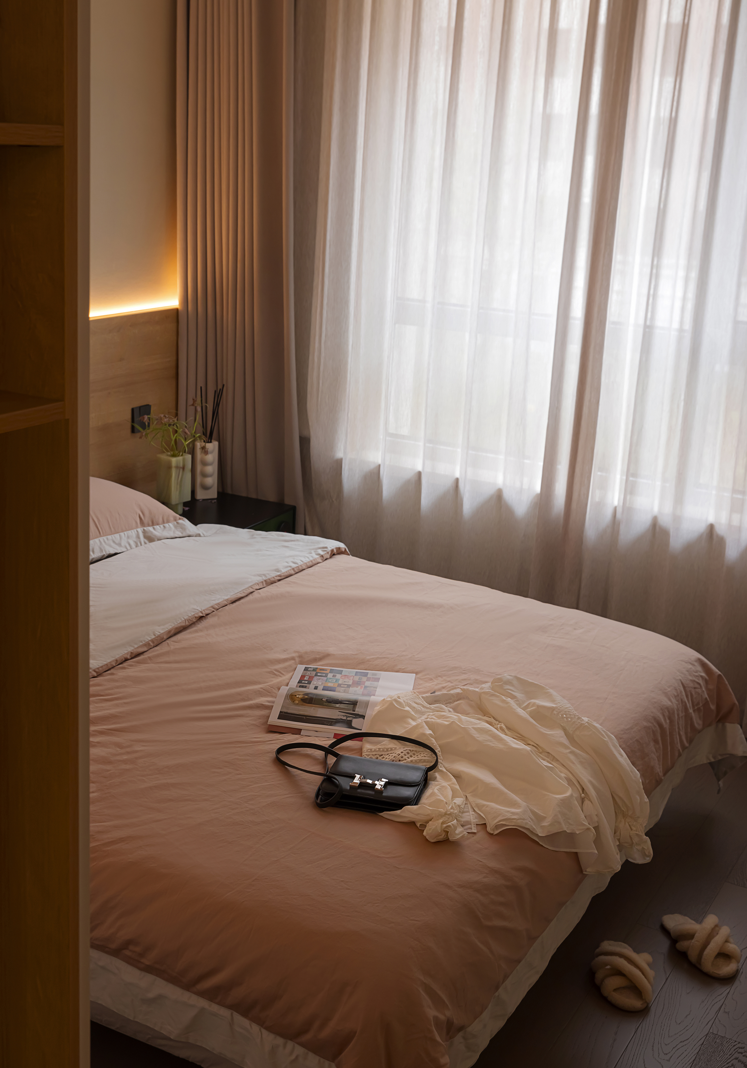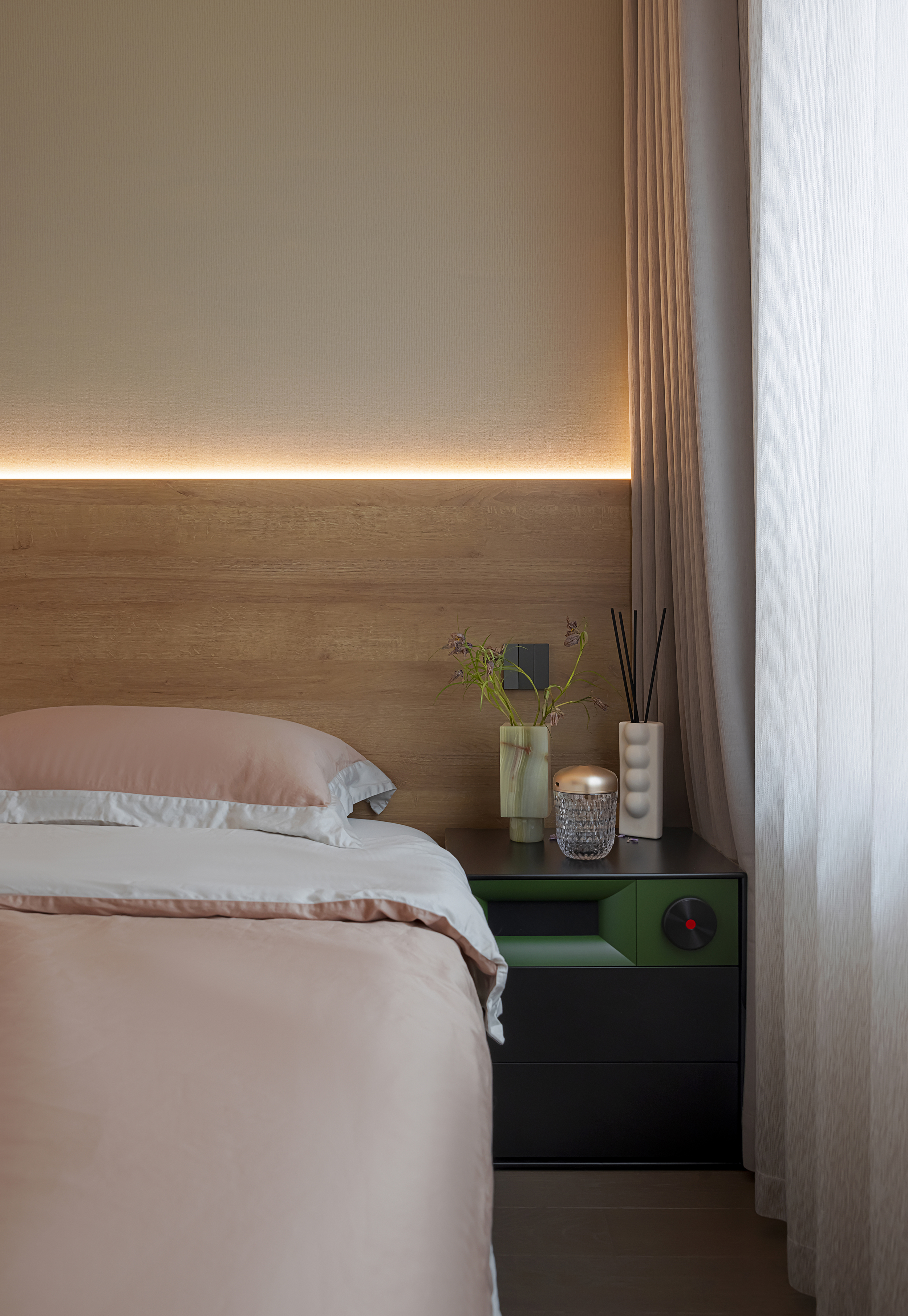 3、卧室以木饰面背景墙搭配柔和床品,打造静谧的休憩场景