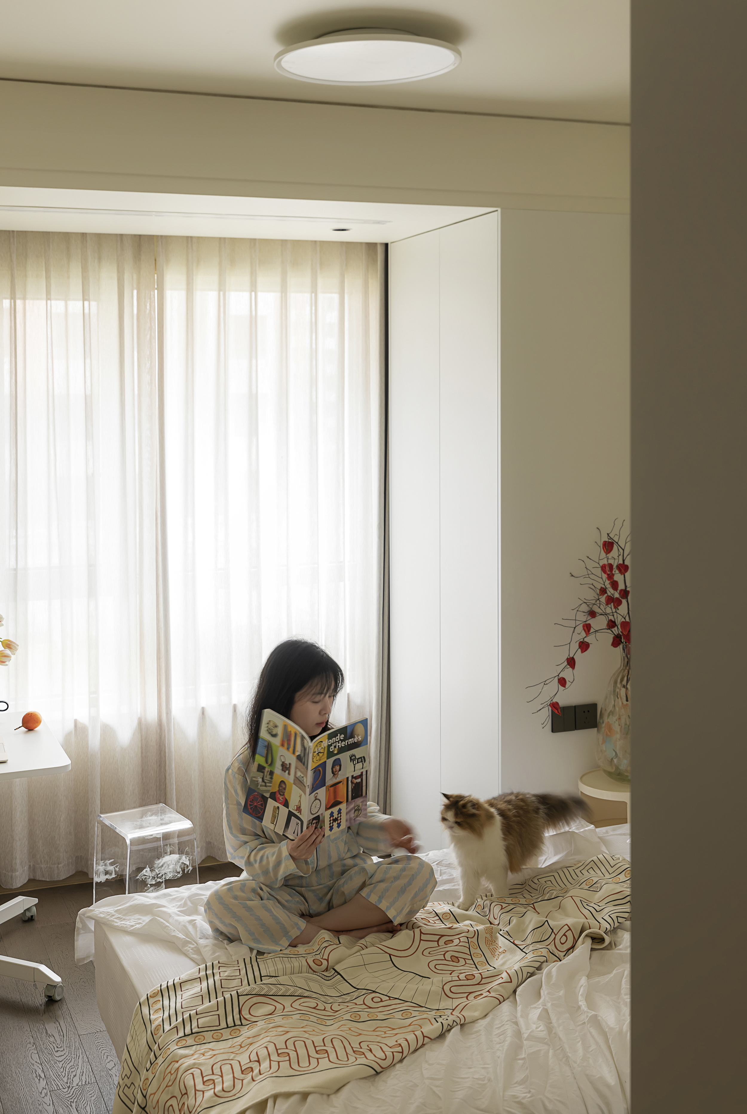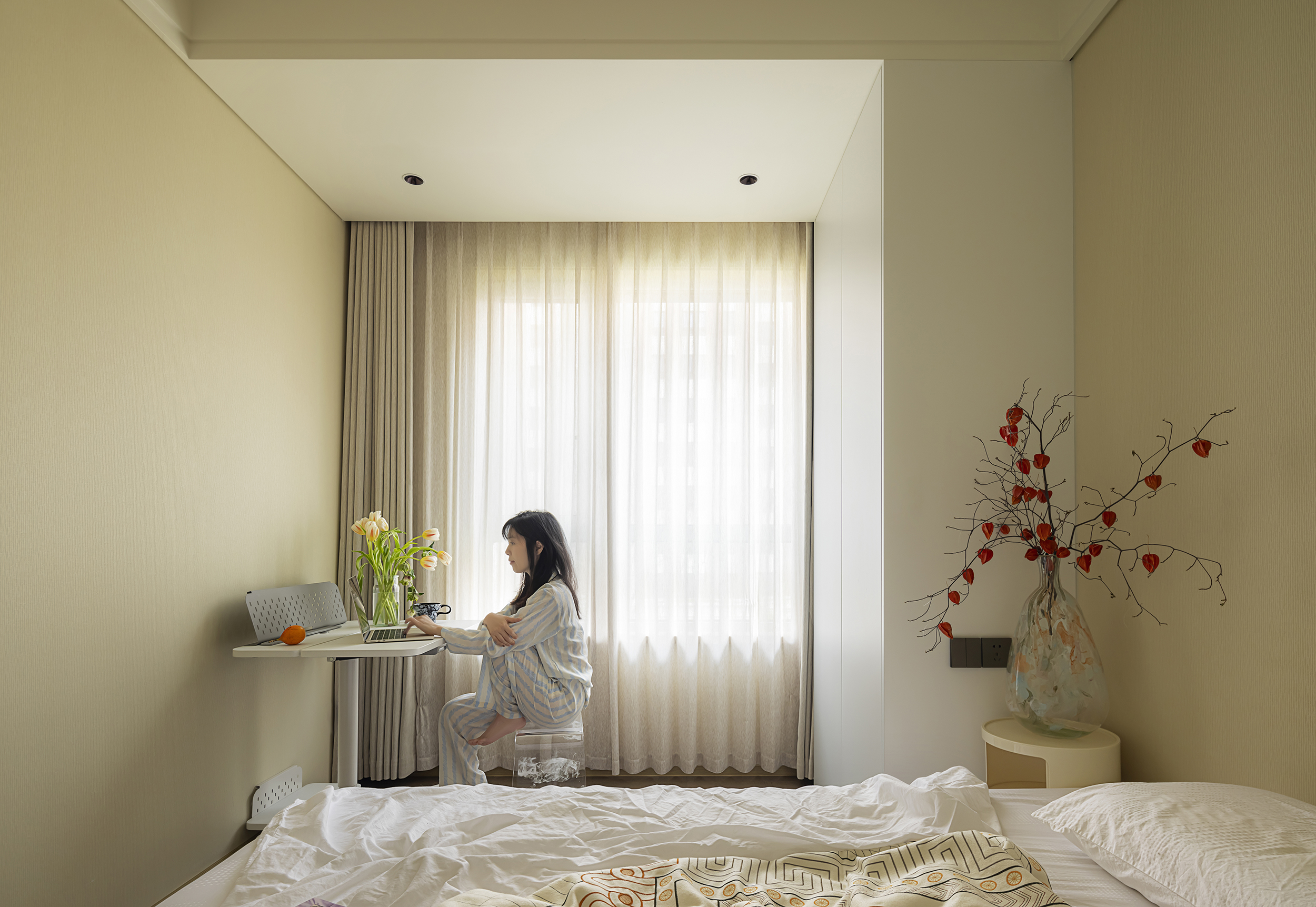 次卧减少了细碎的线条,在水平和竖直的层叠构件中营造空间透视感。