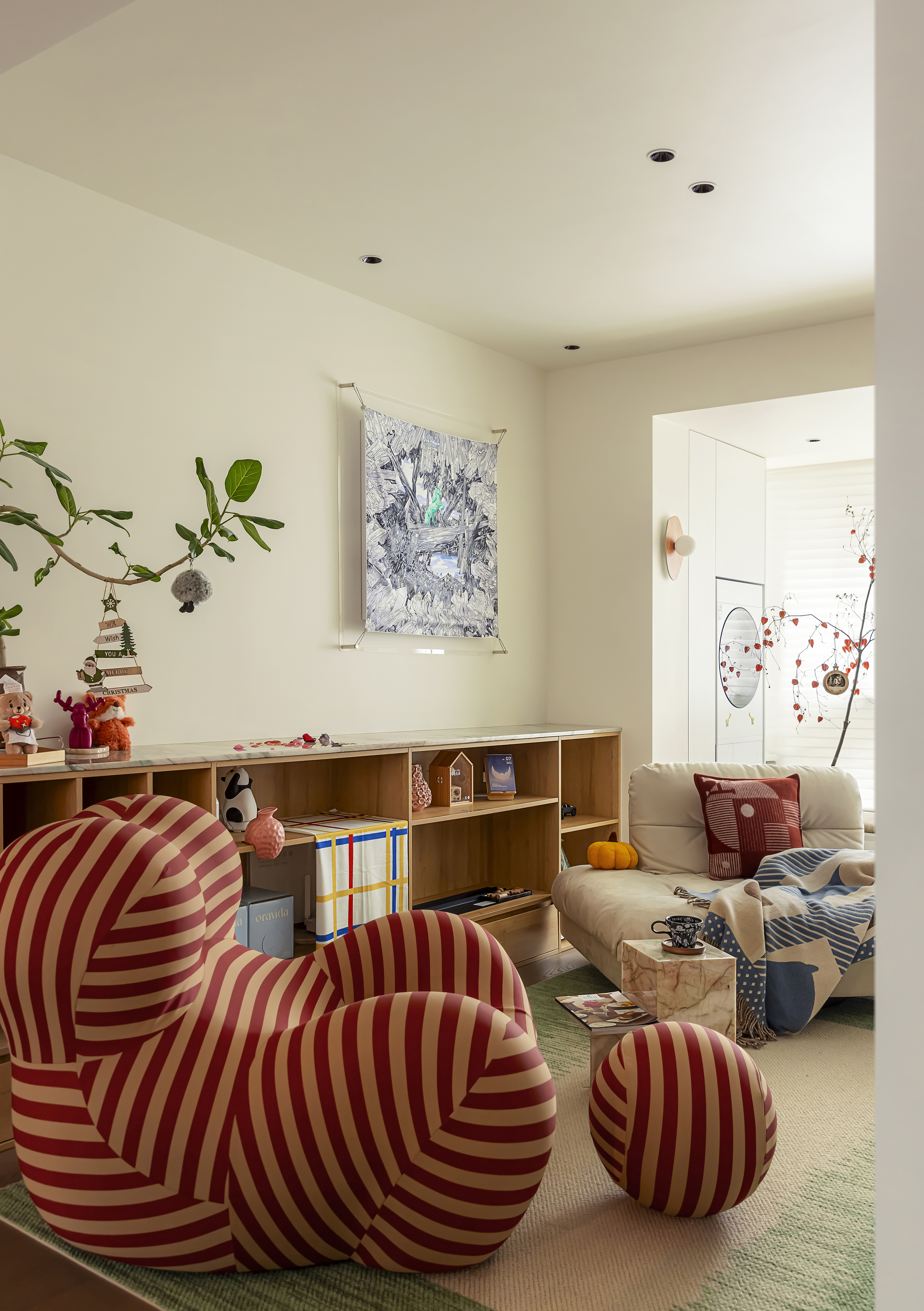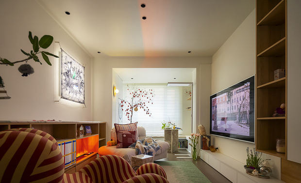 空间意境:1、客厅以柔质沙发、条纹懒人椅构建慵懒的休闲场景,绿植与艺术挂画柔化空间氛围