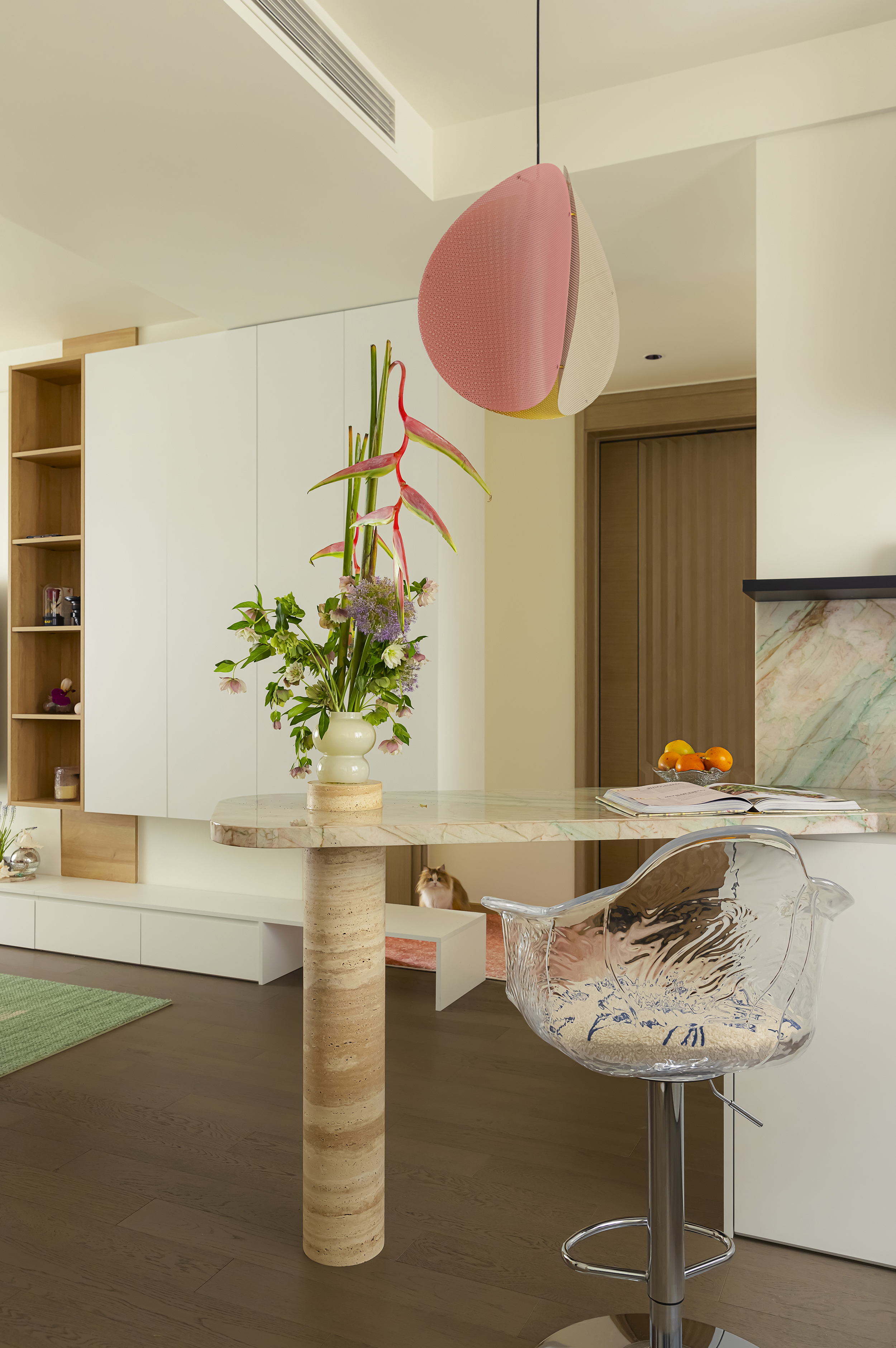 2、餐厨区用大理石吧台、艺术吊灯营造“轻食+社交”的惬意场景