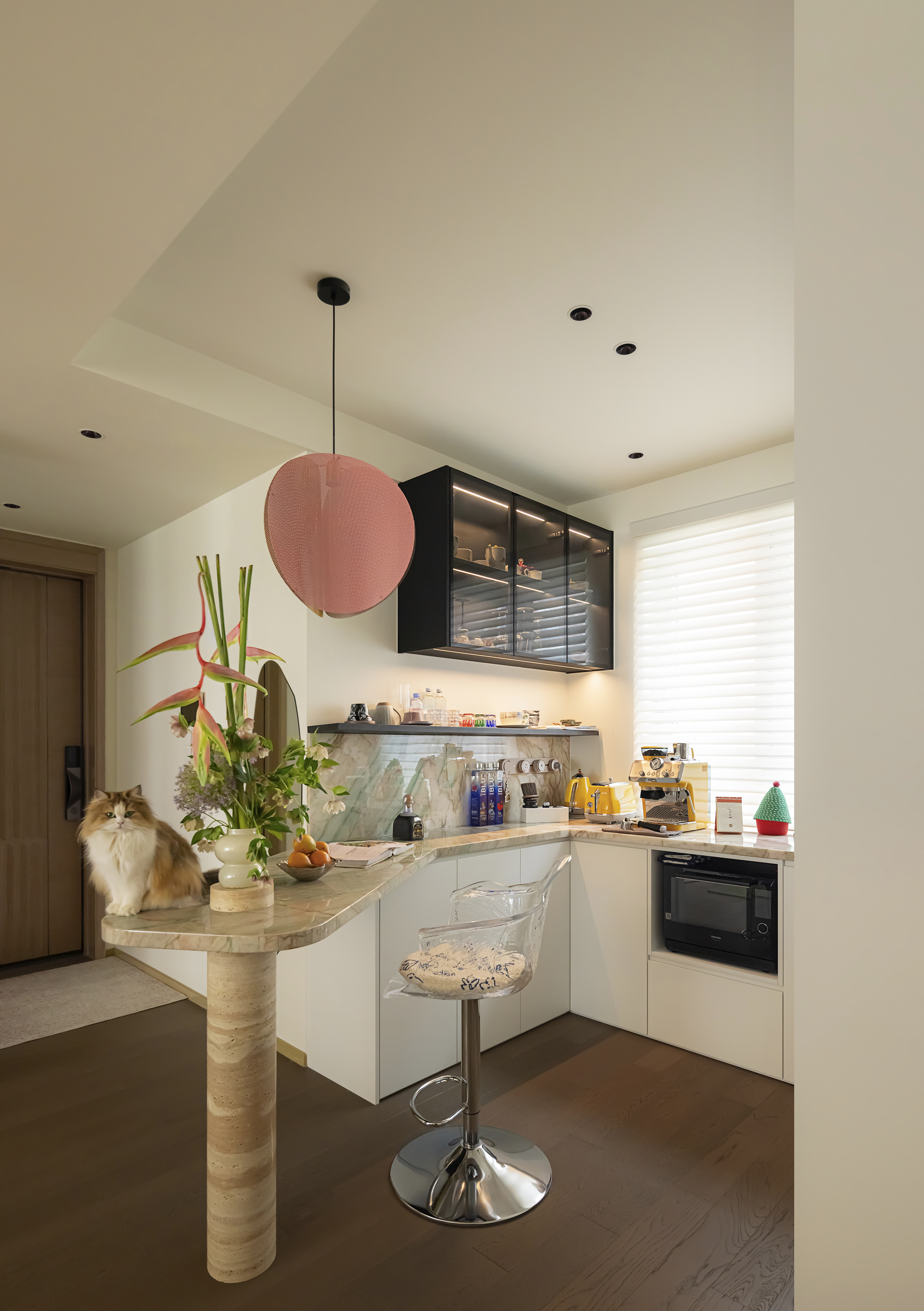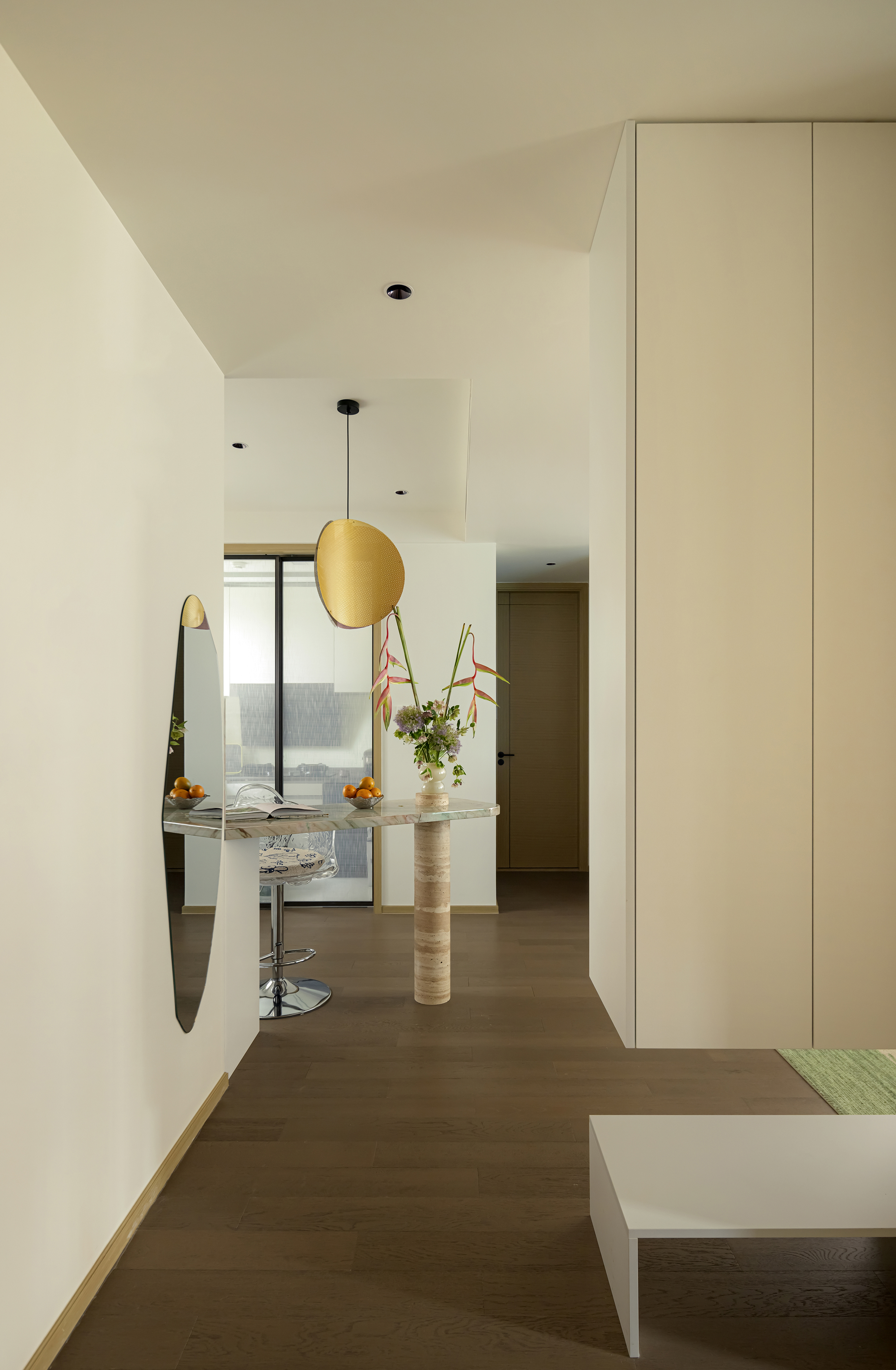入户区以柜体与吧台形成过渡,整体动线流畅,既适配家人互动,又保留了个人独处的空间。