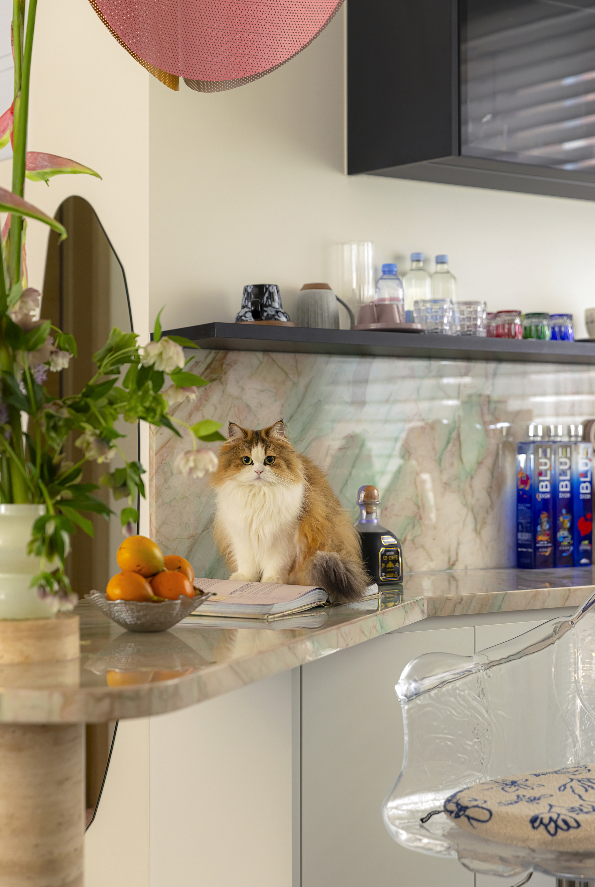 悬挂丹麦PWtbS半人马座行星吊灯,犹如维纳斯神秘的面纱,光影舒适又柔和。吧台绿植摇曳生姿,肆意朝阳,二者相互映衬,自然共生。